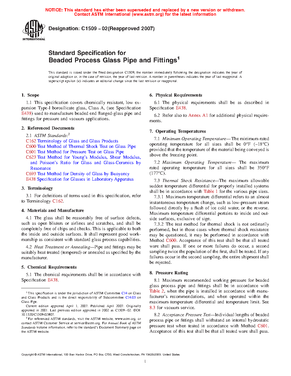 This specification covers chemically resistant, low expansion borosilicate glasses (Type I, Class A) used to manufacture beaded and end flanged-glass pipes and fittings for pressure and vacuum applications. Both the inside and outside surfaces of the glass shall be reasonably free of surface defects, such as open blisters or airlines and scratches, and shall be completely free of chips and checks. Pipe and fittings may be suitably heat treated (tempered) or annealed as specified by the manufacturer. Products should adhere to chemical, physical, and dimensional requirements, as well as minimum and maximum operating temperature, thermal shock resistance, and pressure ratings.