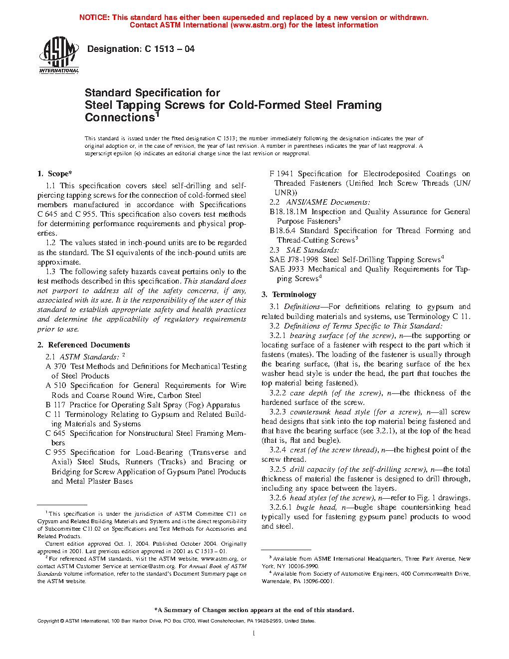 This specification covers steel self-drilling and self-piercing tapping screws for the connection of cold-formed steel members manufactured. This specification also covers test methods for determining performance requirements such as dimension, and total case depth; and physical properties such as hardness, ductility, torsional strength, drill drive performance, and self-drilling tapping screw drill capacity.