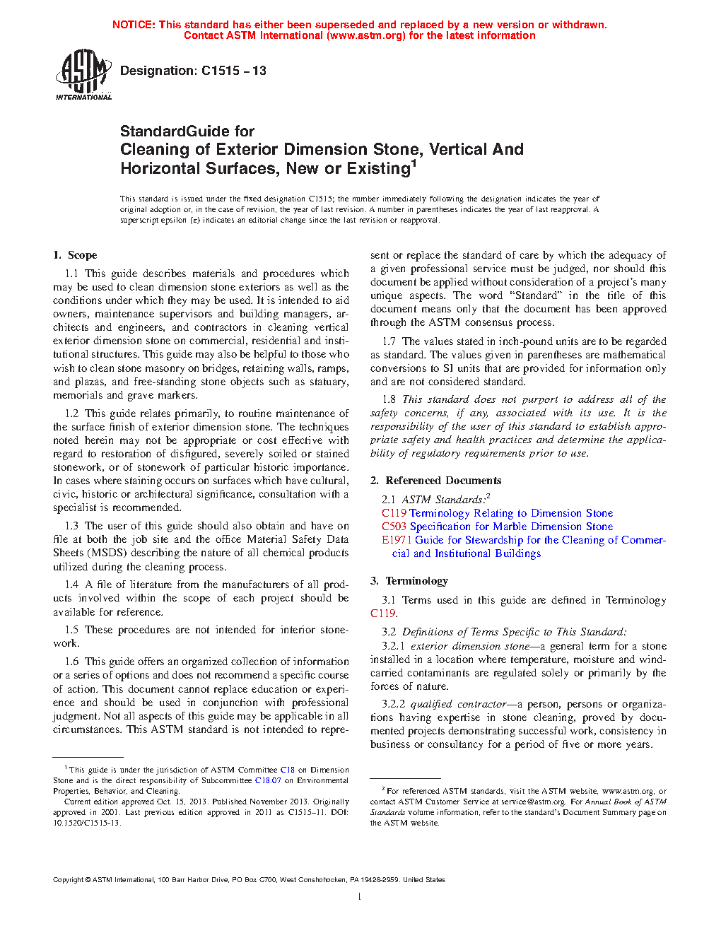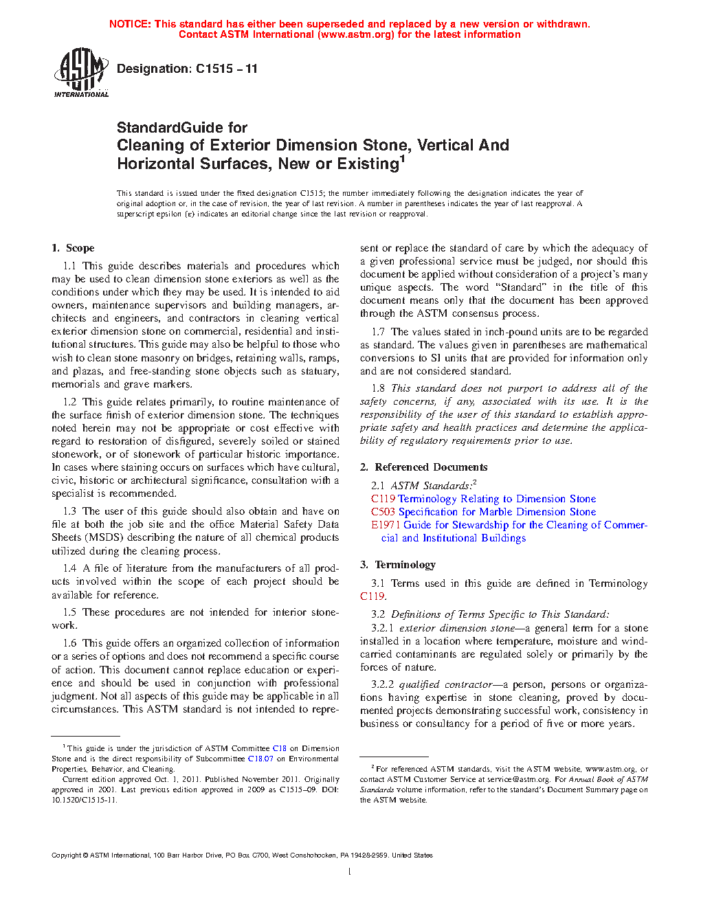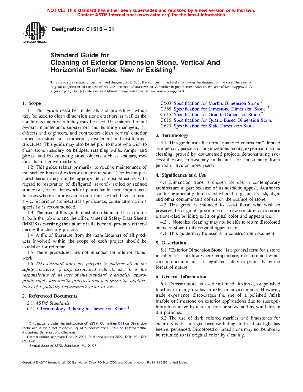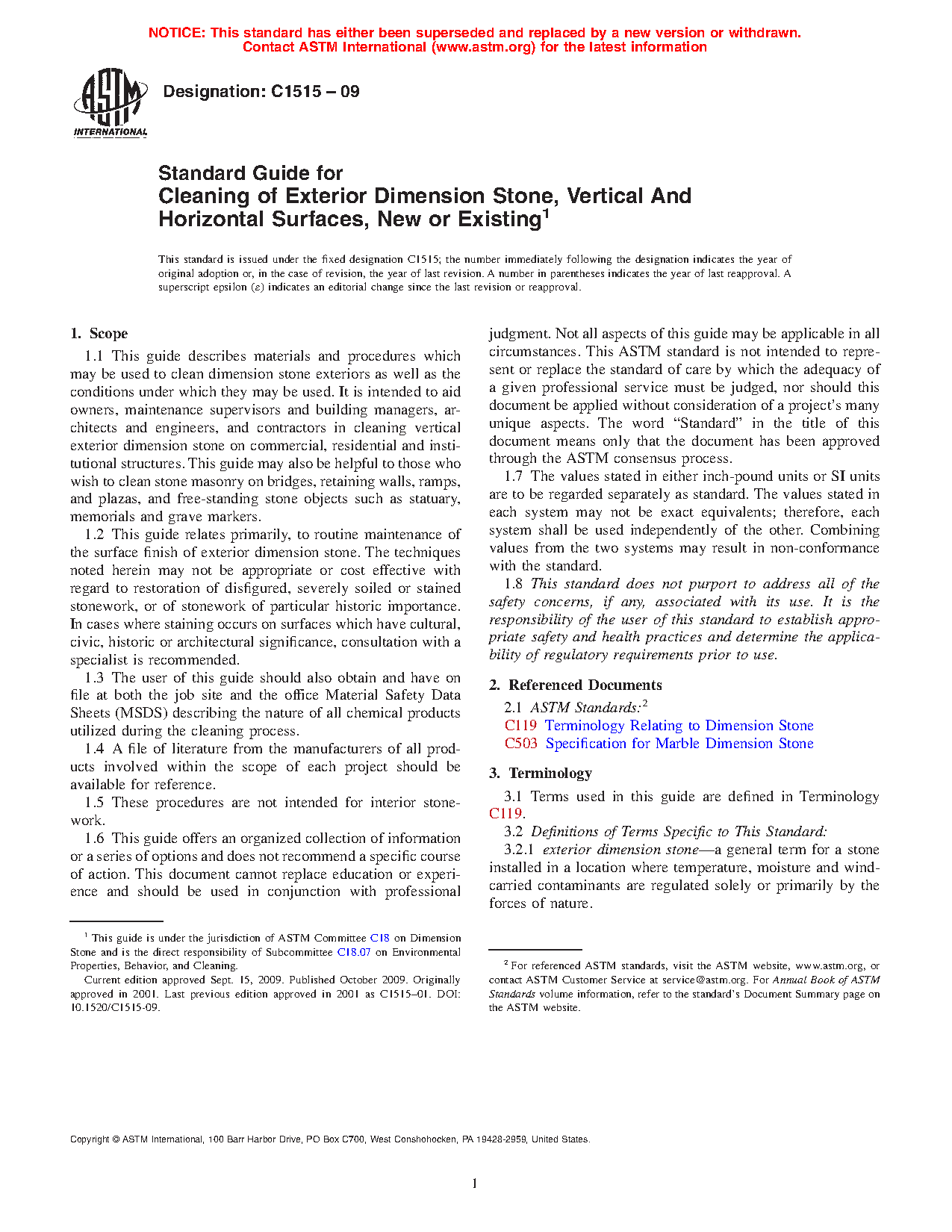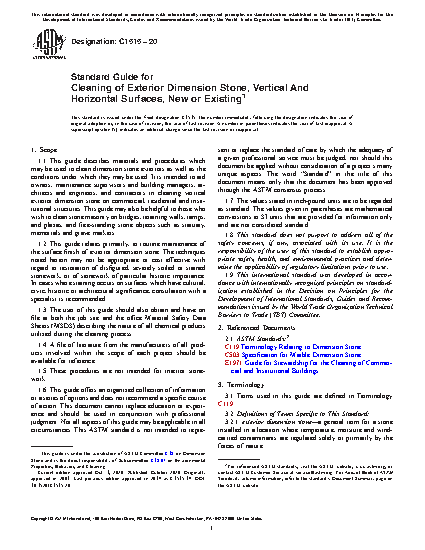 1.1 This guide describes materials and procedures which may be used to clean dimension stone exteriors as well as the conditions under which they may be used. It is intended to aid owners, maintenance supervisors and building managers, architects and engineers, and contractors clean vertical exterior dimension stone on commercial, residential and institutional structures. This guide may also be helpful to those who wish to clean stone masonry on bridges, retaining walls, ramps, and plazas, and free-standing stone objects such as statuary, memorials and grave markers.