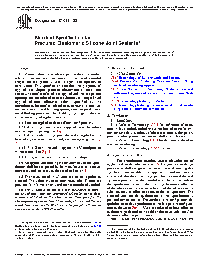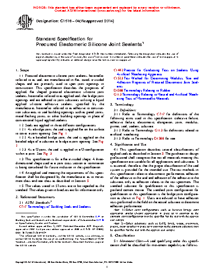 This specification describes the properties of applied, flat shaped precured elastomeric silicone joint sealants that bridge joint openings and are adhered to joint substrates utilizing a liquid applied silicone adhesive sealant to seal building openings such as panel joints, metal flashing joints, or other building openings in place of conventional liquid applied sealants. Seals are applied in three different configurations, as follows: as a bridge joint, the seal is applied flat on the surface to cover a joint opening; as a beveled bridge joint, the seal is applied on the beveled edge of a substrate to bridge a joint opening.; as a U-joint, the seal is applied in a U-configuration within a joint. Seals are classified into Movement Classes on the basis of movement capability, and Tear Class on the basis of tear propagation. Seals should adhere to specified requirements as to stability, color and texture, application, adhesion and cohesion, and movement, modulus, and tear characteristics.