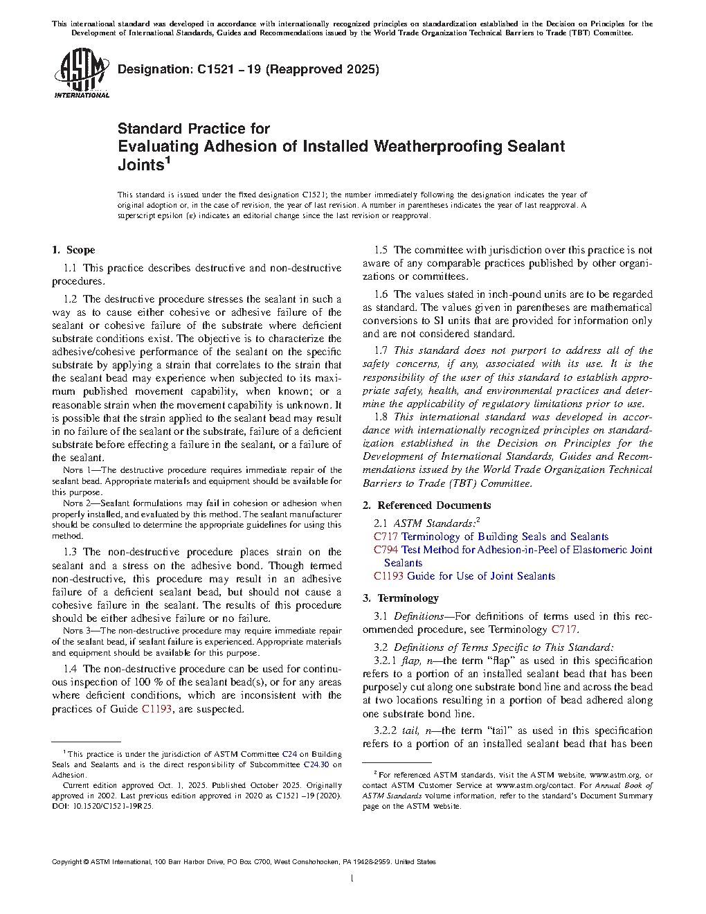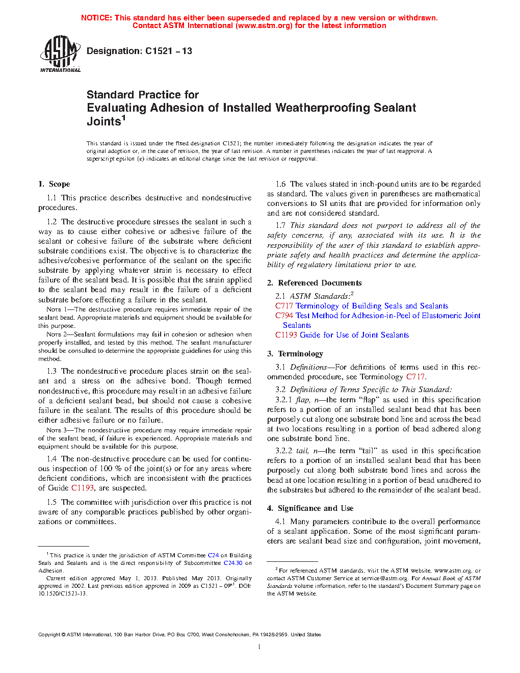 1.3 The nondestructive procedure places strain on the sealant and a stress on the adhesive bond. Though termed nondestructive, this procedure may result in an adhesive failure of a deficient sealant bead, but should not cause a cohesive failure in the sealant. The results of this procedure should be either adhesive failure or no failure.