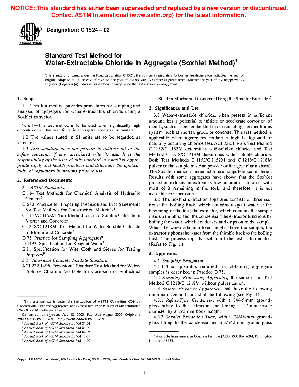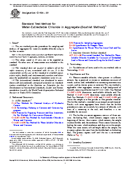 1.1 This test method provides procedures for sampling and analysis of aggregate for water-extractable chloride using a Soxhlet extractor.