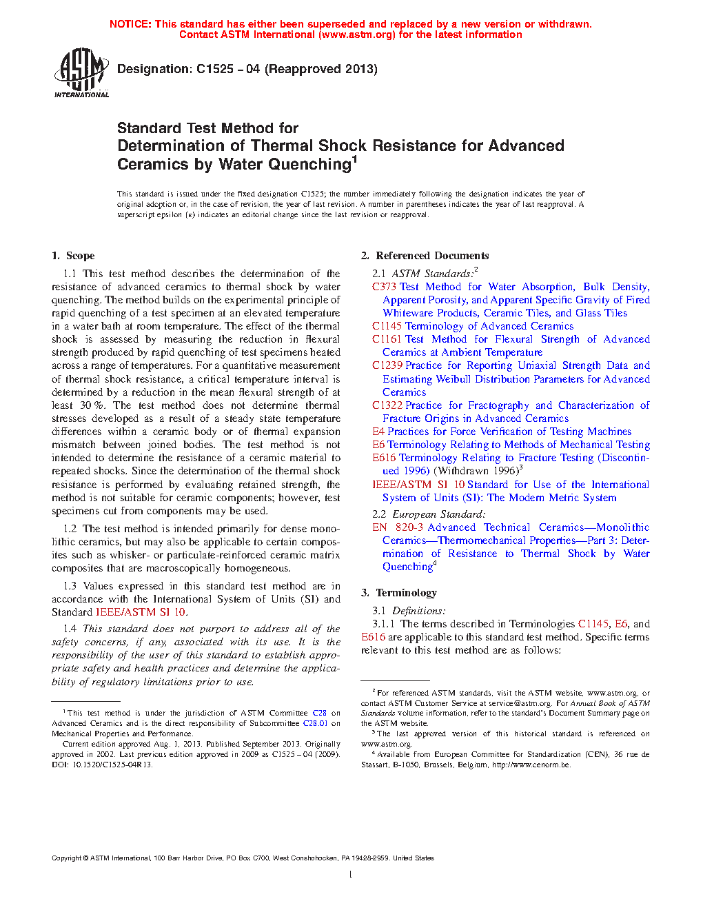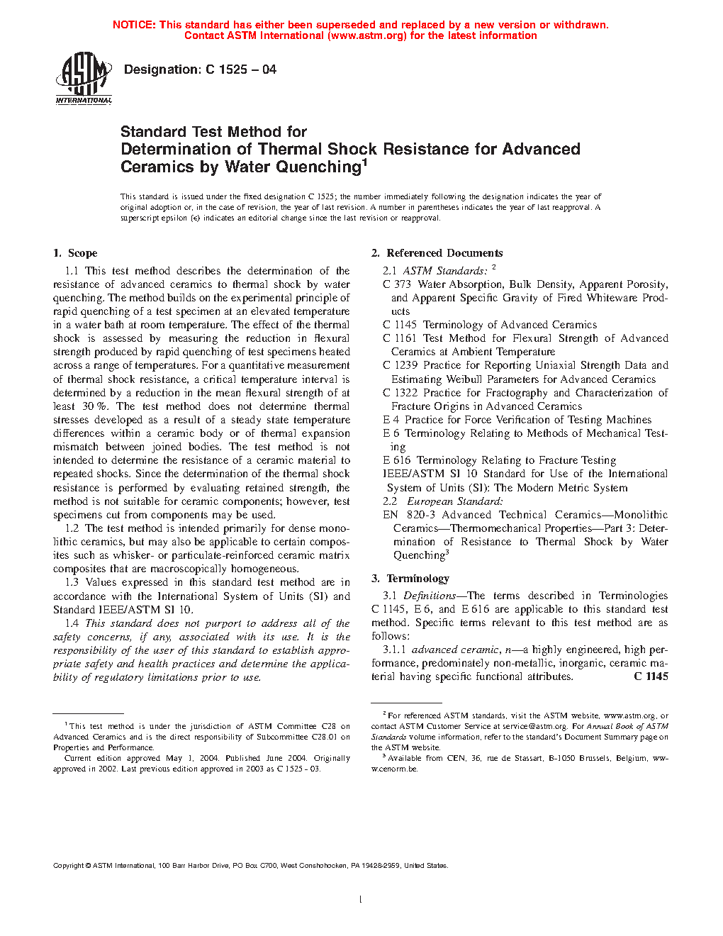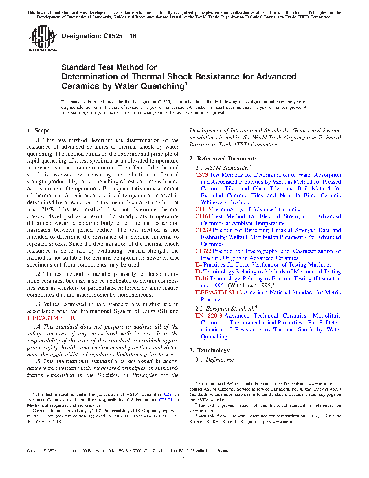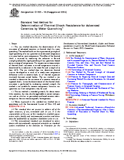1.1 This test method describes the determination of the resistance of advanced ceramics to thermal shock by water quenching. The method builds on the experimental principle of rapid quenching of a test specimen at an elevated temperature in a water bath at room temperature. The effect of the thermal shock is assessed by measuring the reduction in flexural strength produced by rapid quenching of test specimens heated across a range of temperatures. For a quantitative measurement of thermal shock resistance, a critical temperature interval is determined by a reduction in the mean flexural strength of at least 30 %. The test method does not determine thermal stresses developed as a result of a steady-state temperature difference within a ceramic body or of thermal expansion mismatch between joined bodies. The test method is not intended to determine the resistance of a ceramic material to repeated shocks. Since the determination of the thermal shock resistance is performed by evaluating retained strength, the method is not suitable for ceramic components; however, test specimens cut from components may be used.