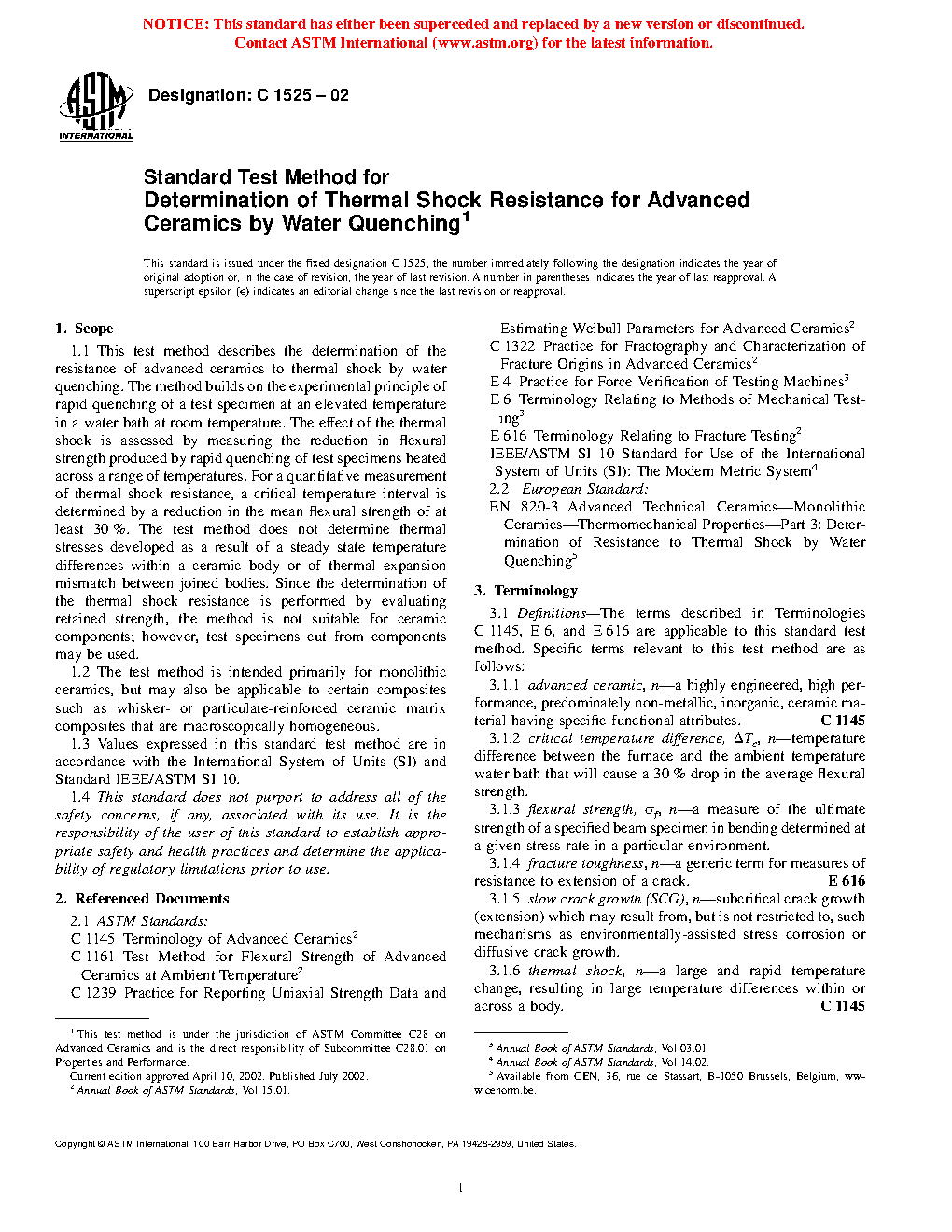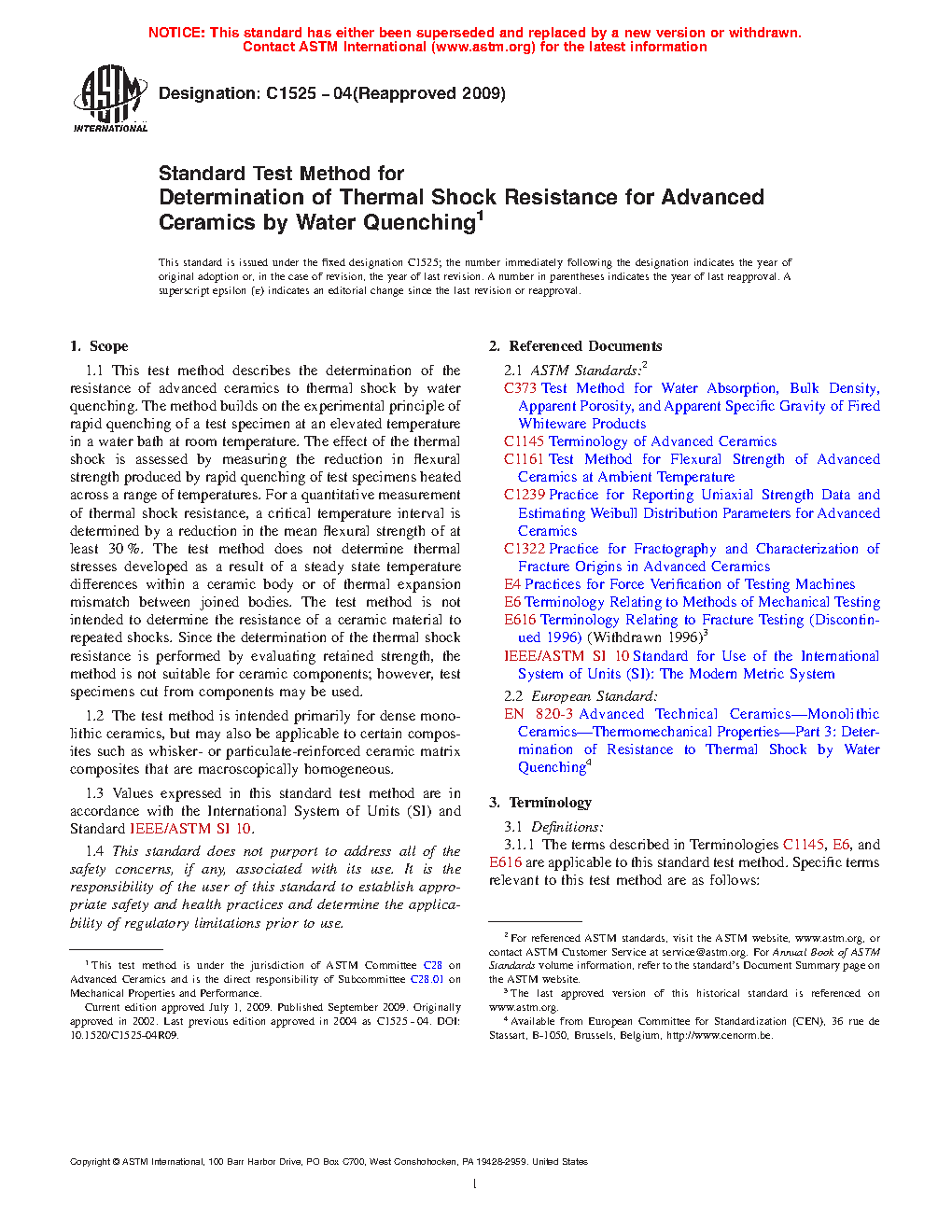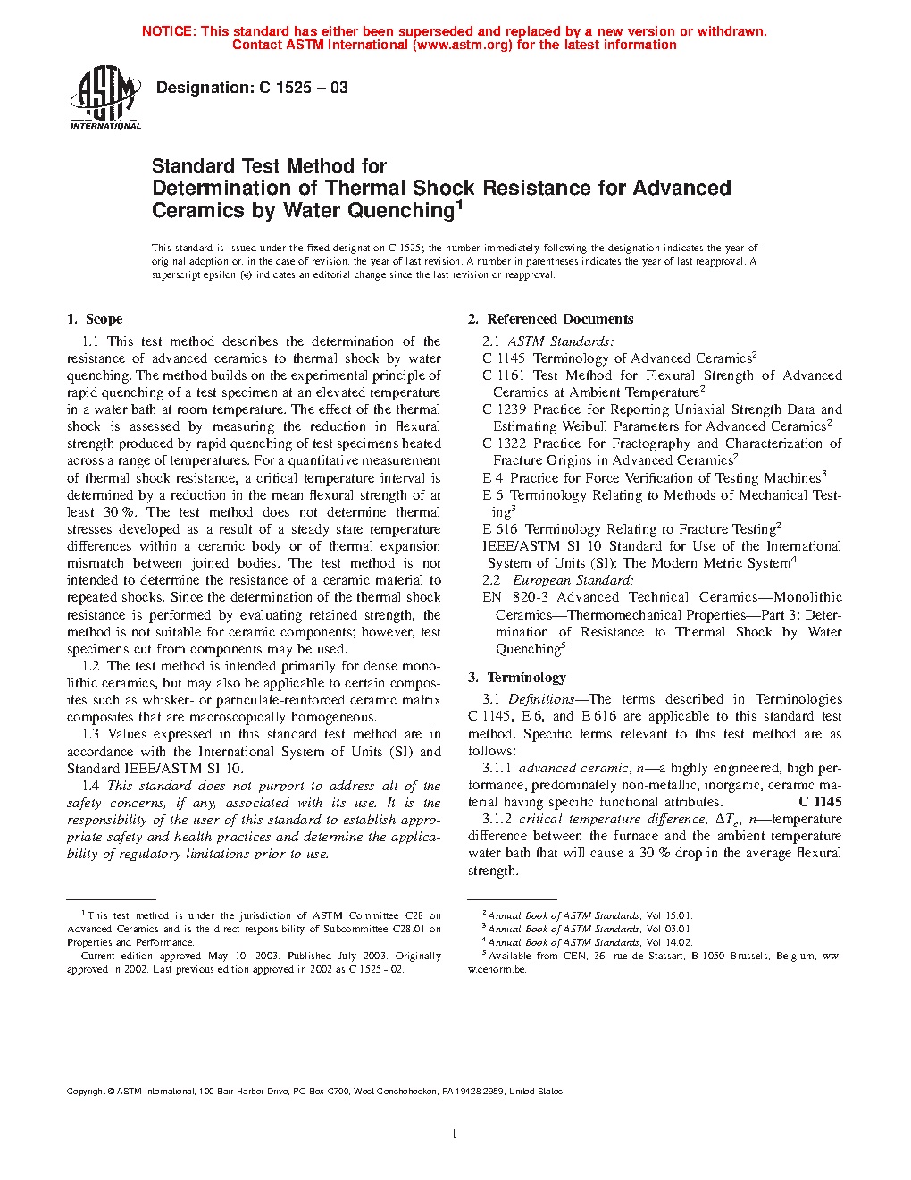 1.1 This test method describes the determination of the resistance of advanced ceramics to thermal shock by water quenching. The method builds on the experimental principle of rapid quenching of a test specimen at an elevated temperature in a water bath at room temperature. The effect of the thermal shock is assessed by measuring the reduction in flexural strength produced by rapid quenching of test specimens heated across a range of temperatures. For a quantitative measurement of thermal shock resistance, a critical temperature interval is determined by a reduction in the mean flexural strength of at least 30 %. The test method does not determine thermal stresses developed as a result of a steady-state temperature difference within a ceramic body or of thermal expansion mismatch between joined bodies. The test method is not intended to determine the resistance of a ceramic material to repeated shocks. Since the determination of the thermal shock resistance is performed by evaluating retained strength, the method is not suitable for ceramic components; however, test specimens cut from components may be used.