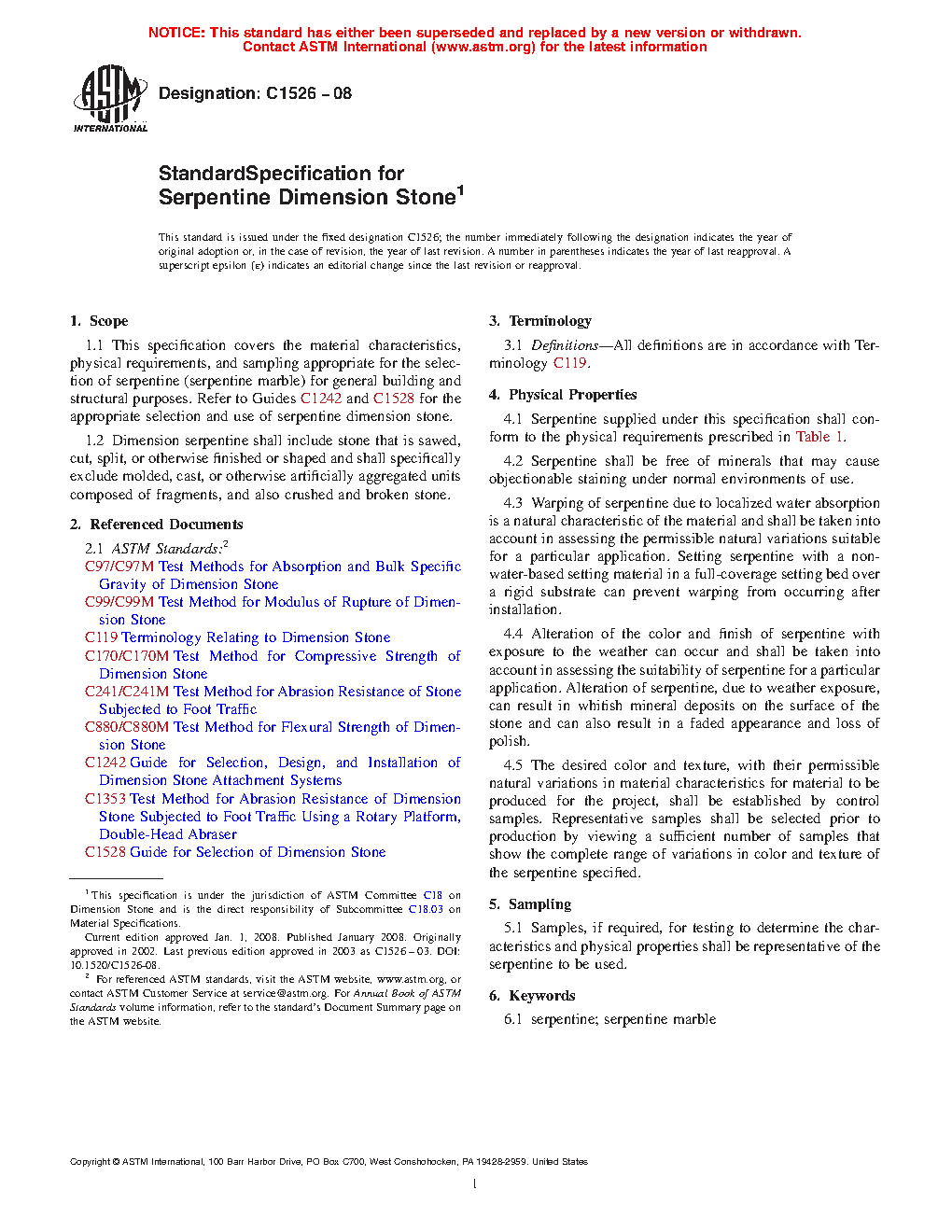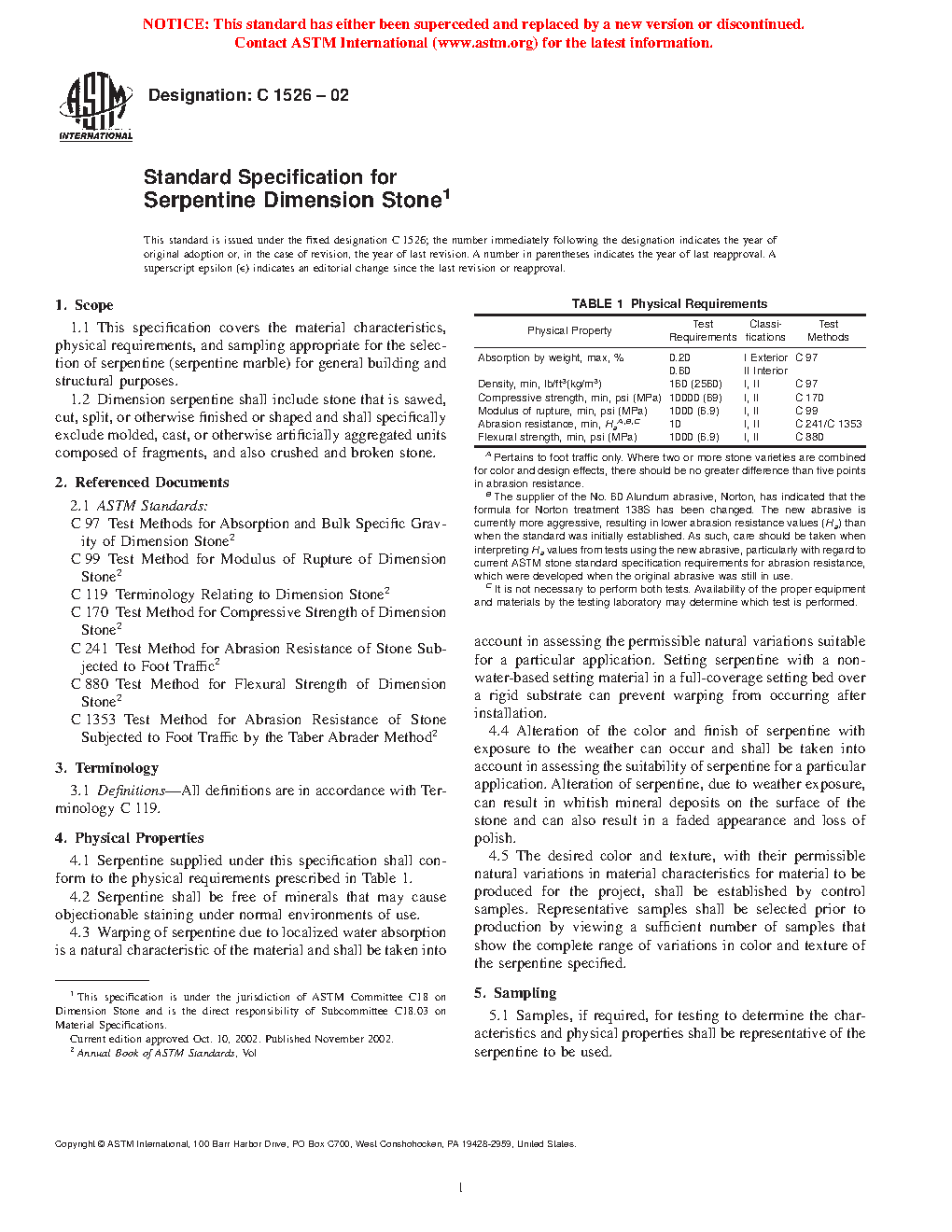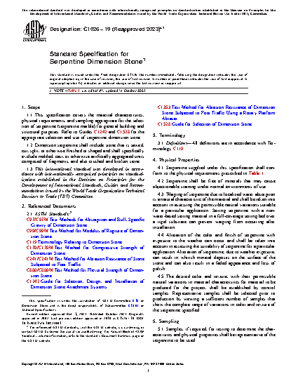 1.1 This specification covers the material characteristics, physical requirements, and sampling appropriate for the selection of serpentine (serpentine marble) for general building and structural purposes. Refer to Guides C1242 and C1528 for the appropriate selection and use of serpentine dimension stone.