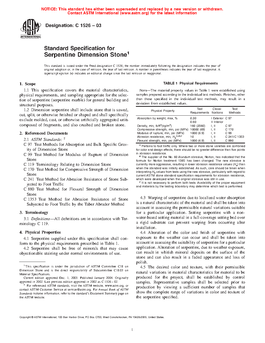 This specification covers the material characteristics, physical requirements, and sampling methods appropriate for the selection of serpentine (serpentine marble) dimension stone for general building and structural purposes. Dimension serpentine shall include stone that is sawed, cut, split, or otherwise finished or shaped, and shall specifically exclude molded, cast, or otherwise artificially aggregated units composed of fragments, and also crushed and broken stone. The physical property requirements to which serpentine stones shall adhere to are absorption by weight, density, compressive strength, modulus of rupture, abrasion resistance, and flexural strength.