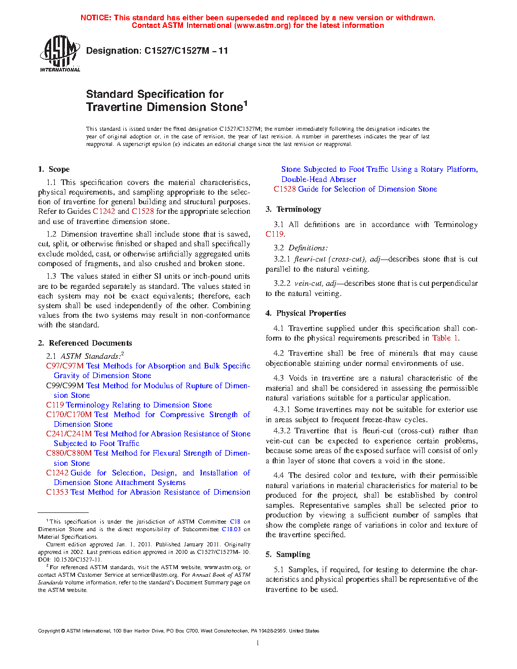 1.1 This specification covers the material characteristics, physical requirements, and sampling appropriate to the selection of travertine for general building and structural purposes.
