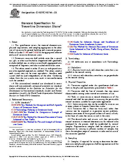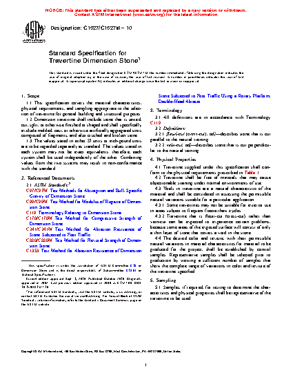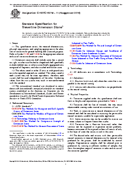 1.1 This specification covers the material characteristics, physical requirements, and sampling appropriate to the selection of travertine for general building and structural purposes. Refer to Guides C1242 and C1528 for the appropriate selection and use of travertine dimension stone.