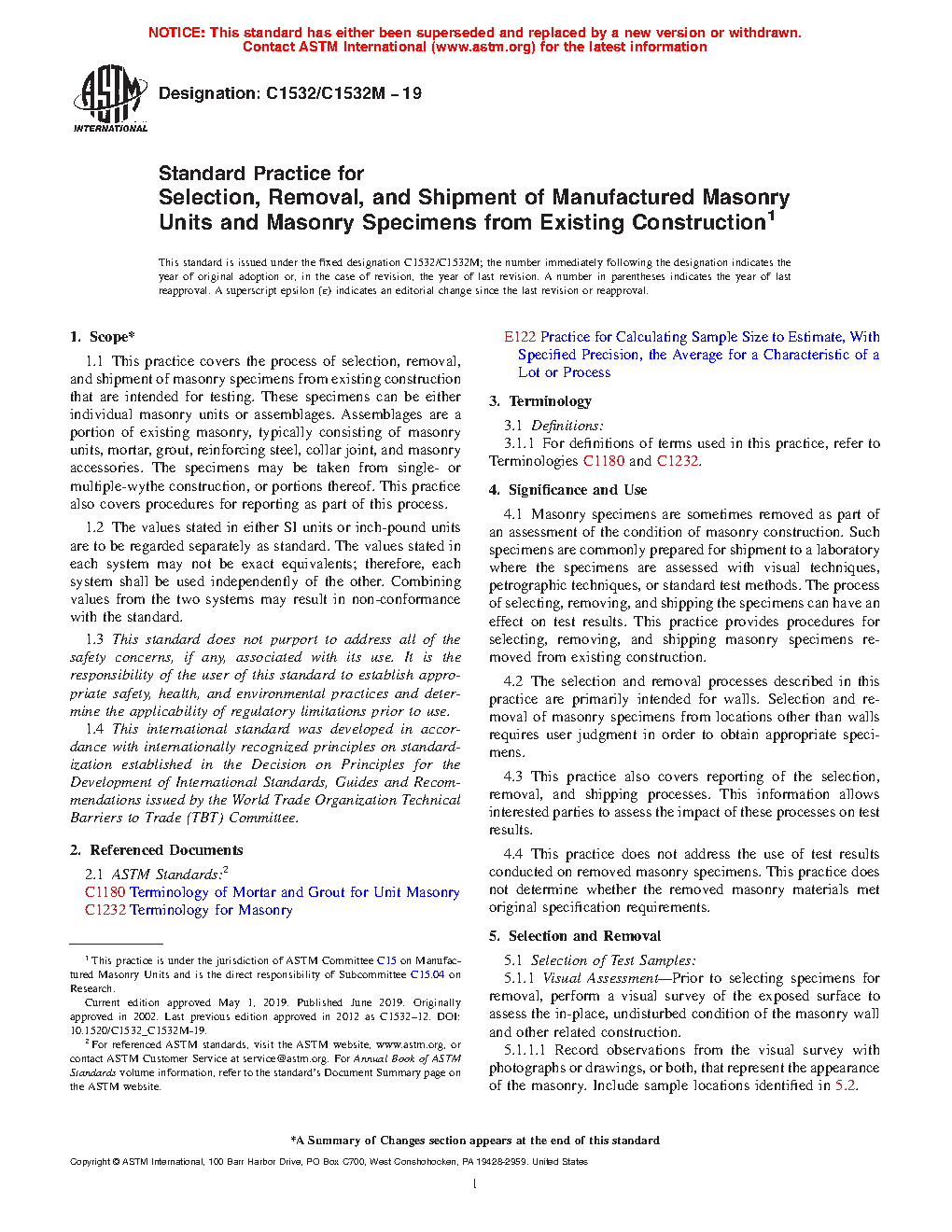 1.1 This practice covers the process of selection, removal, and shipment of masonry specimens from existing construction that are intended for testing. These specimens can be either individual masonry units or assemblages. Assemblages are a portion of existing masonry, typically consisting of masonry units, mortar, grout, reinforcing steel, collar joint, and masonry accessories. The specimens may be taken from single- or multiple-wythe construction, or portions thereof. This practice also covers procedures for reporting as part of this process.