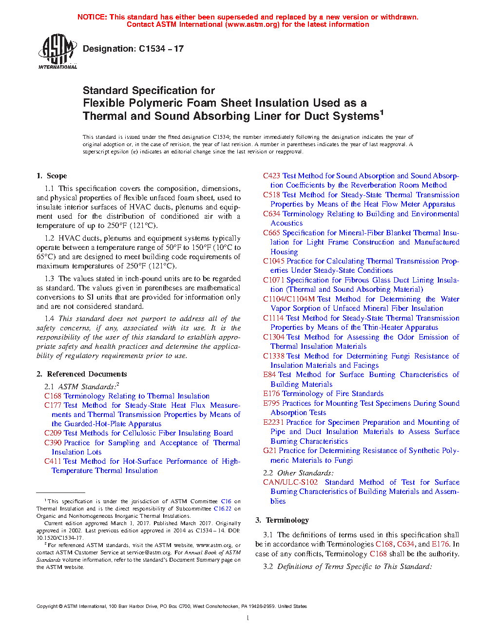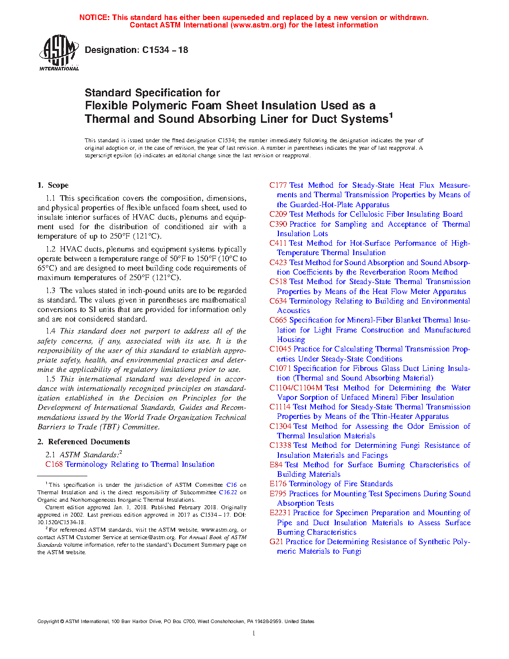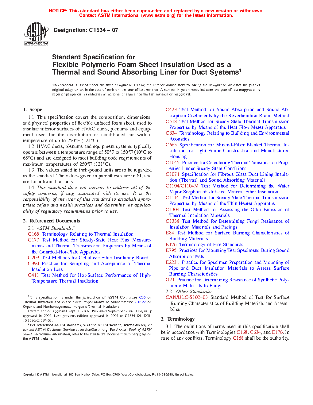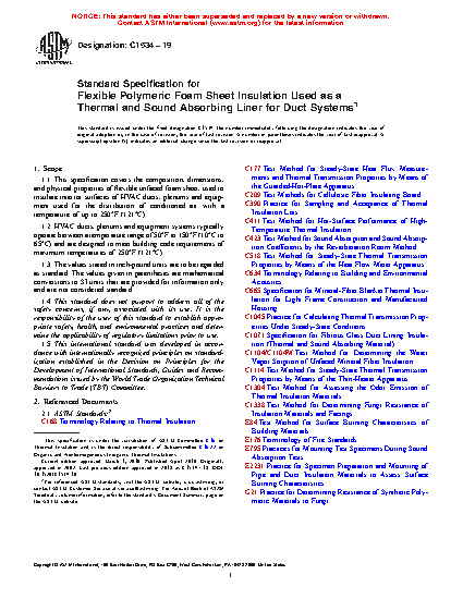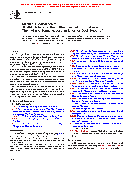 1.1 This specification covers the composition, dimensions, and physical properties of flexible unfaced foam sheet, used to insulate interior surfaces of HVAC ducts, plenums and equipment used for the distribution of conditioned air with a temperature of up to 250°F (121°C).