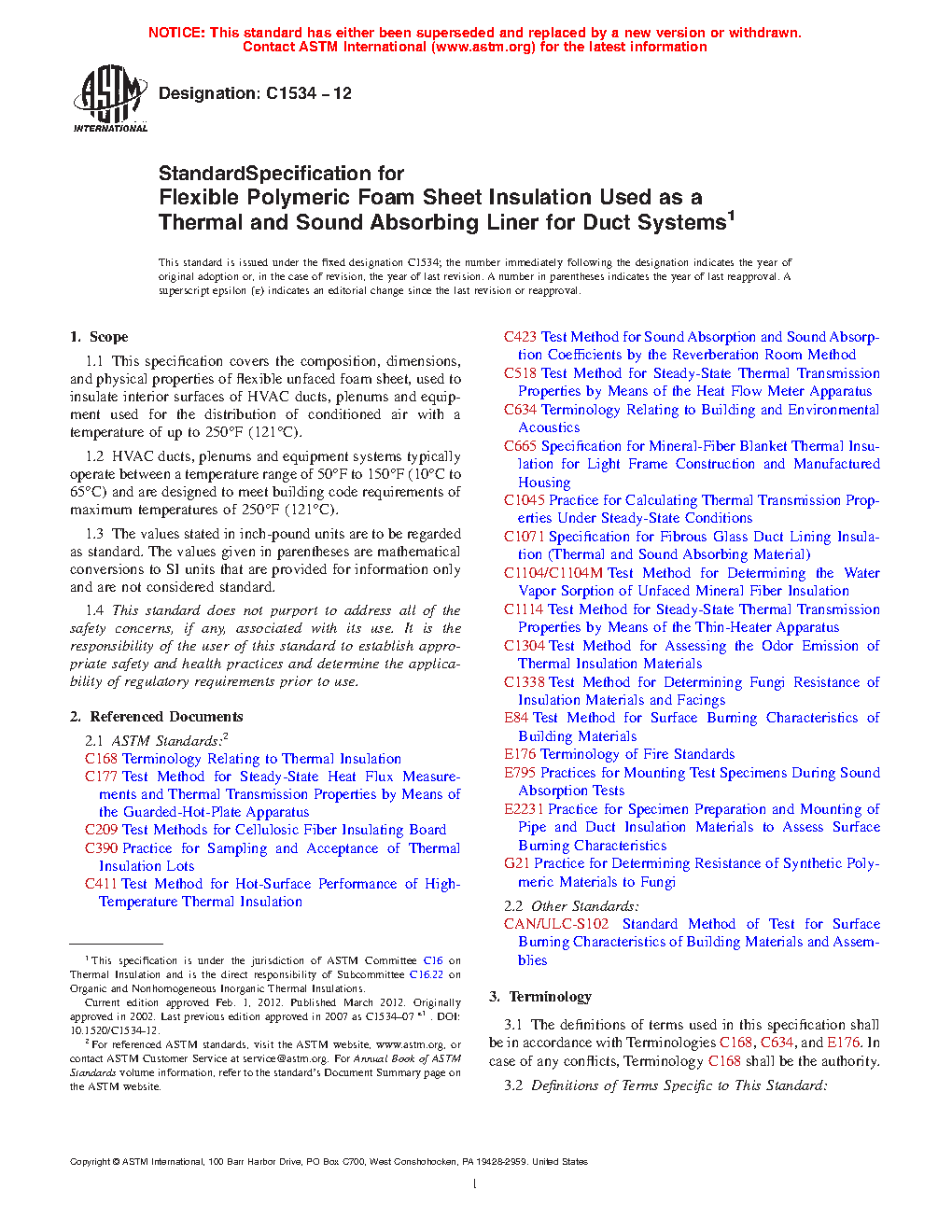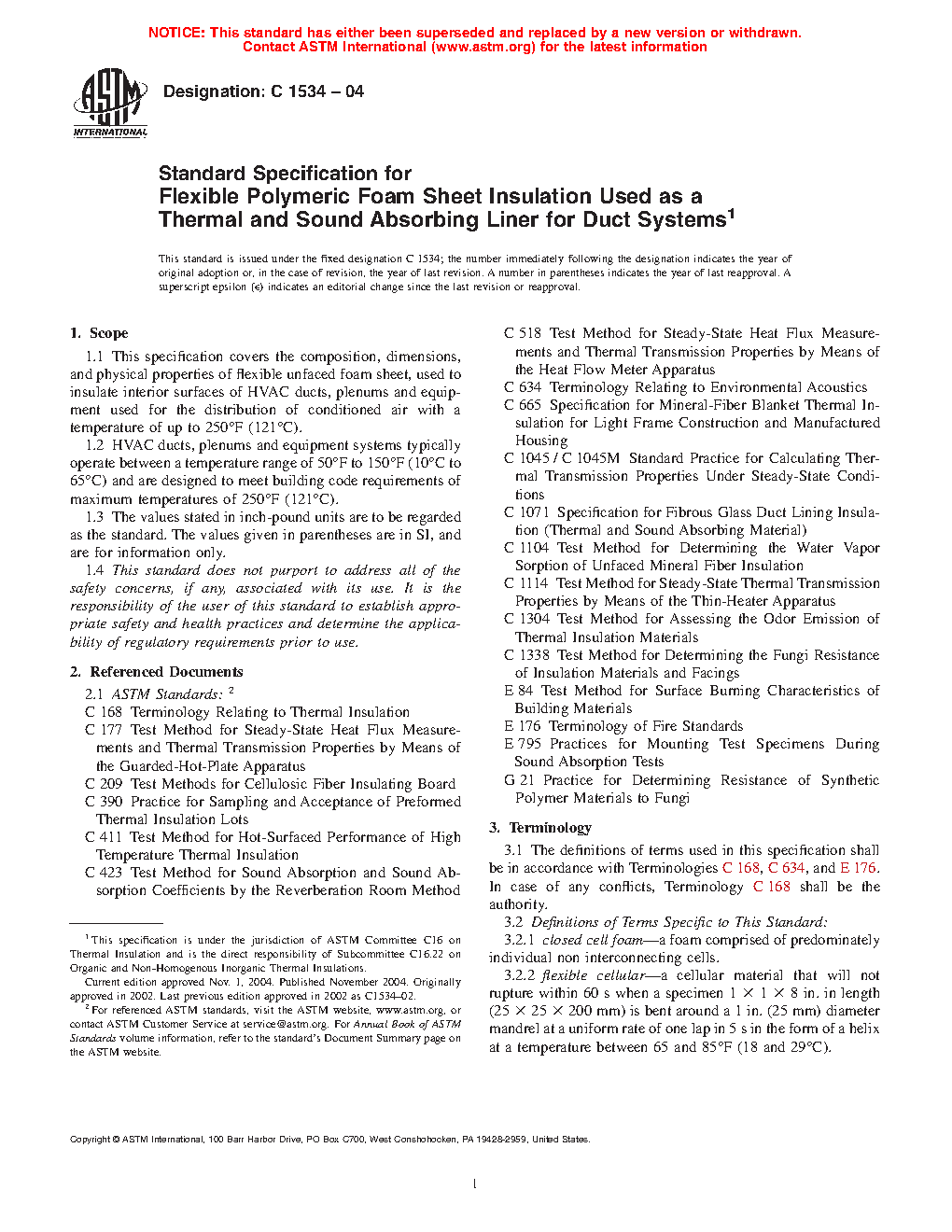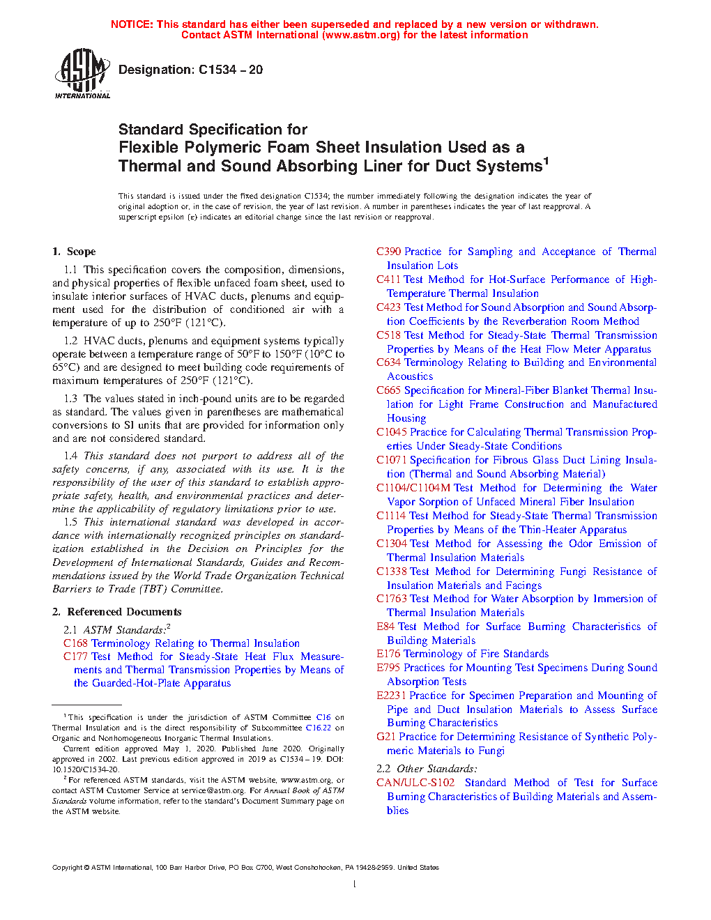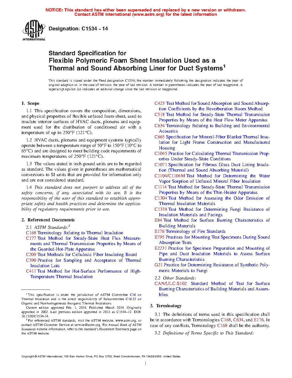 1.1 This specification covers the composition, dimensions, and physical properties of flexible unfaced foam sheet, used to insulate interior surfaces of HVAC ducts, plenums and equipment used for the distribution of conditioned air with a temperature of up to 250°F (121°C).