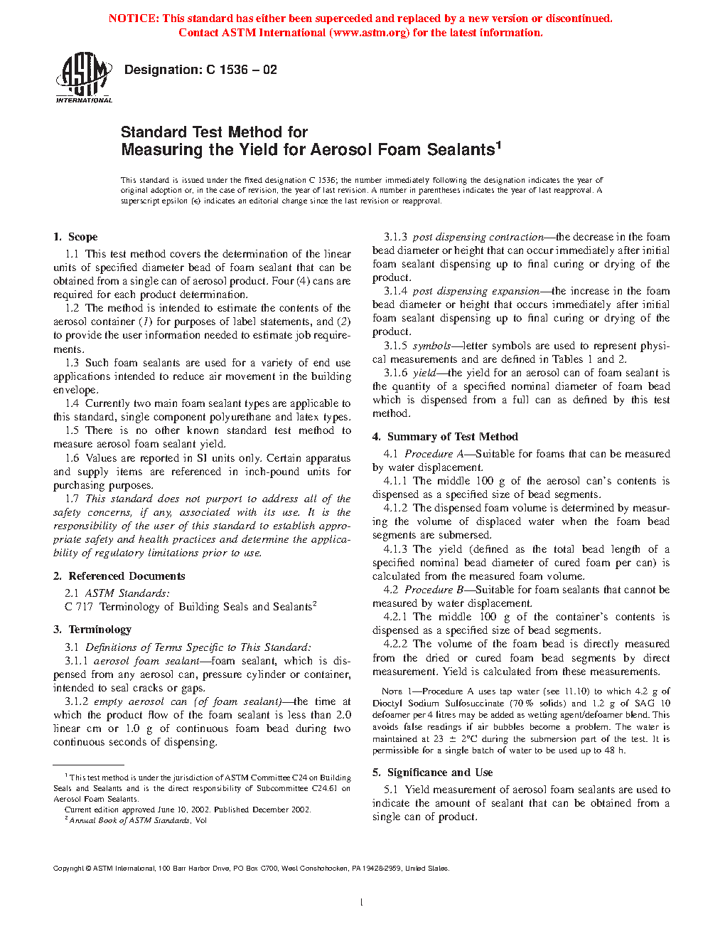 1.1 This test method determines the quantity of linear units of a foam sealant at a specified bead diameter that may be obtained from each container of an aerosol product. A minimum of four (4) representative containers of the aerosol product are required for this determination.