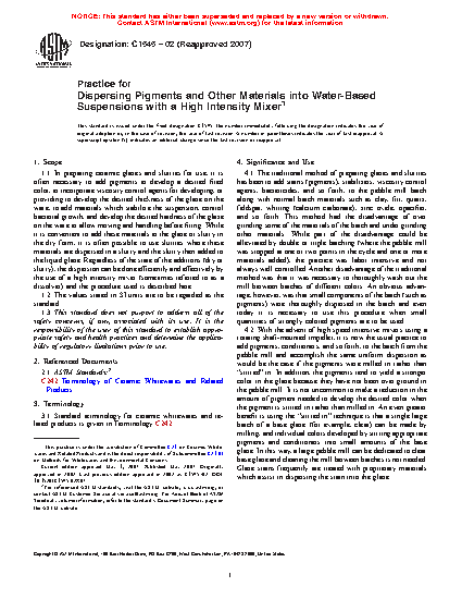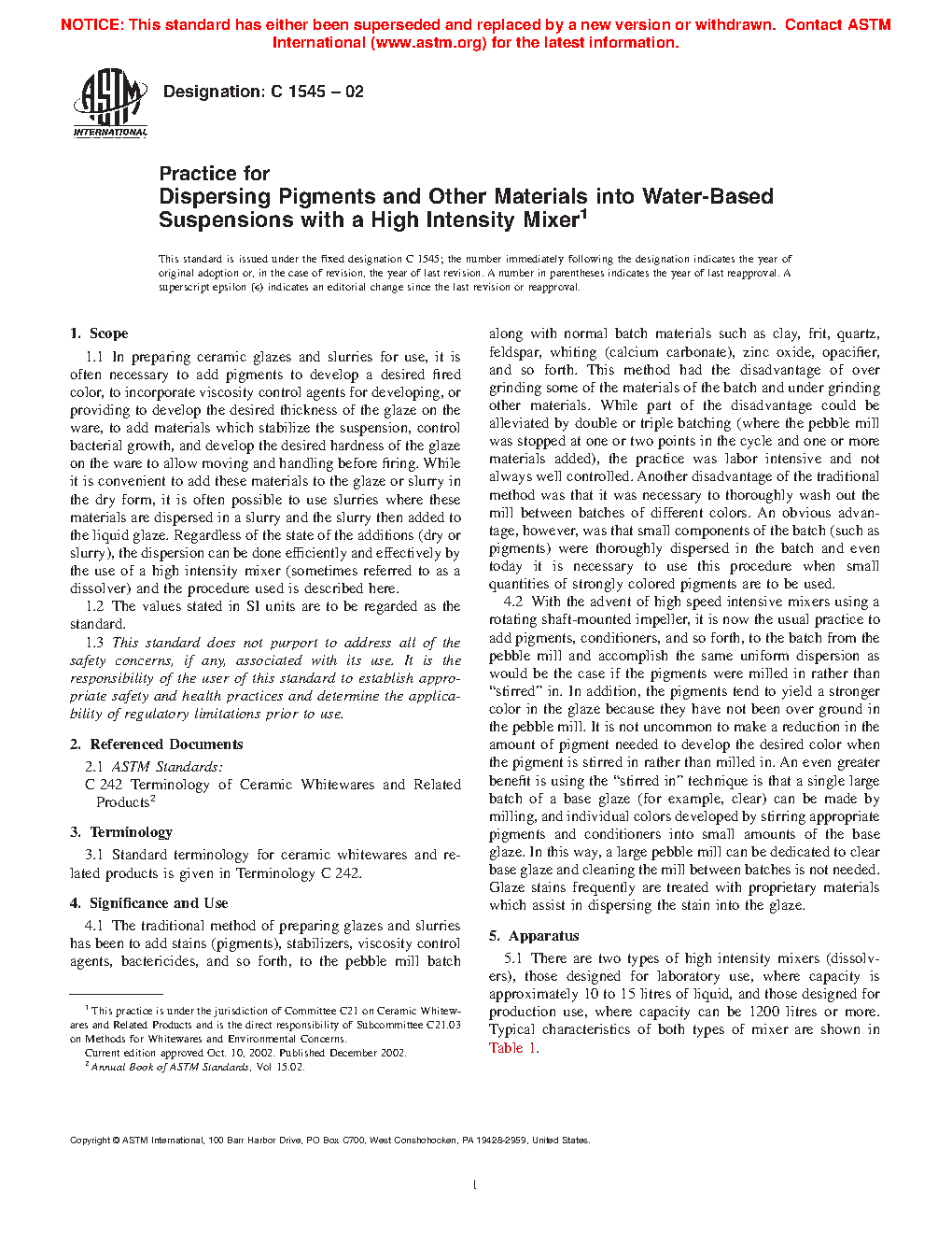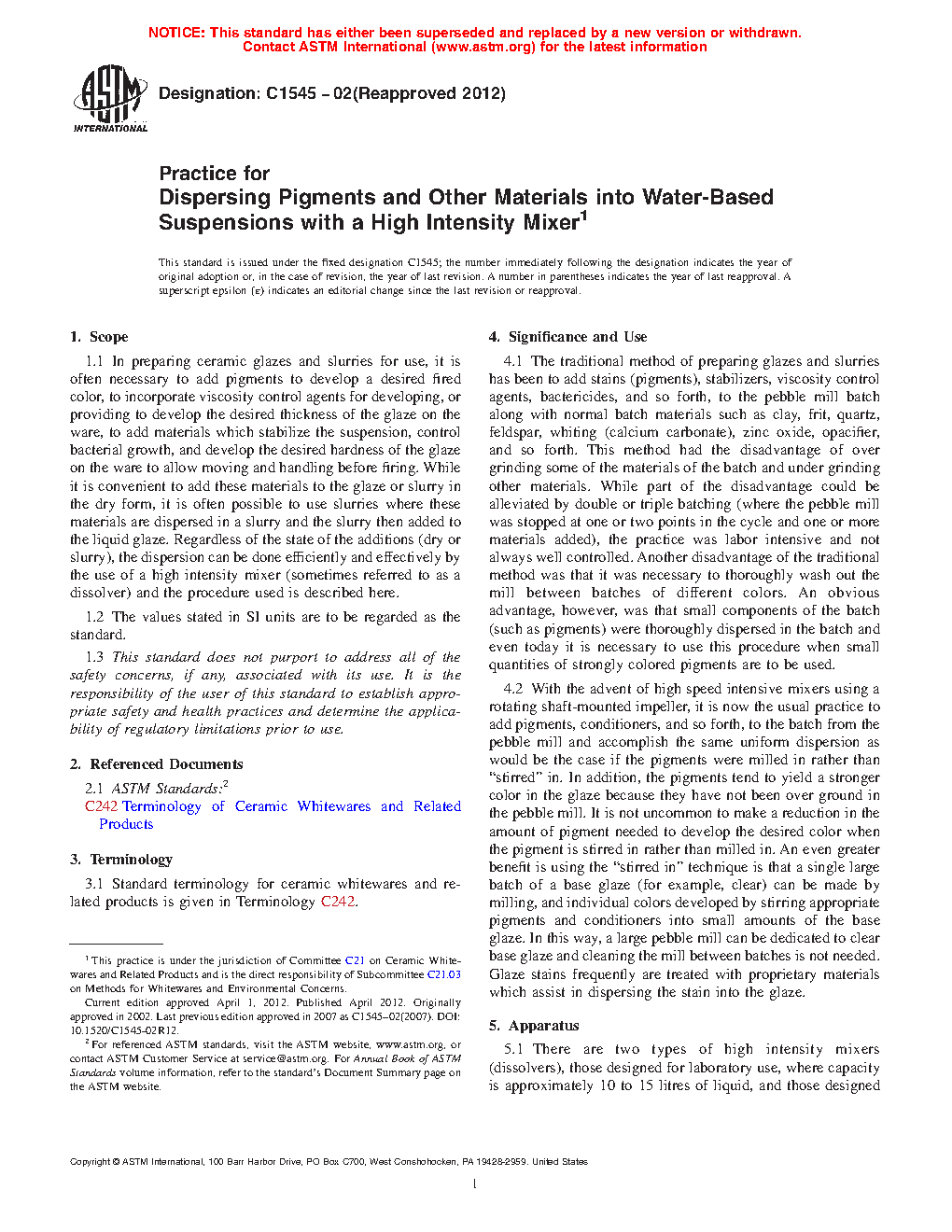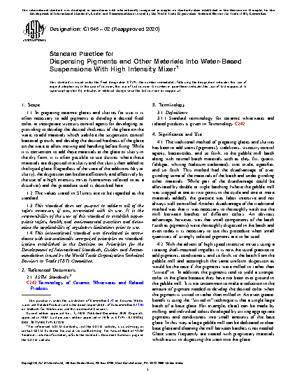 1.1 In preparing ceramic glazes and slurries for use, it is often necessary to add pigments to develop a desired fired color, to incorporate viscosity control agents for developing, or providing to develop the desired thickness of the glaze on the ware, to add materials which stabilize the suspension, control bacterial growth, and develop the desired hardness of the glaze on the ware to allow moving and handling before firing. While it is convenient to add these materials to the glaze or slurry in the dry form, it is often possible to use slurries where these materials are dispersed in a slurry and the slurry then added to the liquid glaze. Regardless of the state of the additions (dry or slurry), the dispersion can be done efficiently and effectively by the use of a high intensity mixer (sometimes referred to as a dissolver) and the procedure used is described here.