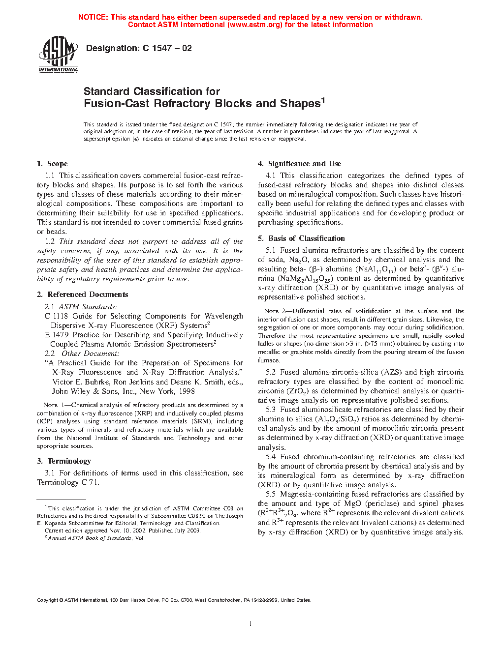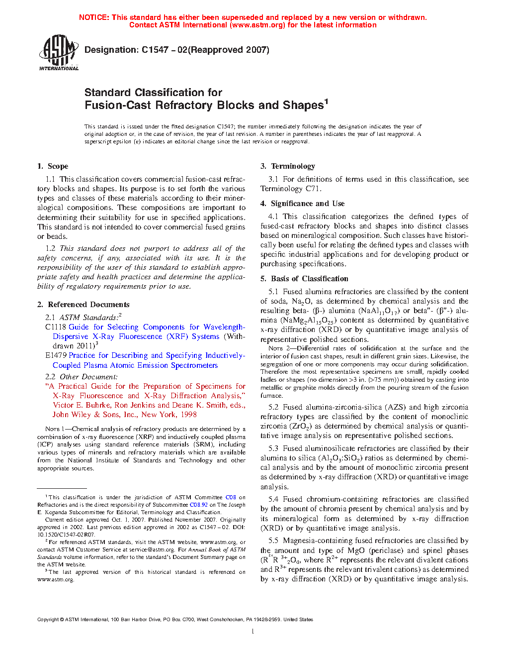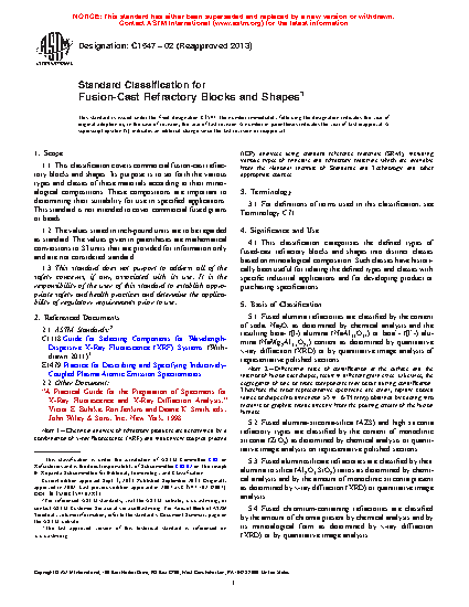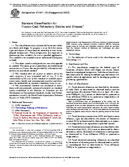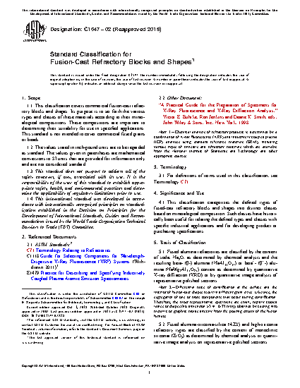 1.1 This classification covers commercial fusion-cast refractory blocks and shapes. Its purpose is to set forth the various types and classes of these materials according to their mineralogical compositions. These compositions are important to determining their suitability for use in specified applications. This standard is not intended to cover commercial fused grains or beads.