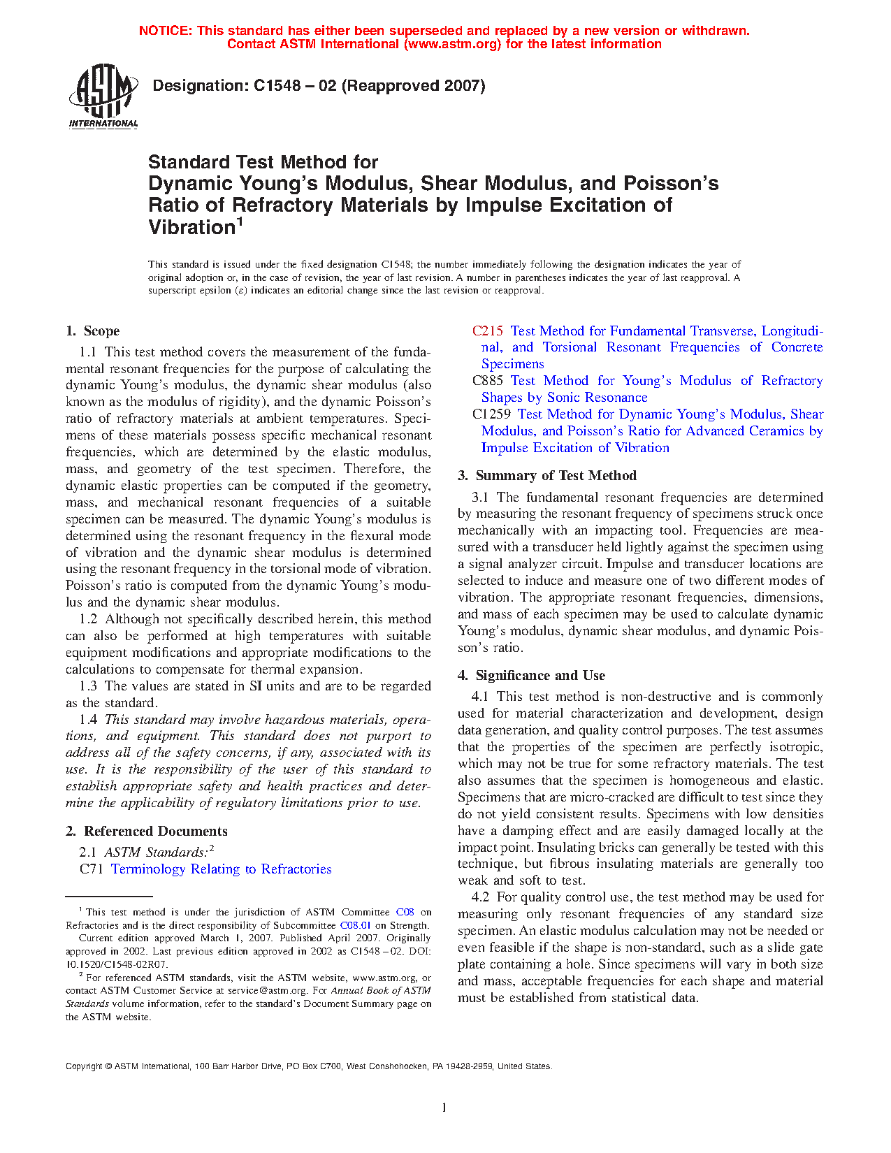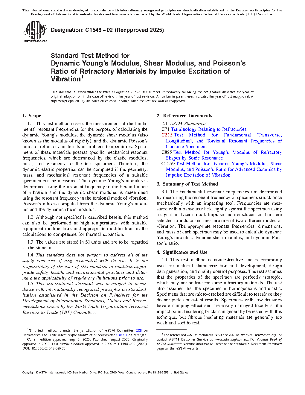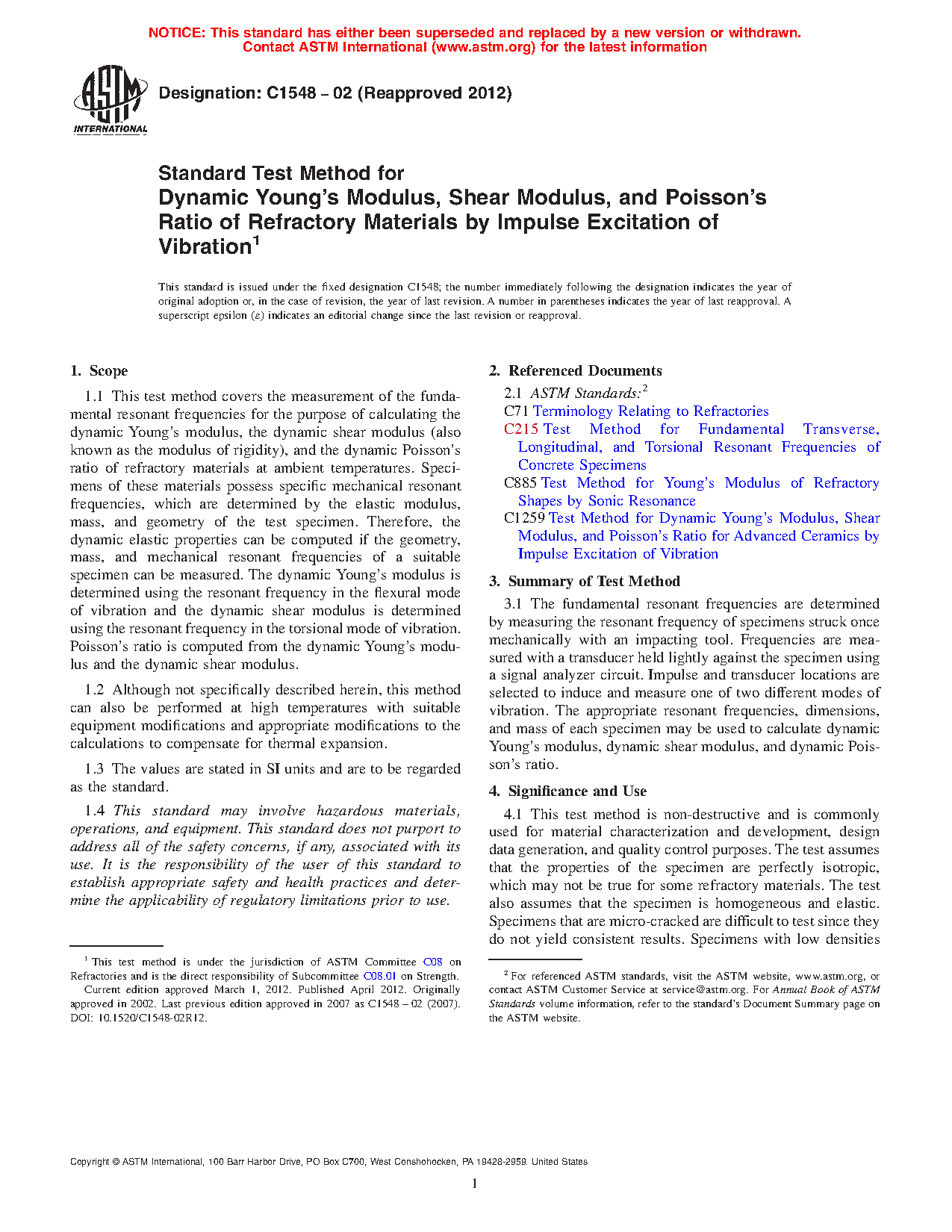 1.1 This test method covers the measurement of the fundamental resonant frequencies for the purpose of calculating the dynamic Young’s modulus, the dynamic shear modulus (also known as the modulus of rigidity), and the dynamic Poisson’s ratio of refractory materials at ambient temperatures. Specimens of these materials possess specific mechanical resonant frequencies, which are determined by the elastic modulus, mass, and geometry of the test specimen. Therefore, the dynamic elastic properties can be computed if the geometry, mass, and mechanical resonant frequencies of a suitable specimen can be measured. The dynamic Young’s modulus is determined using the resonant frequency in the flexural mode of vibration and the dynamic shear modulus is determined using the resonant frequency in the torsional mode of vibration. Poisson’s ratio is computed from the dynamic Young’s modulus and the dynamic shear modulus.