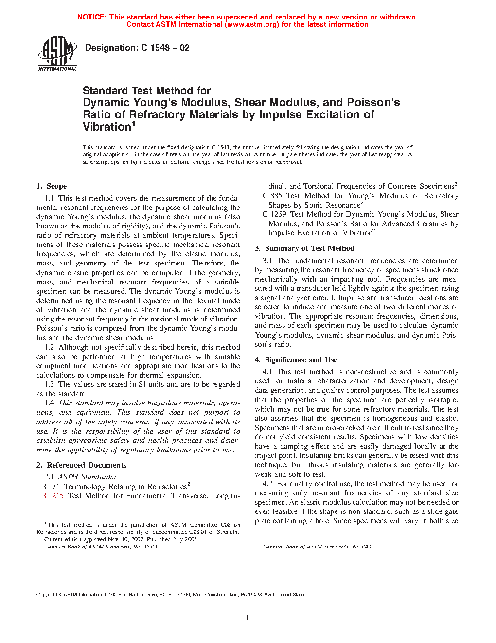 4.1 This test method is nondestructive and is commonly used for material characterization and development, design data generation, and quality control purposes. The test assumes that the properties of the specimen are perfectly isotropic, which may not be true for some refractory materials. The test also assumes that the specimen is homogeneous and elastic. Specimens that are micro-cracked are difficult to test since they do not yield consistent results. Specimens with low densities have a damping effect and are easily damaged locally at the impact point. Insulating bricks can generally be tested with this technique, but fibrous insulating materials are generally too weak and soft to test.
