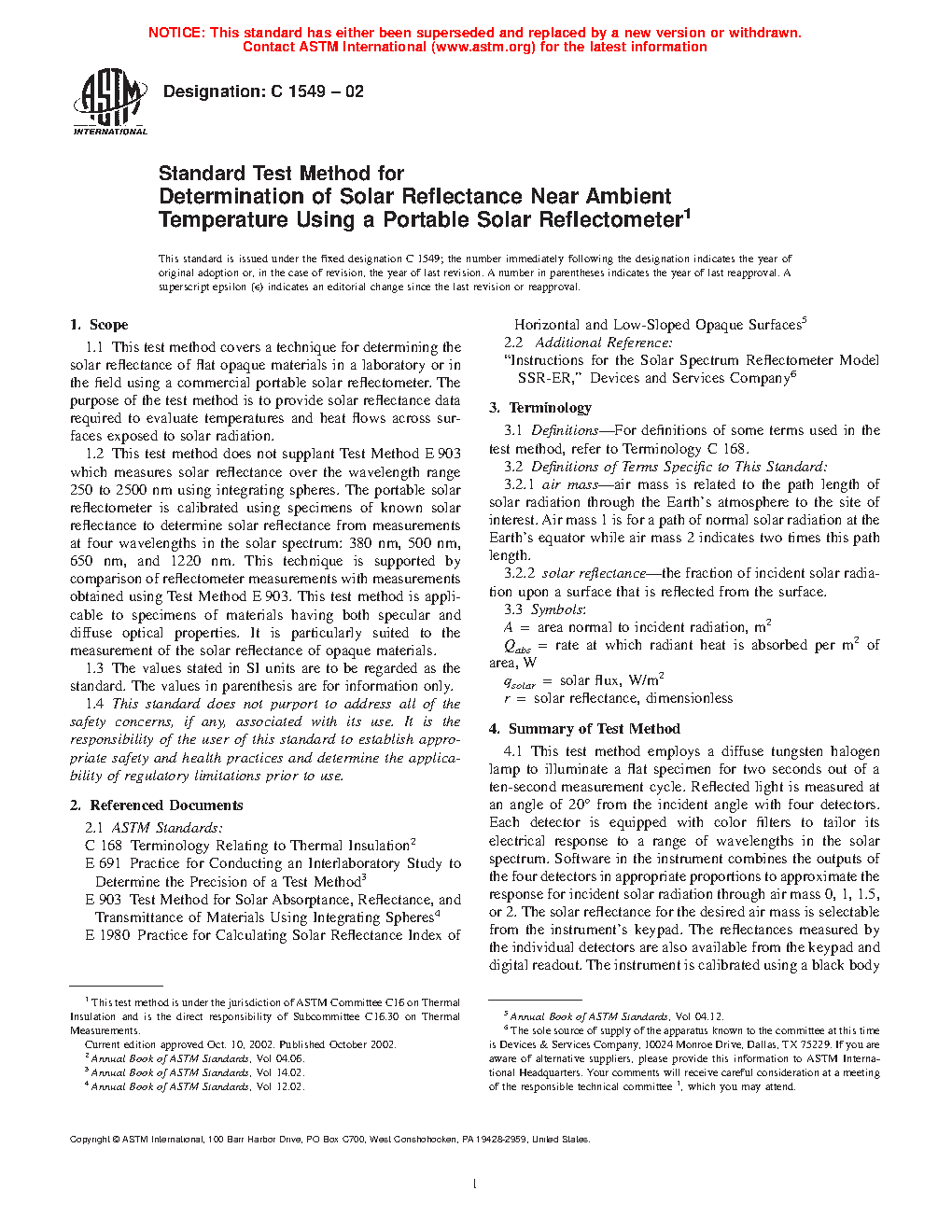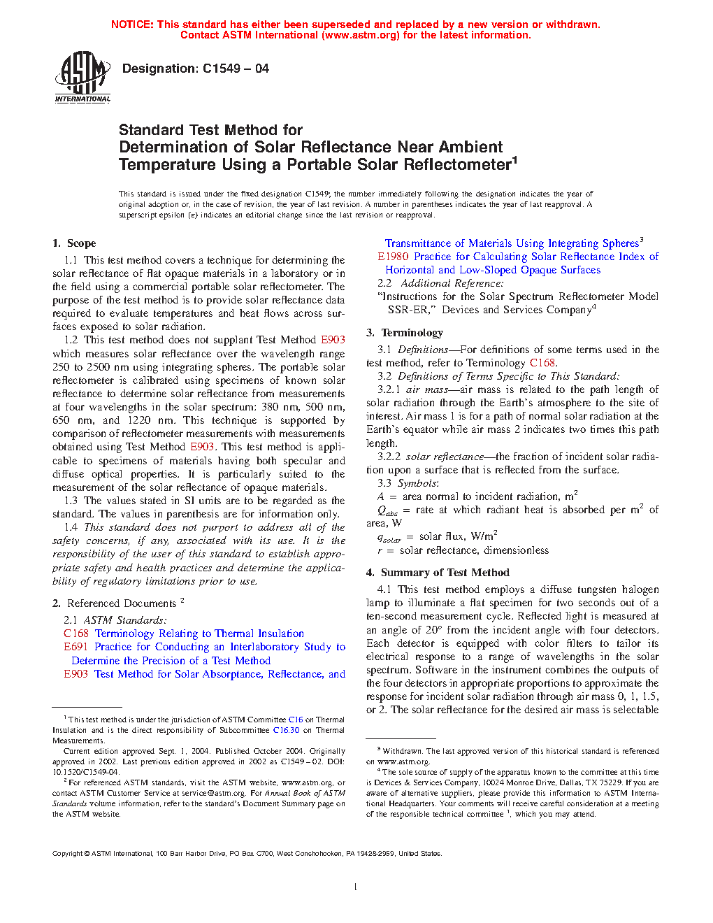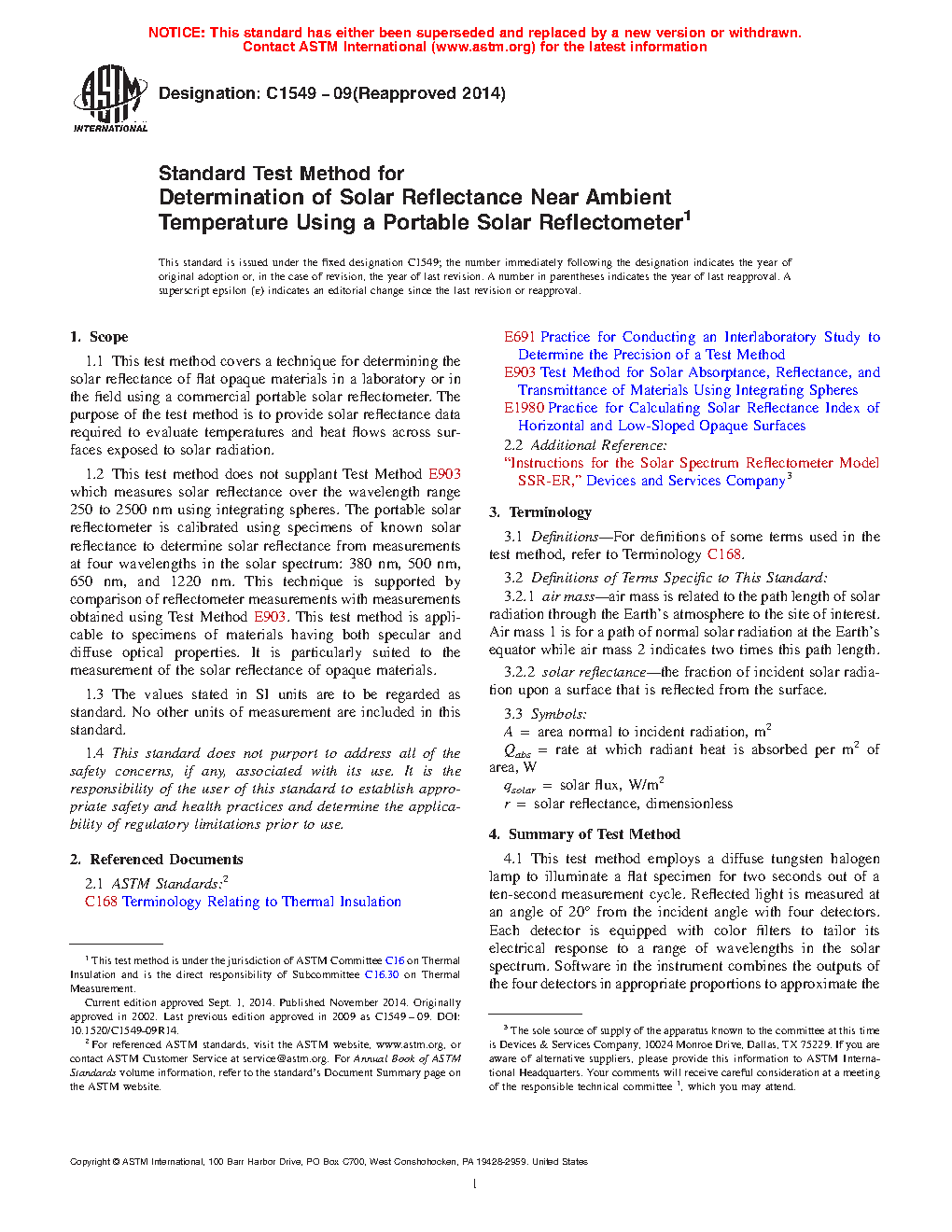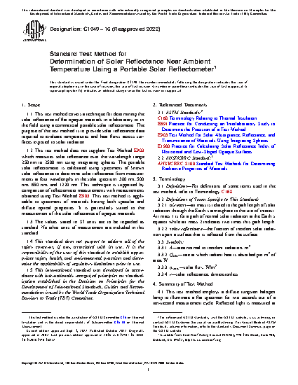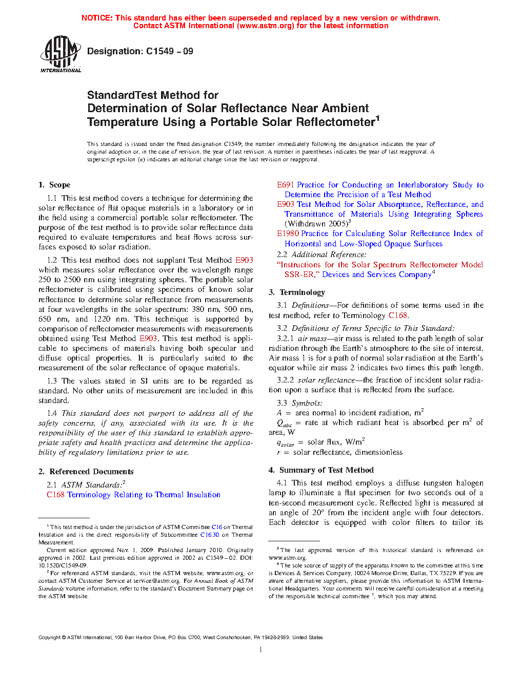 1.2 This test method does not supplant Test Method E903 which measures solar reflectance over the wavelength range 250 nm to 2500 nm using integrating spheres. The portable solar reflectometer is calibrated using specimens of known solar reflectance to determine solar reflectance from measurements at four wavelengths in the solar spectrum: 380 nm, 500 nm, 650 nm, and 1220 nm. This technique is supported by comparison of reflectometer measurements with measurements obtained using Test Method E903. This test method is applicable to specimens of materials having both specular and diffuse optical properties. It is particularly suited to the measurement of the solar reflectance of opaque materials.