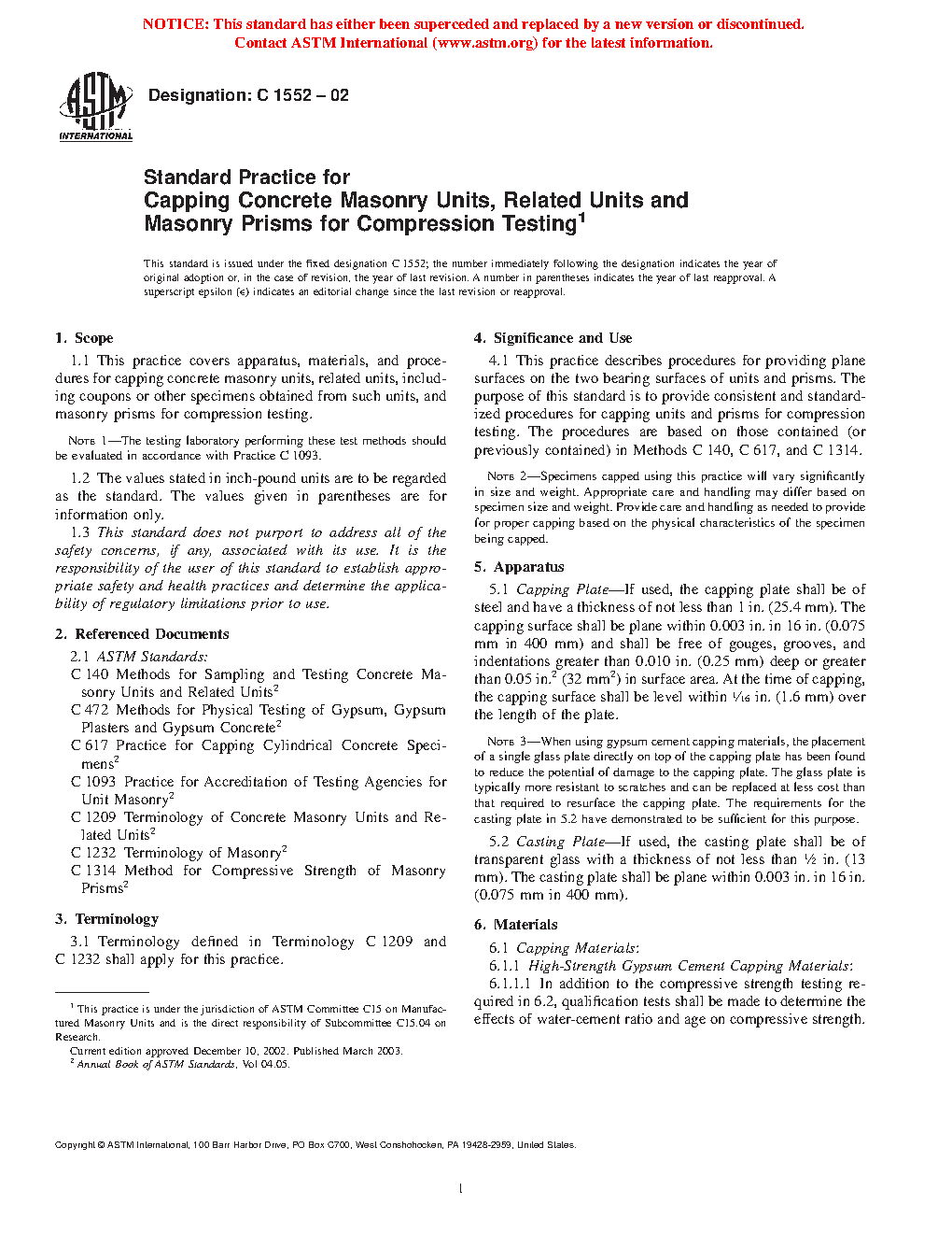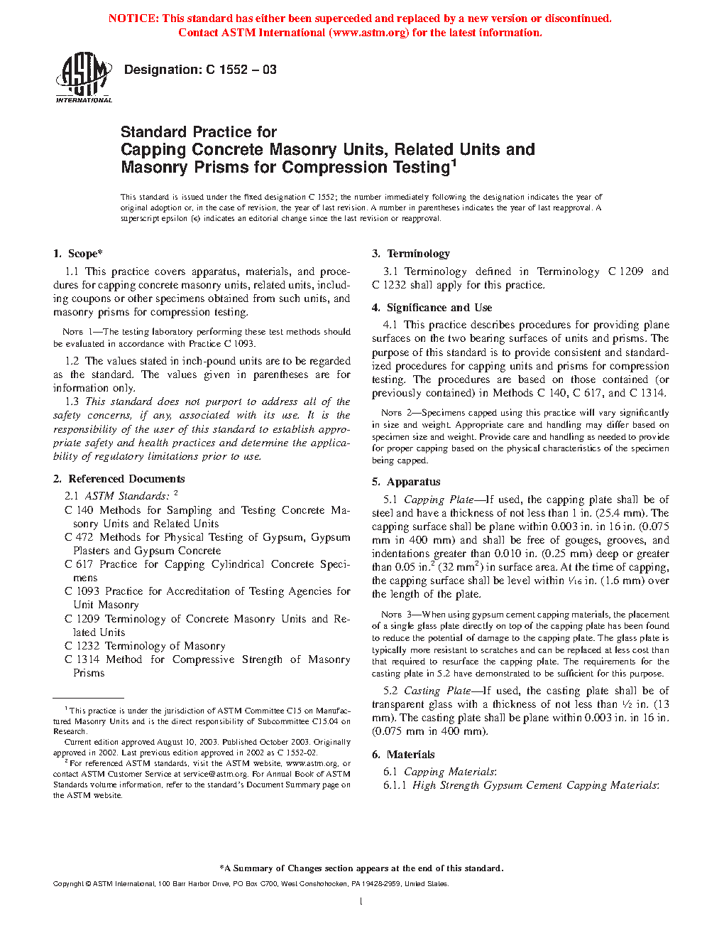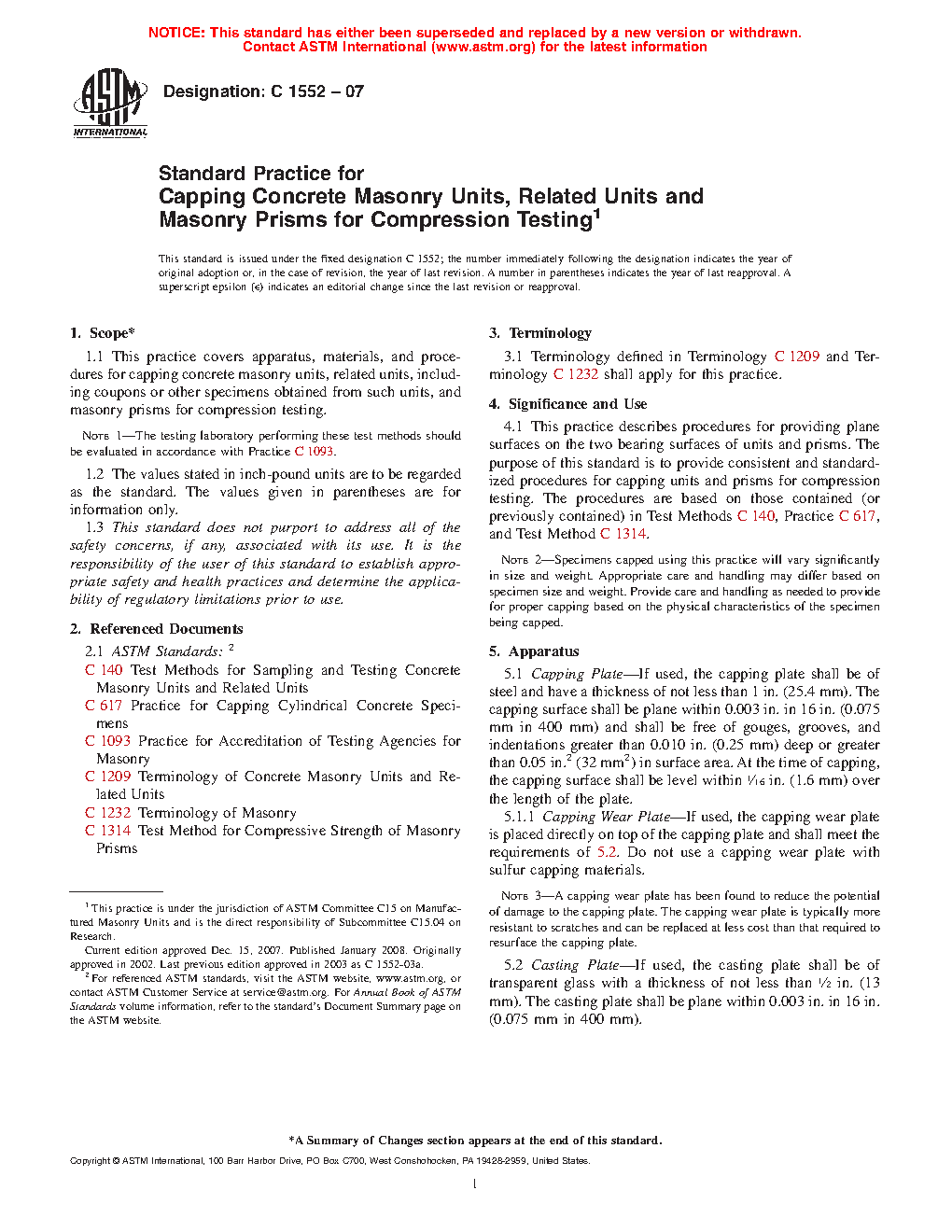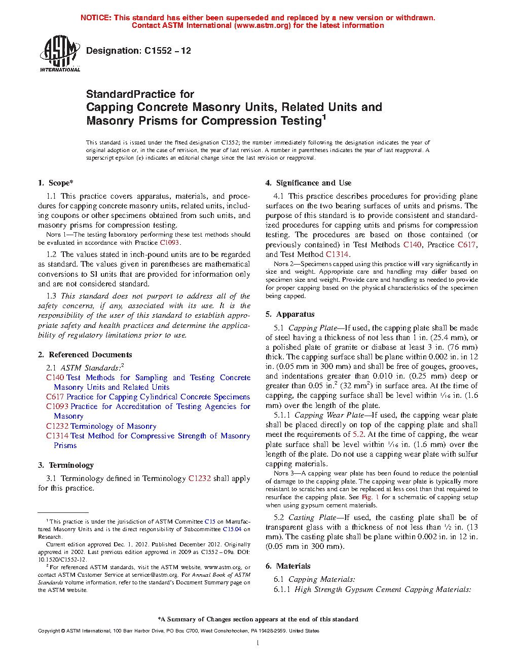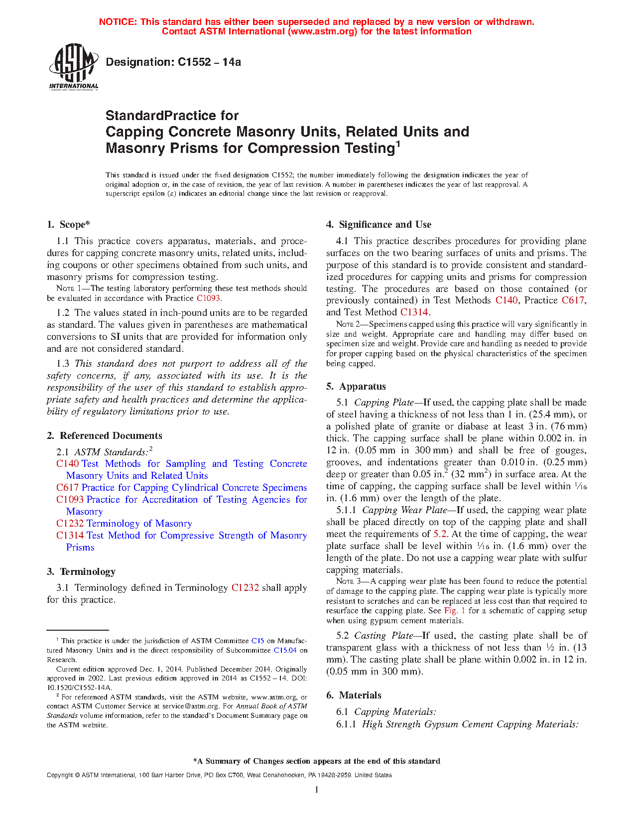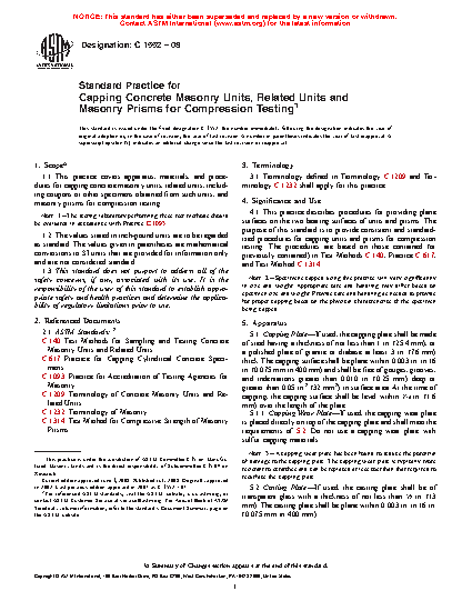 1.1 This practice covers apparatus, materials, and procedures for capping concrete masonry units, related units, including coupons or other specimens obtained from such units, and masonry prisms for compression testing.