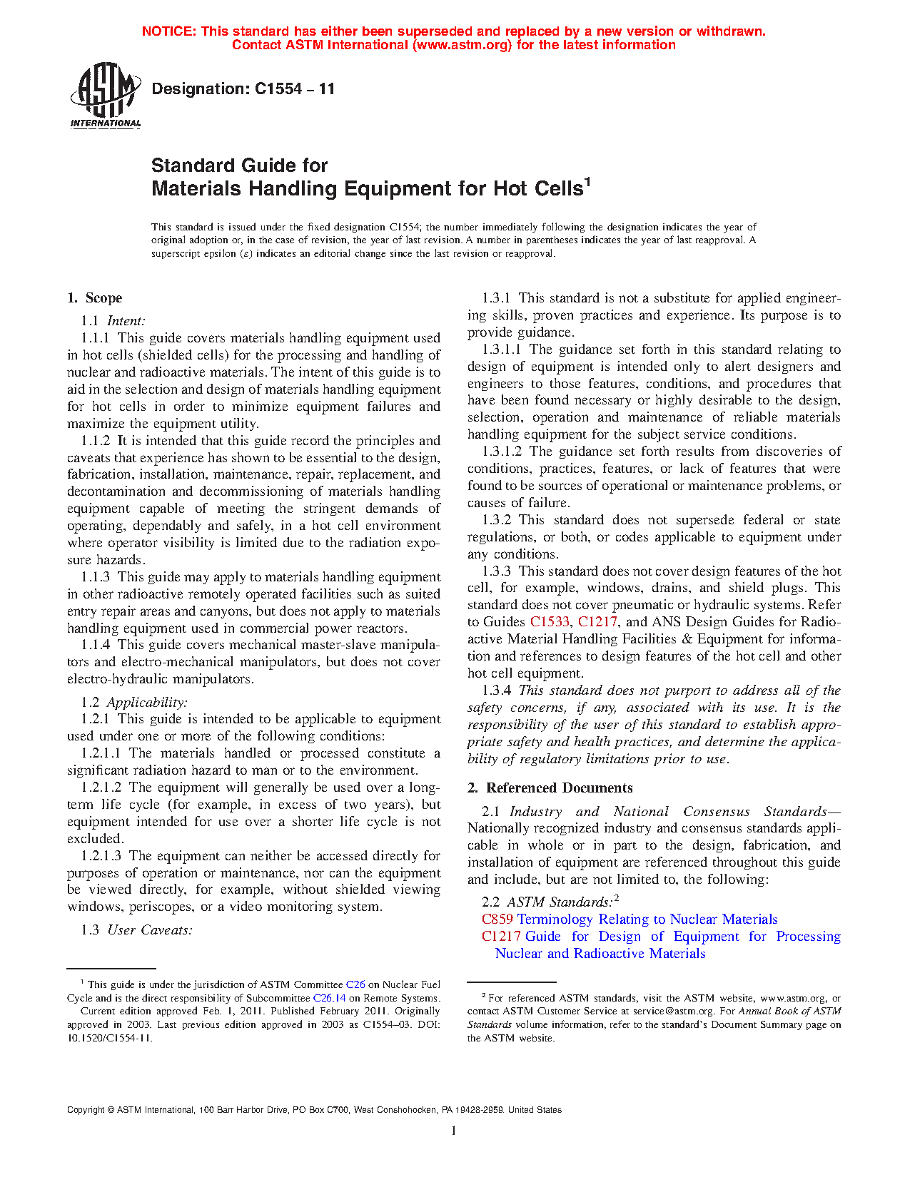 1.1.2 It is intended that this guide record the principles and caveats that experience has shown to be essential to the design, fabrication, installation, maintenance, repair, replacement, and decontamination and decommissioning of materials handling equipment capable of meeting the stringent demands of operating, dependably and safely, in a hot cell environment where operator visibility is limited due to the radiation exposure hazards.