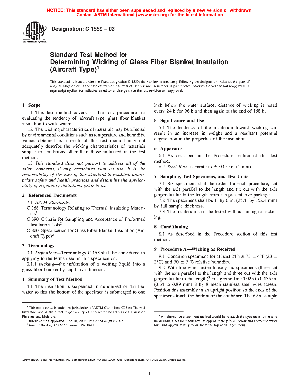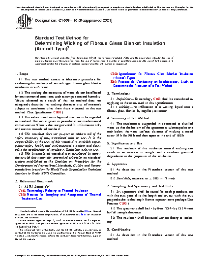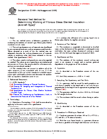 1.1 This test method covers a laboratory procedure for evaluating the tendency of, aircraft type, fibrous glass blanket insulation to wick water.