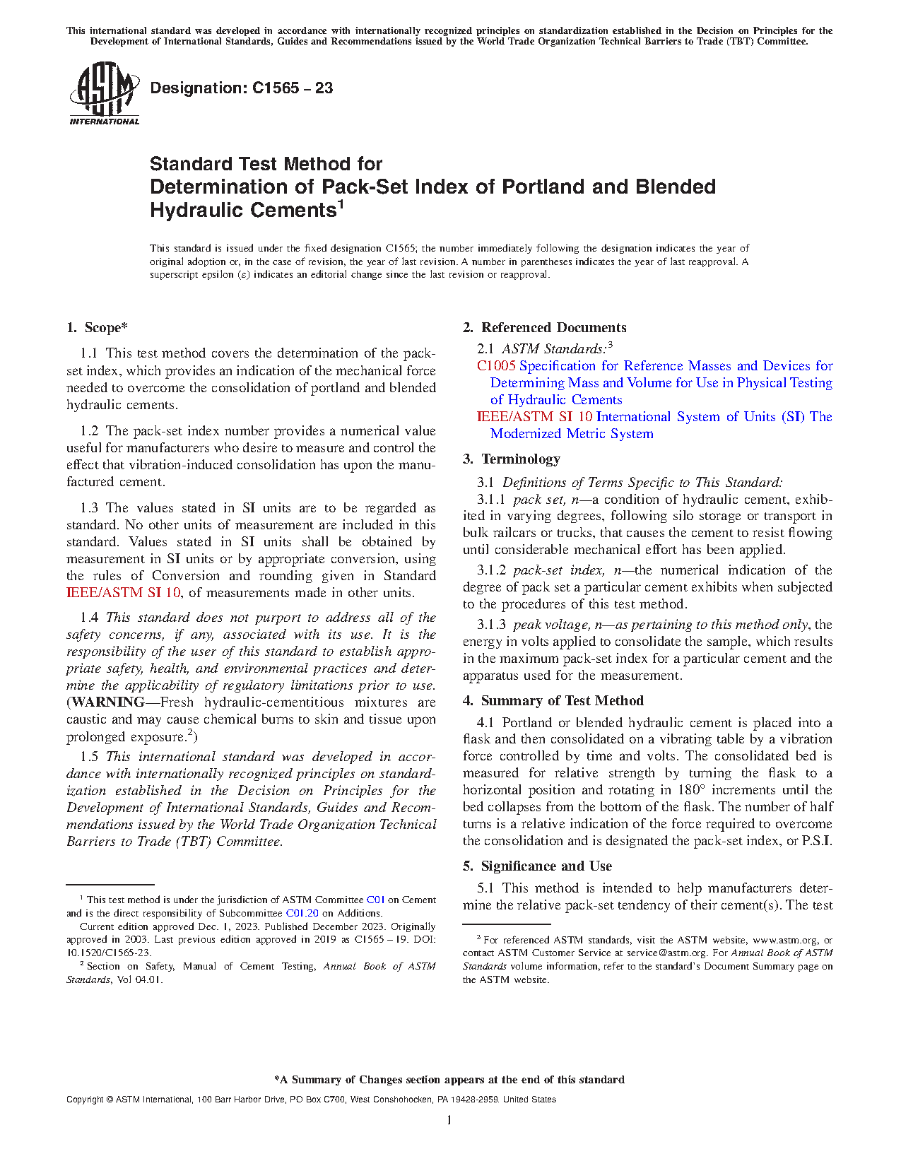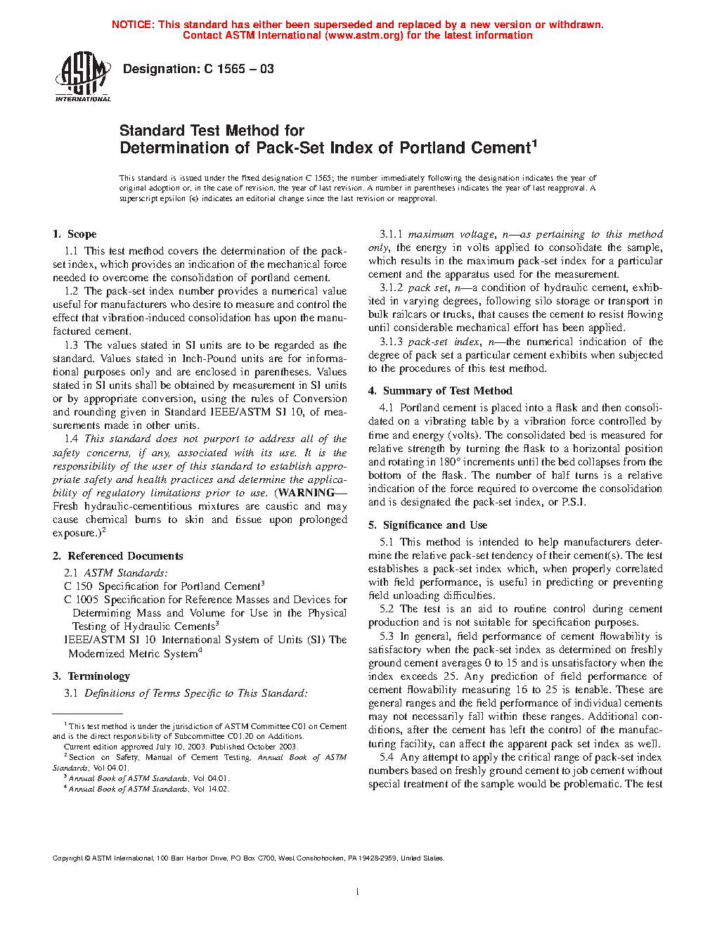 1.1 This test method covers the determination of the pack-set index, which provides an indication of the mechanical force needed to overcome the consolidation of portland cement.
