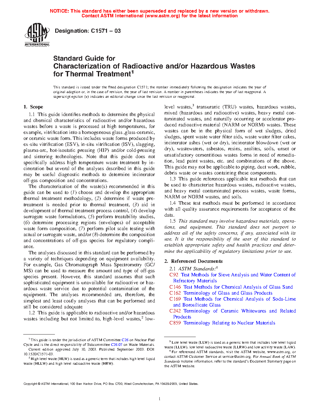 This guide identifies methods to determine the physical and chemical characteristics of a variety of hazardous and/or radioactive wastes including heavy metal contaminated wastes. These wastes can be in the physical form of sludges (wet or dry), spent waste water filter aids, waste water filter cakes, incinerator ashes (wet or dry), incinerator blowdown (wet or dry), asbestos, resins, zeolites, soils, unset or unsatisfactory cementitious waste forms in need of remediation, lead paint wastes, radioactively or non-radioactively contaminated asbestos, geologic mill tailings (also known as byproduct materials) and other naturally occurring or accelerator produced radioactive materials (NORM and NARM), etc. and combinations of the above. This guide may not be applicable to piping, duct work, rubble, debris waste or wastes containing these components.