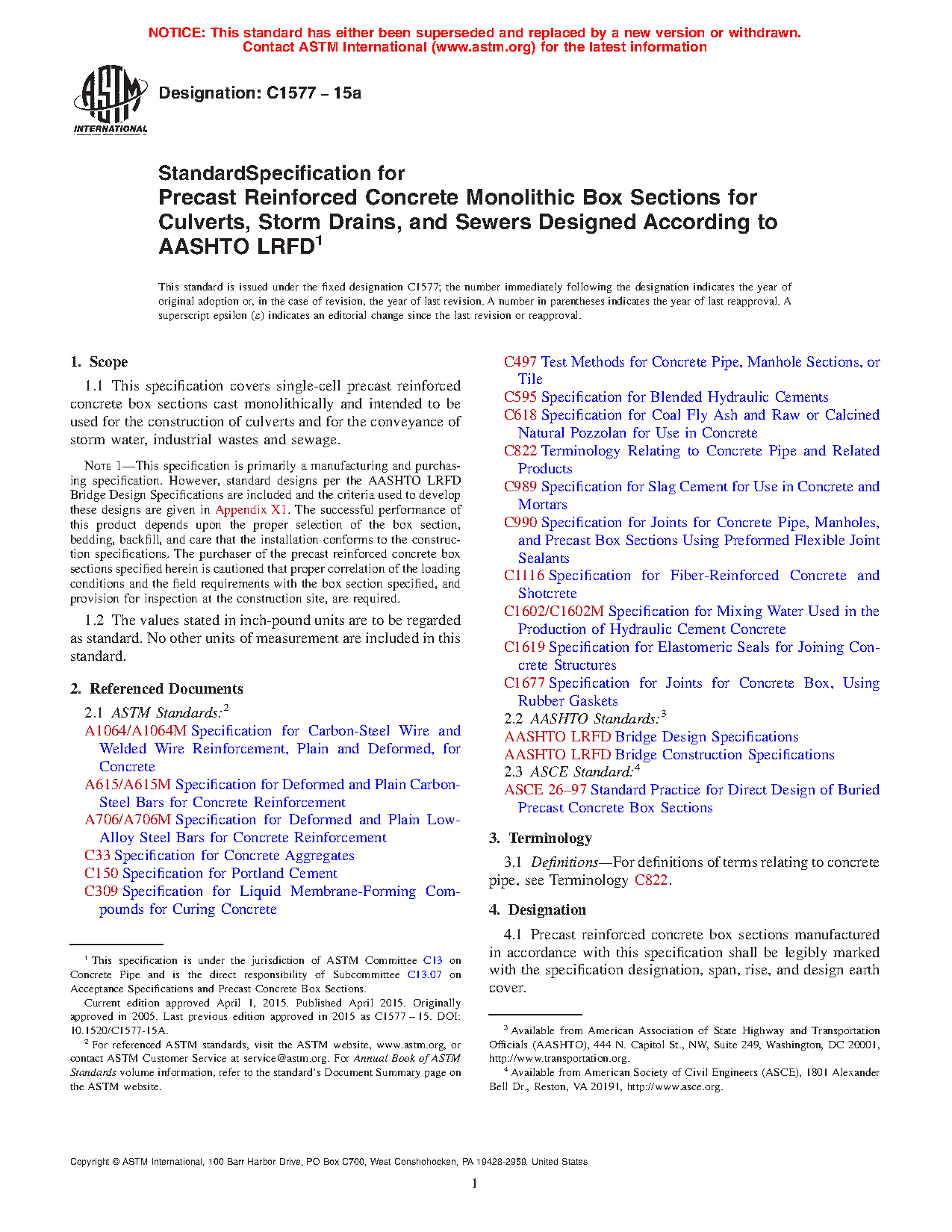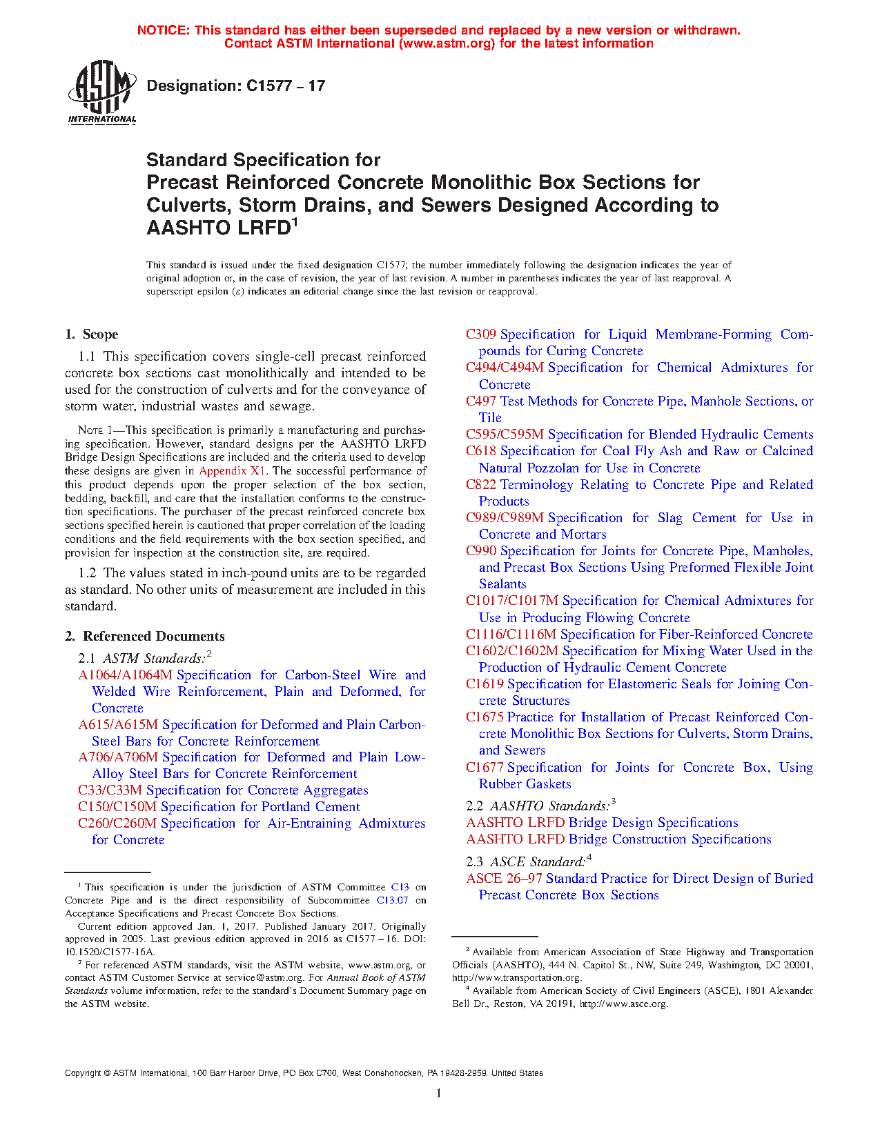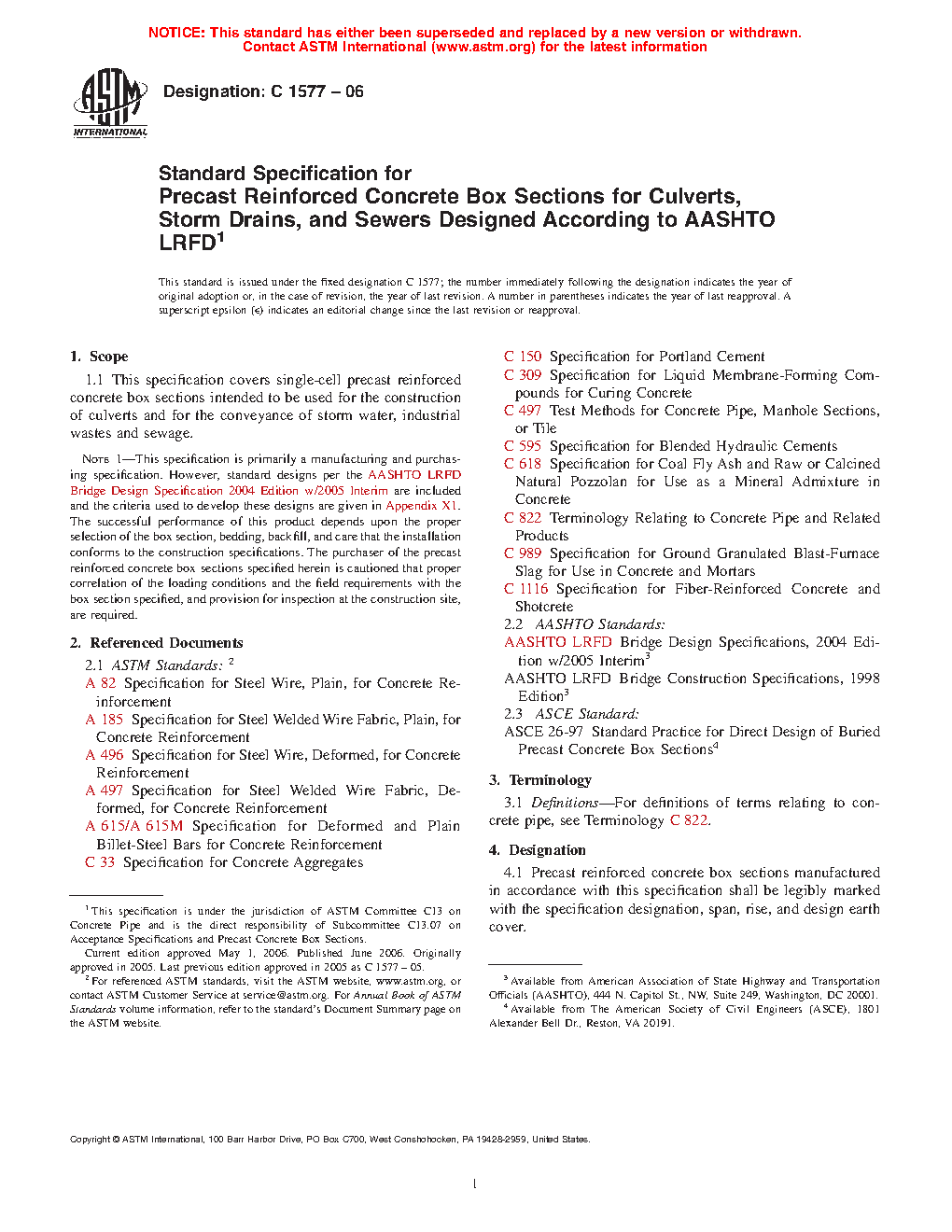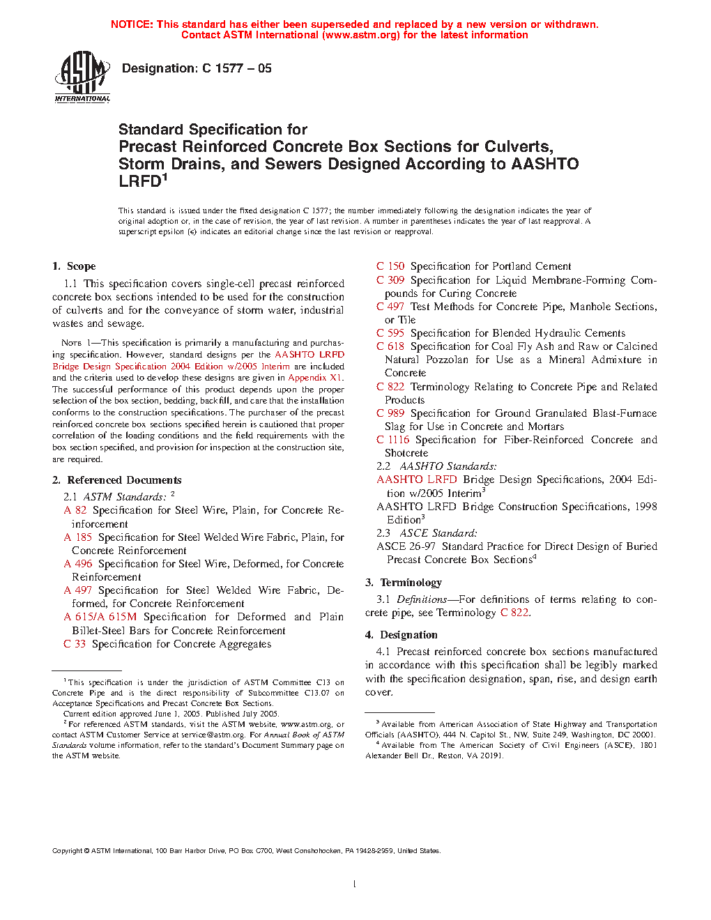 Note 1: This specification is primarily a manufacturing and purchasing specification. However, standard designs per the AASHTO LRFD Bridge Design Specifications are included and the criteria used to develop these designs are given in Appendix X1. The successful performance of this product depends upon the proper selection of the box section, bedding, backfill, and care that the installation conforms to the construction specifications. The purchaser of the precast reinforced concrete box sections specified herein is cautioned that proper correlation of the loading conditions and the field requirements with the box section specified, and provision for inspection at the construction site, are required.