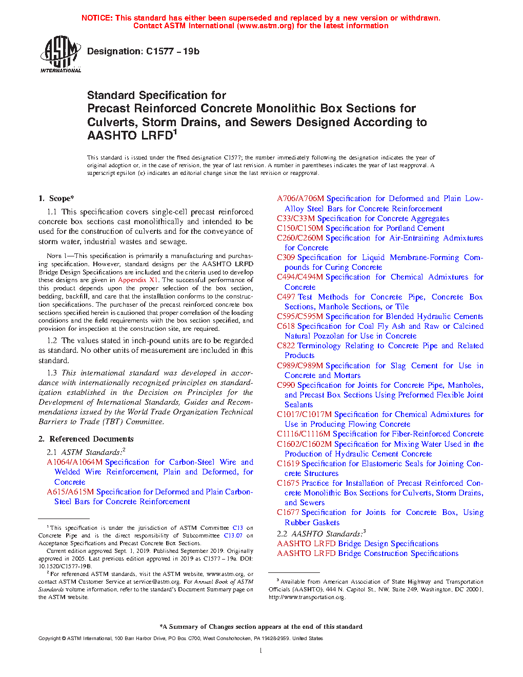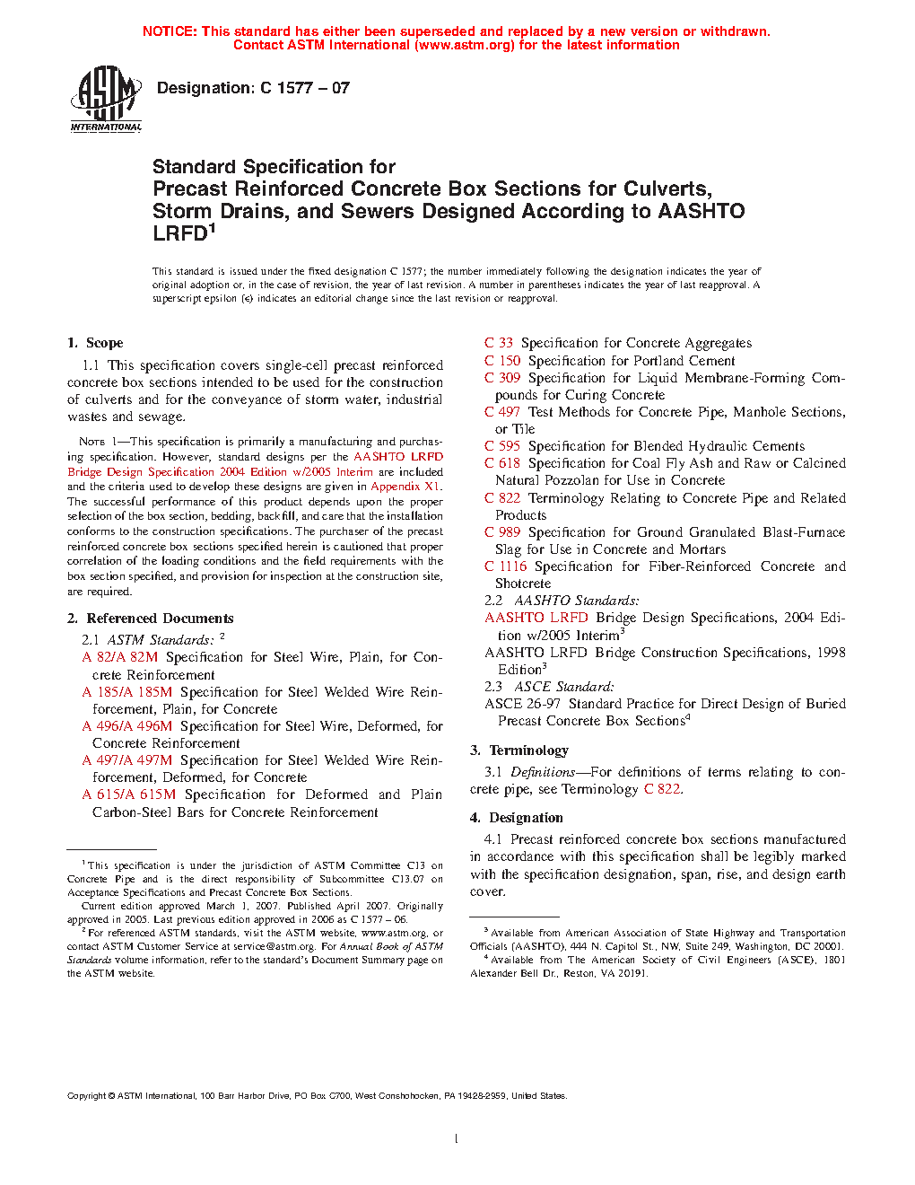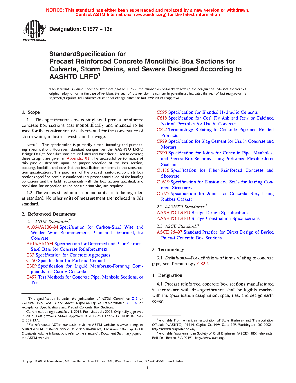 Note 1: This specification is primarily a manufacturing and purchasing specification. However, standard designs per the AASHTO LRFD Bridge Design Specifications are included and the criteria used to develop these designs are given in Appendix X1. The successful performance of this product depends upon the proper selection of the box section, bedding, backfill, and care that the installation conforms to the construction specifications. The purchaser of the precast reinforced concrete box sections specified herein is cautioned that proper correlation of the loading conditions and the field requirements with the box section specified, and provision for inspection at the construction site, are required.
