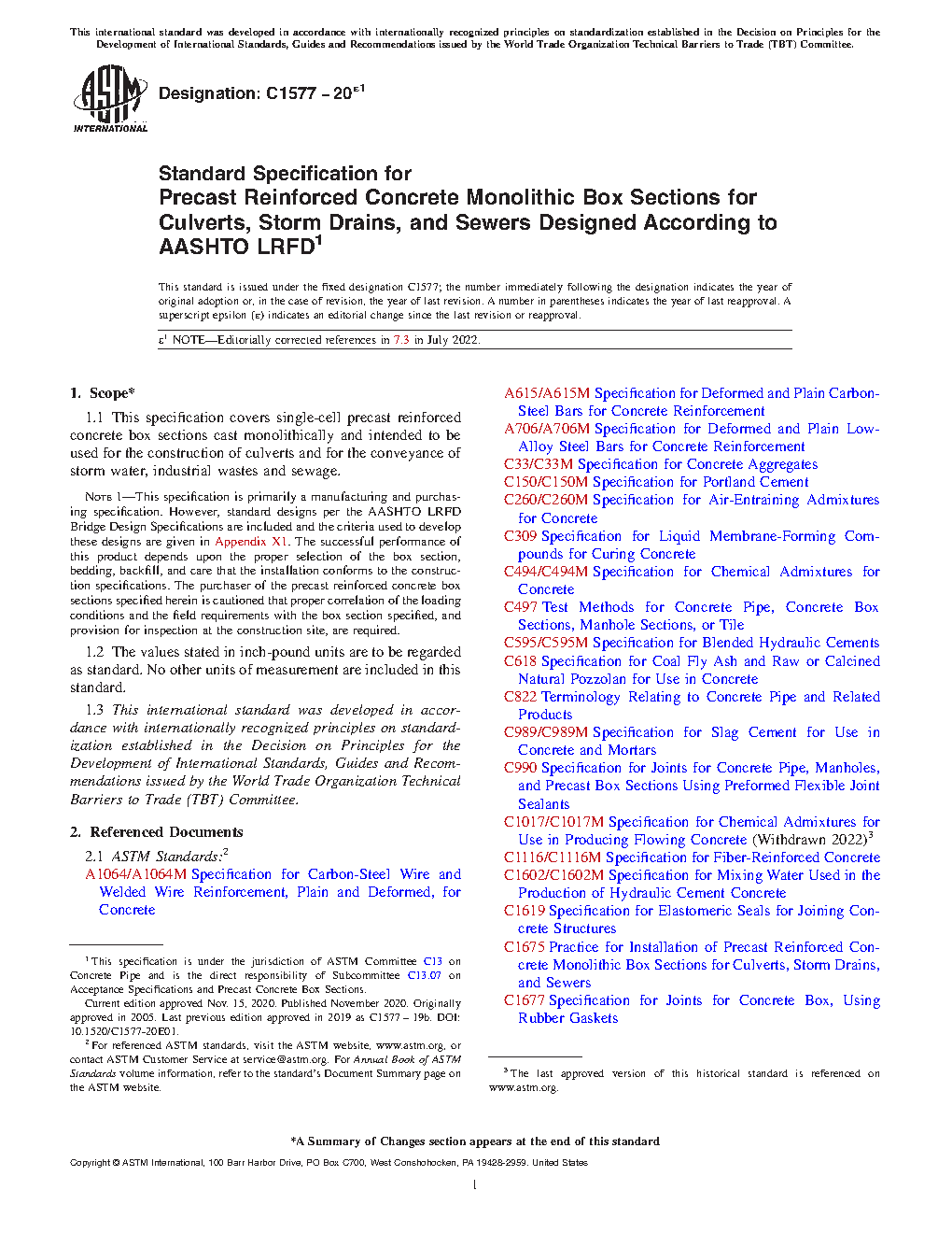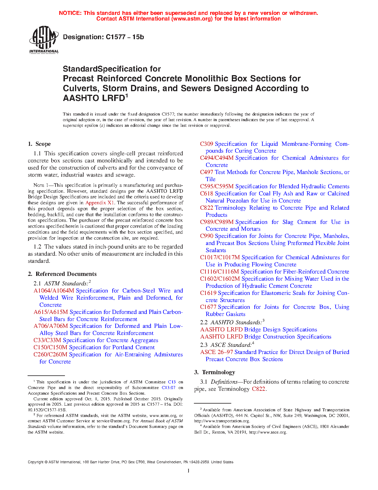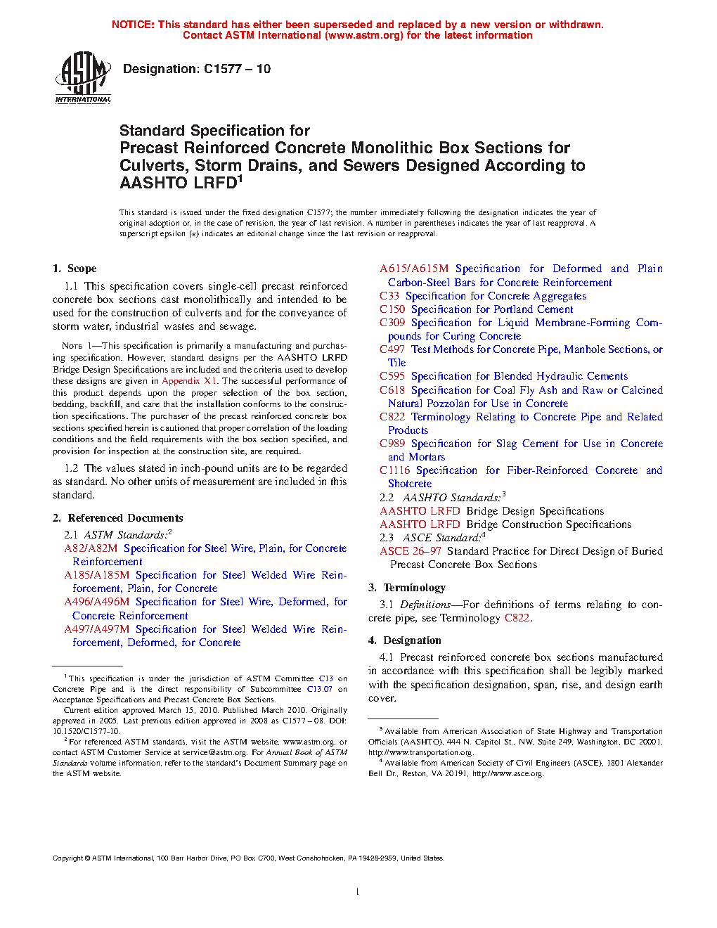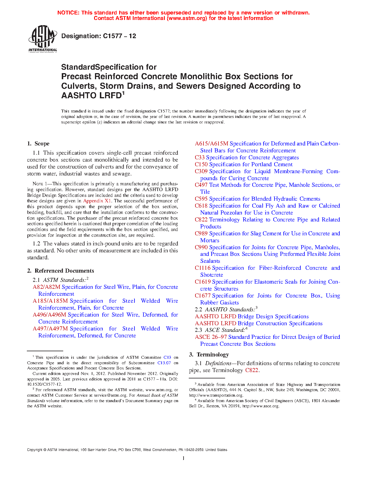 Note 1: This specification is primarily a manufacturing and purchasing specification. However, standard designs per the AASHTO LRFD Bridge Design Specifications are included and the criteria used to develop these designs are given in Appendix X1. The successful performance of this product depends upon the proper selection of the box section, bedding, backfill, and care that the installation conforms to the construction specifications. The purchaser of the precast reinforced concrete box sections specified herein is cautioned that proper correlation of the loading conditions and the field requirements with the box section specified, and provision for inspection at the construction site, are required.