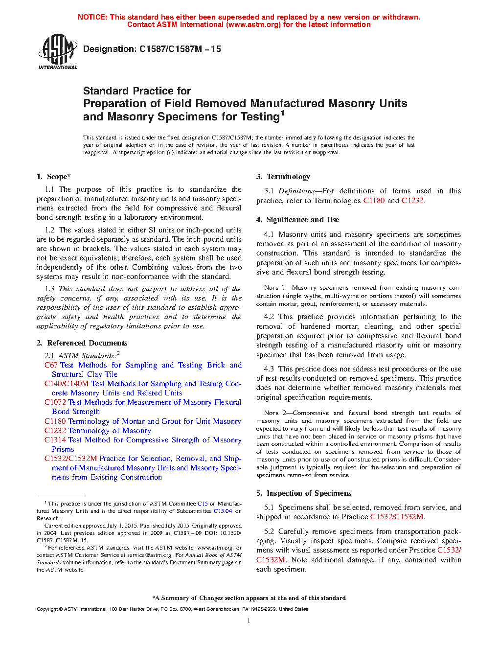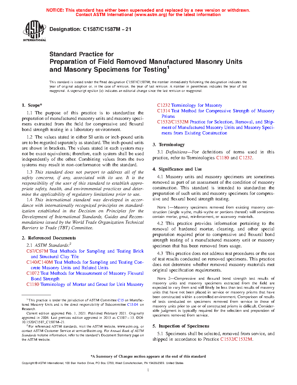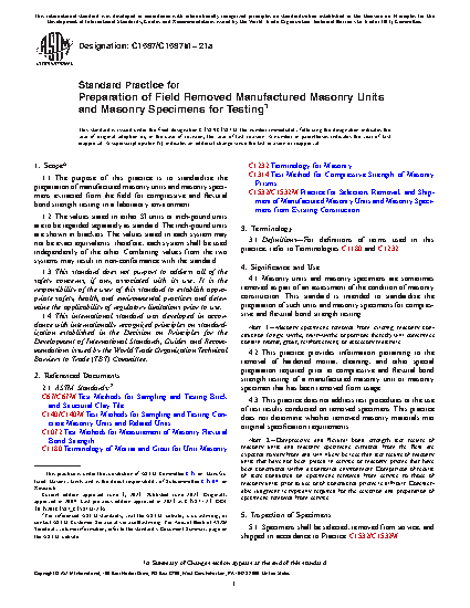 4.3 This practice does not address test procedures or the use of test results conducted on removed specimens. This practice does not determine whether removed masonry materials met original specification requirements.