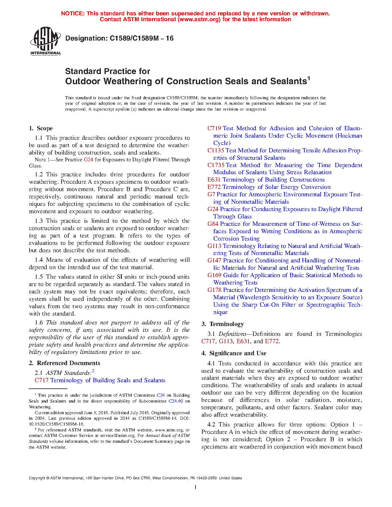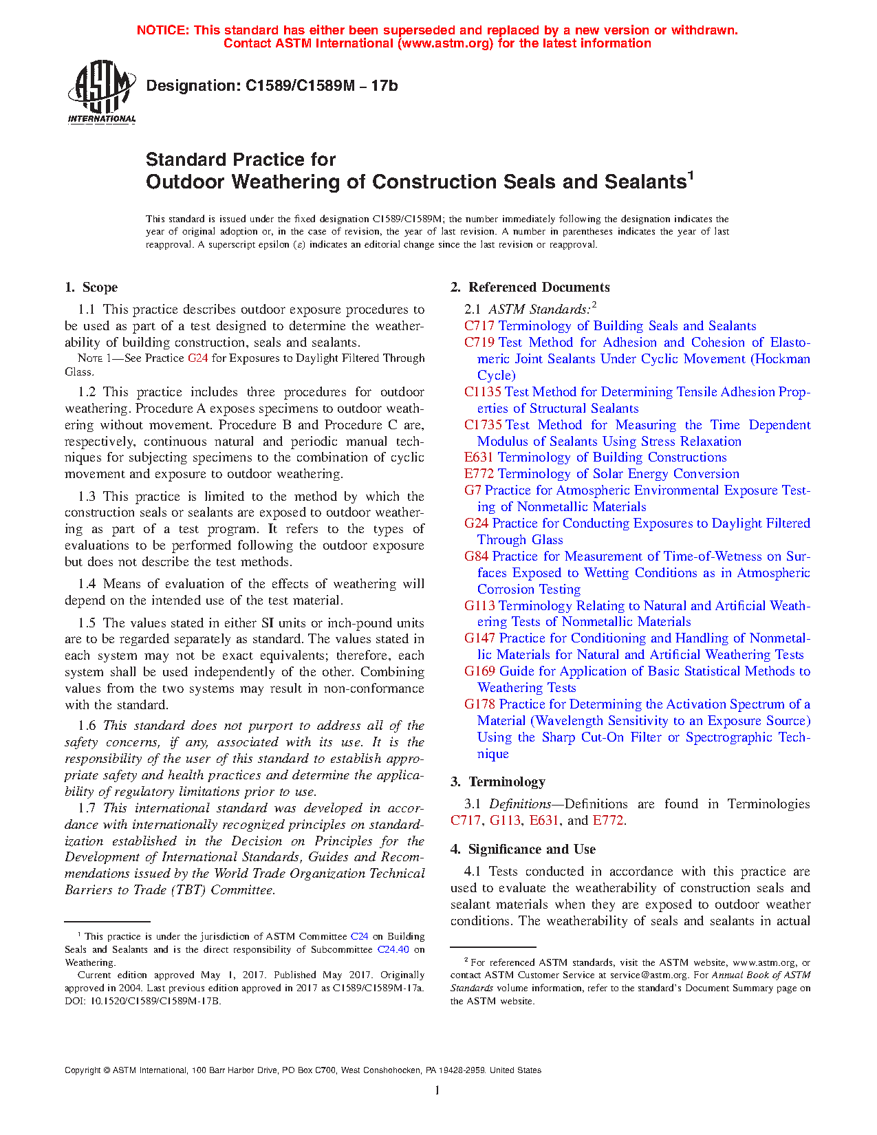 1.3 This practice is limited to the method by which the construction seals or sealants are exposed to outdoor weathering as part of a test program. It refers to the types of evaluations to be performed following the outdoor exposure but does not describe the test methods.