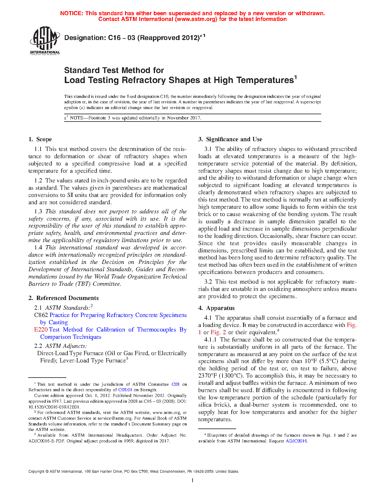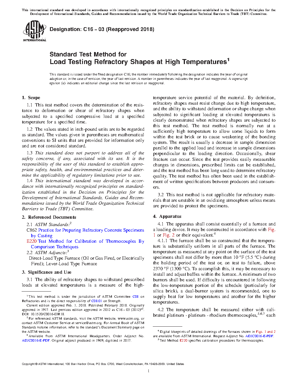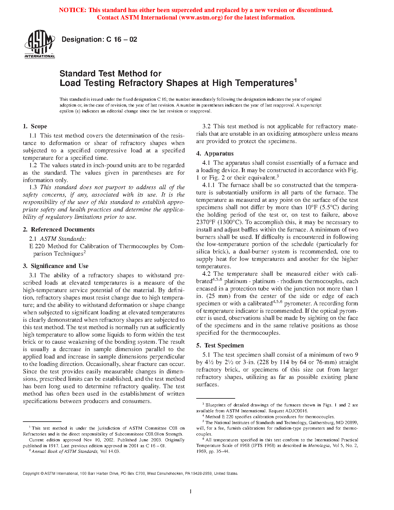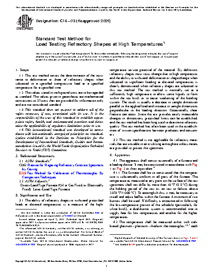 3.1 The ability of refractory shapes to withstand prescribed loads at elevated temperatures is a measure of the high-temperature service potential of the material. By definition, refractory shapes must resist change due to high temperature, and the ability to withstand deformation or shape change when subjected to significant loading at elevated temperatures is clearly demonstrated when refractory shapes are subjected to this test method. The test method is normally run at a sufficiently high temperature to allow some liquids to form within the test brick or to cause weakening of the bonding system. The result is usually a decrease in sample dimension parallel to the applied load and increase in sample dimensions perpendicular to the loading direction. Occasionally, shear fracture can occur. Since the test provides easily measurable changes in dimensions, prescribed limits can be established, and the test method has been long used to determine refractory quality. The test method has often been used in the establishment of written specifications between producers and consumers.