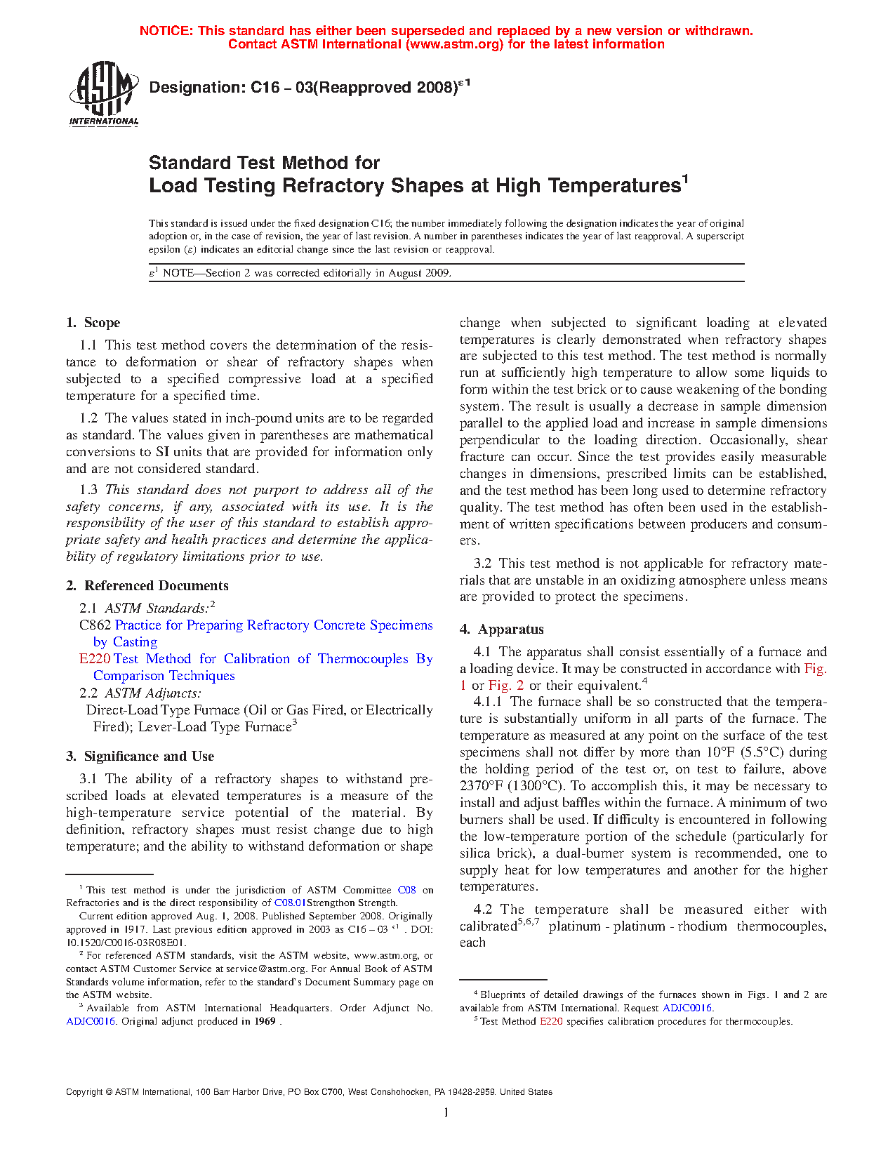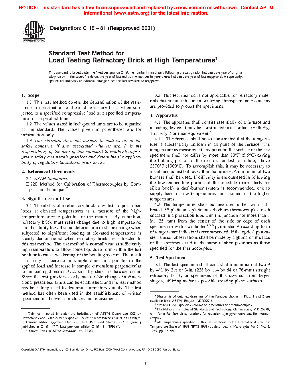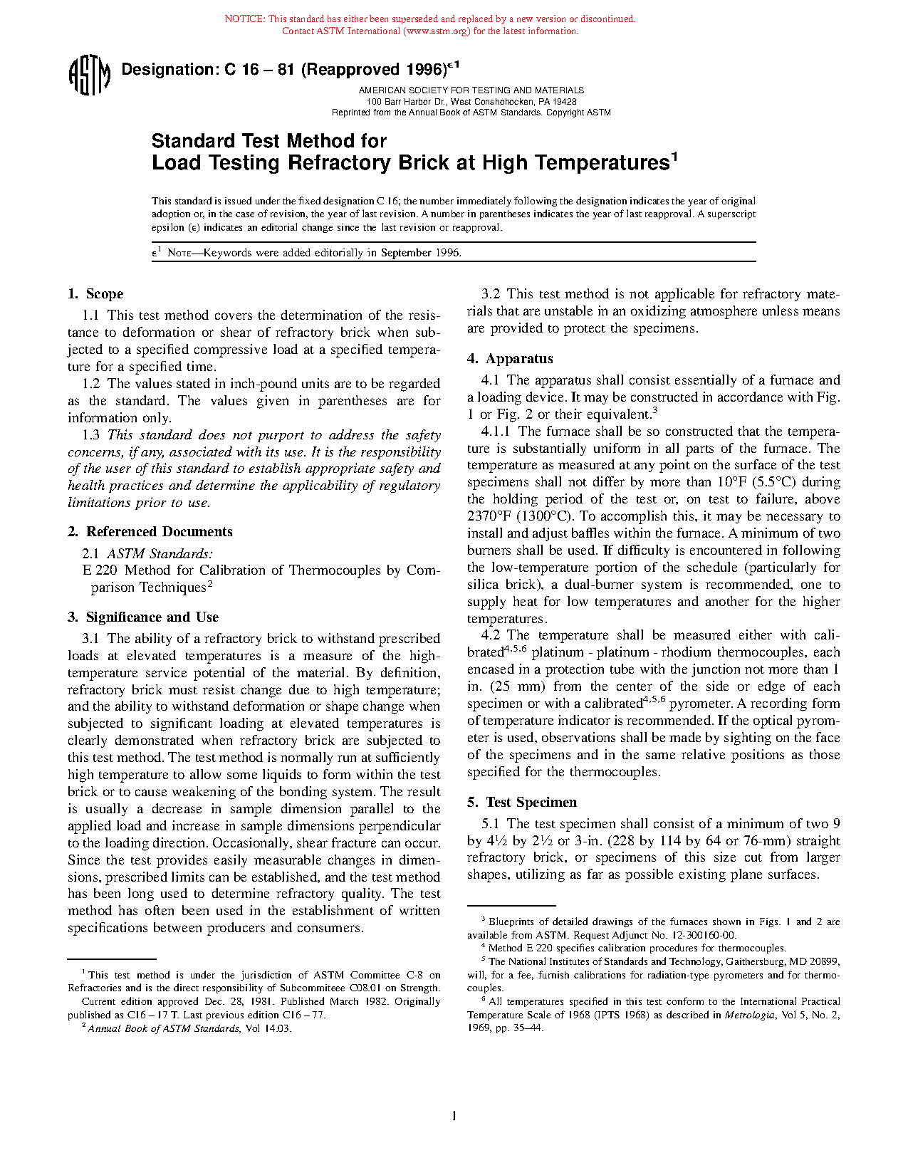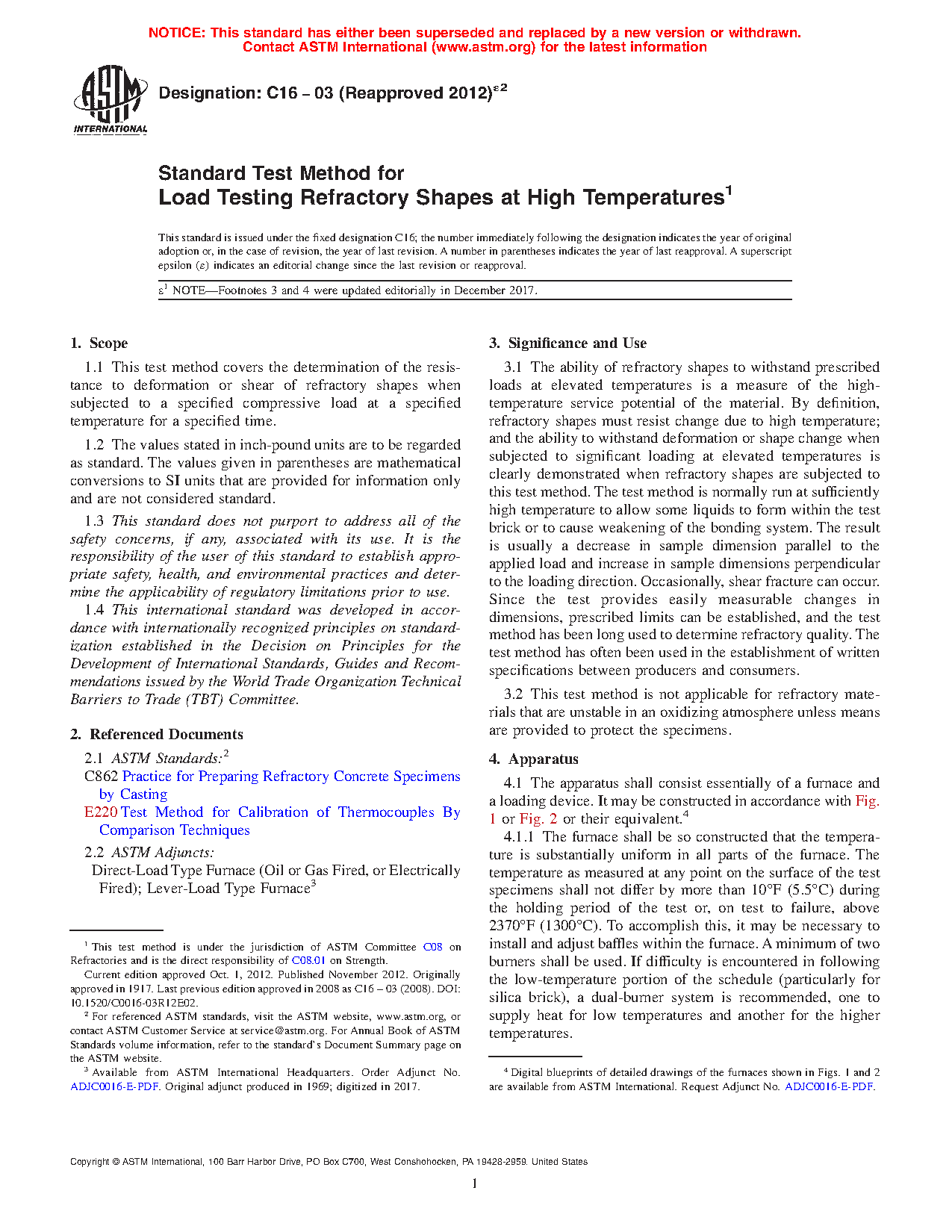 3.1 The ability of refractory shapes to withstand prescribed loads at elevated temperatures is a measure of the high-temperature service potential of the material. By definition, refractory shapes must resist change due to high temperature, and the ability to withstand deformation or shape change when subjected to significant loading at elevated temperatures is clearly demonstrated when refractory shapes are subjected to this test method. The test method is normally run at a sufficiently high temperature to allow some liquids to form within the test brick or to cause weakening of the bonding system. The result is usually a decrease in sample dimension parallel to the applied load and increase in sample dimensions perpendicular to the loading direction. Occasionally, shear fracture can occur. Since the test provides easily measurable changes in dimensions, prescribed limits can be established, and the test method has been long used to determine refractory quality. The test method has often been used in the establishment of written specifications between producers and consumers.