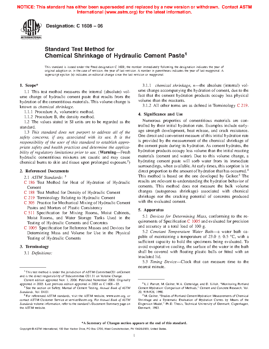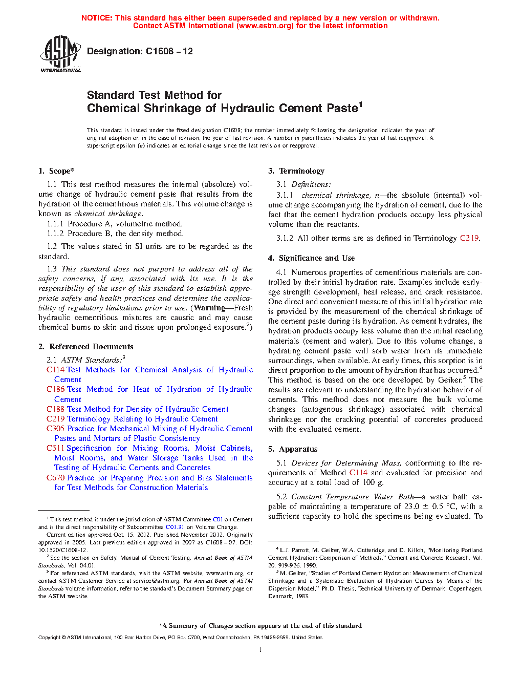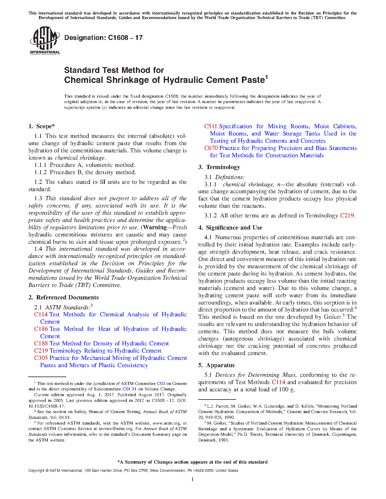 1.1 This test method measures the internal (absolute) volume change of hydraulic cement paste that results from the hydration of the cementitious materials. This volume change is known as chemical shrinkage.