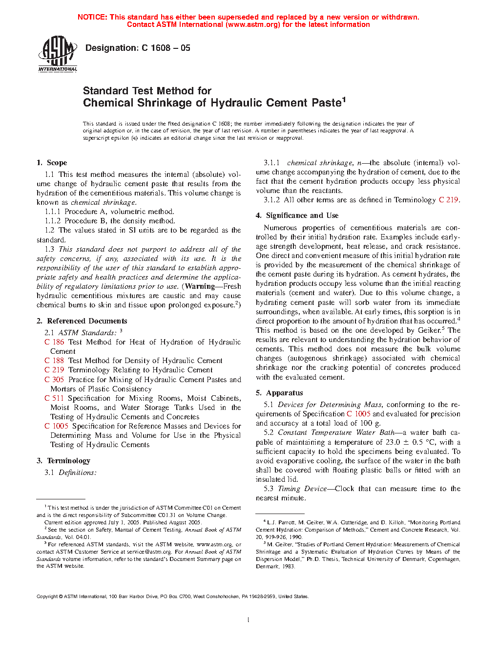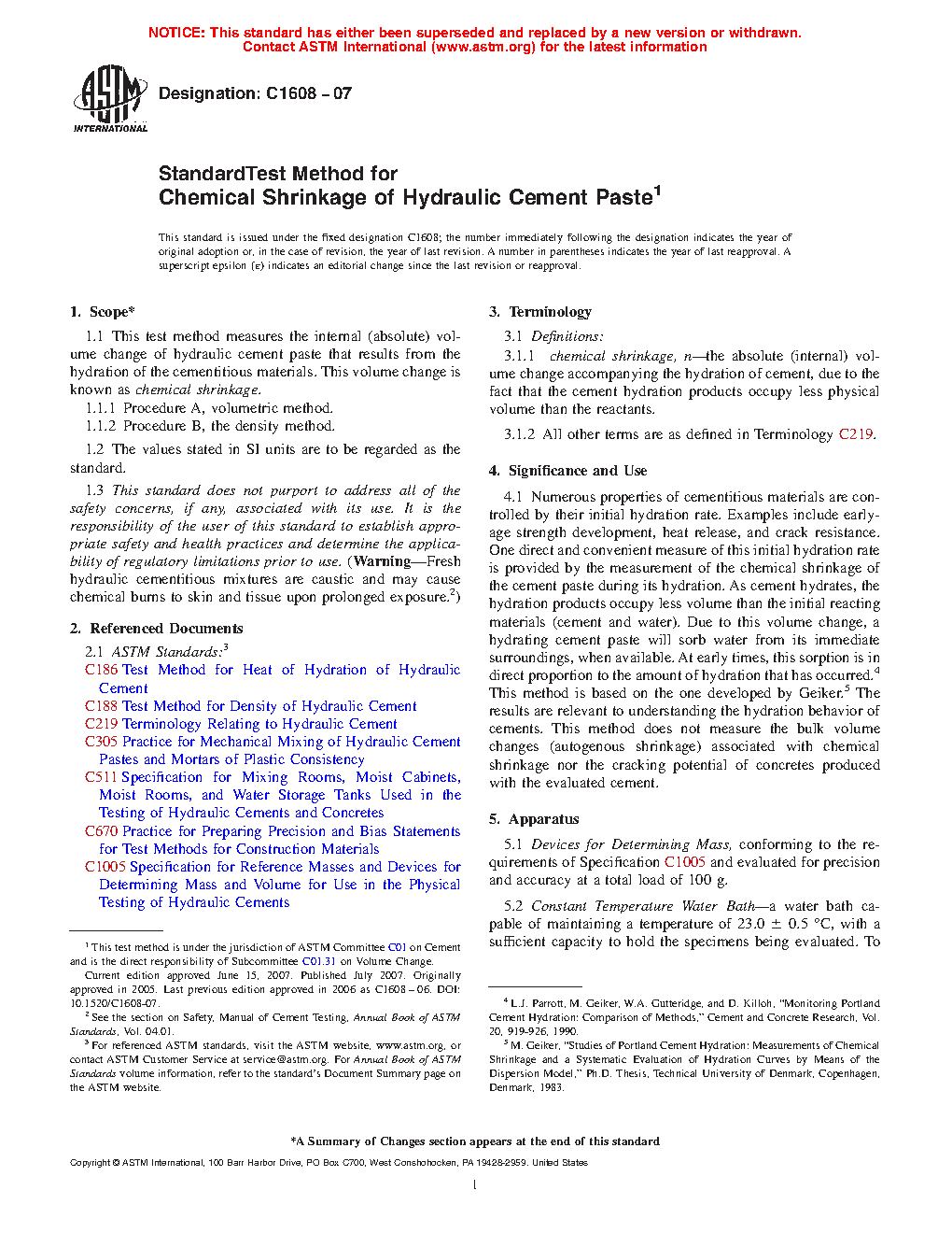 4.1 Numerous properties of cementitious materials are controlled by their initial hydration rate. Examples include early-age strength development, heat release, and crack resistance. One direct and convenient measure of this initial hydration rate is provided by the measurement of the chemical shrinkage of the cement paste during its hydration. As cement hydrates, the hydration products occupy less volume than the initial reacting materials (cement and water). Due to this volume change, a hydrating cement paste will sorb water from its immediate surroundings, when available. At early times, this sorption is in direct proportion to the amount of hydration that has occurred.5 This method is based on the one developed by Geiker.6 The results are relevant to understanding the hydration behavior of cements. This method does not measure the bulk volume changes (autogenous shrinkage) associated with chemical shrinkage nor the cracking potential of concretes produced with the evaluated cement.