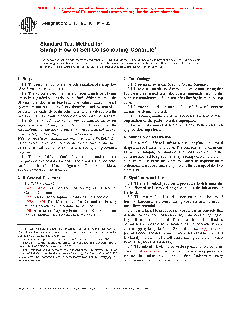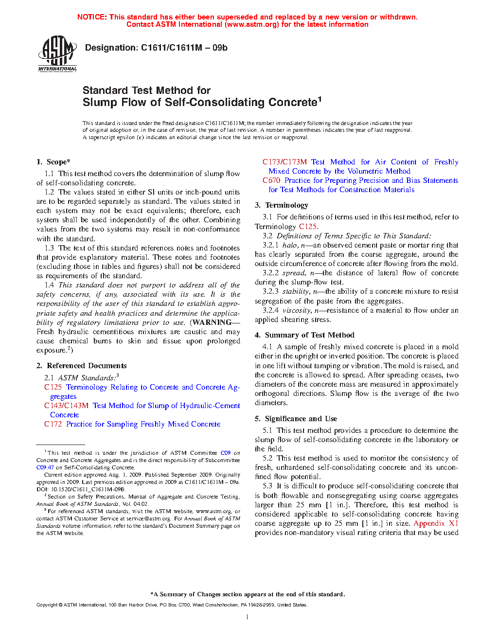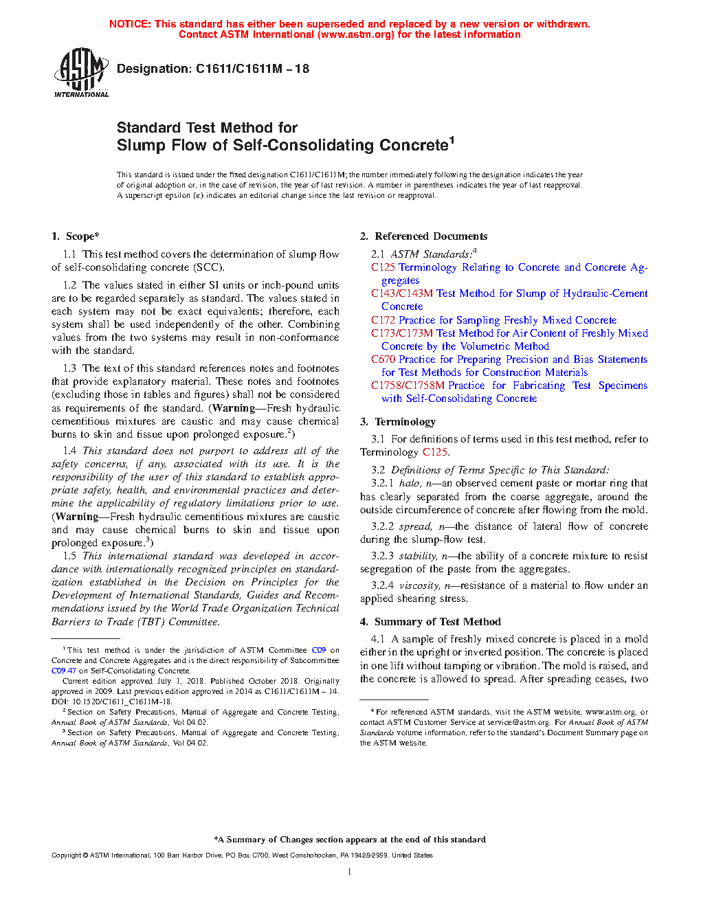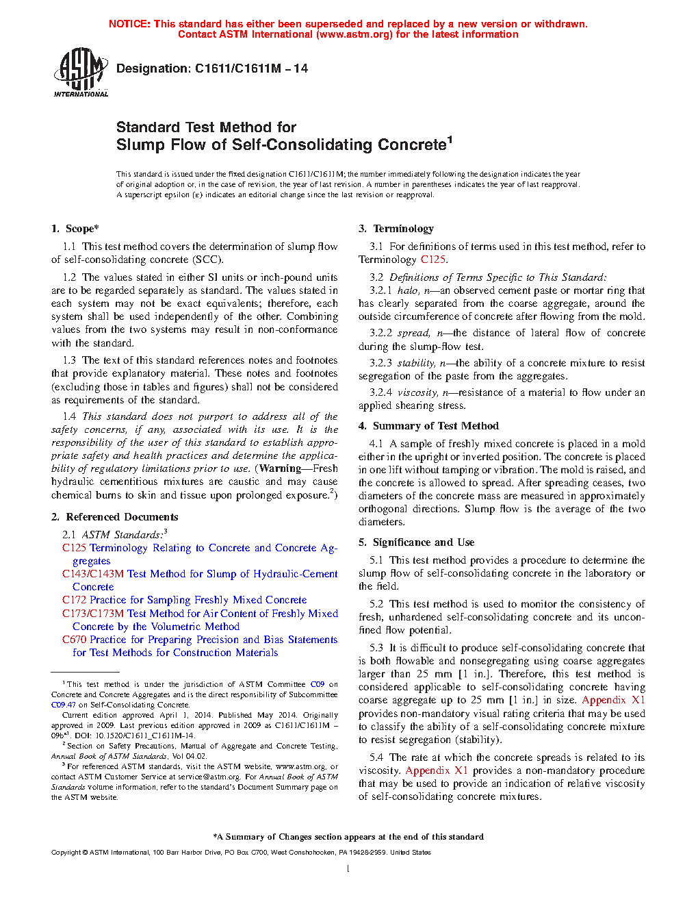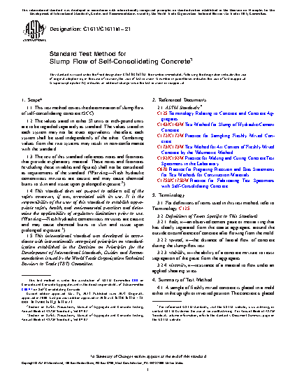This test method provides a procedure to determine the slump flow of self-consolidating concrete in the laboratory or the field.