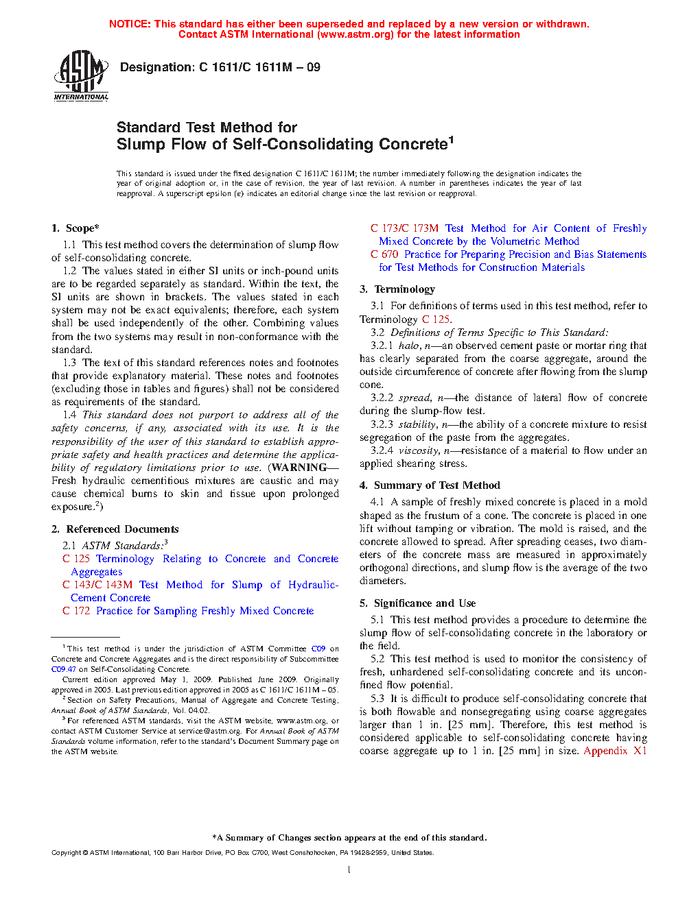 5.4 The rate at which the concrete spreads is related to its viscosity. Appendix X1 provides a non-mandatory procedure that may be used to provide an indication of relative viscosity of self-consolidating concrete mixtures.