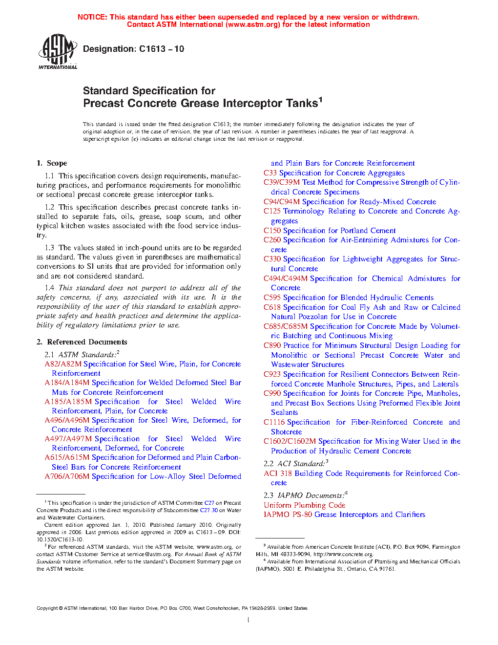 1.1 This specification covers design requirements, manufacturing practices, and performance requirements for monolithic or sectional precast concrete grease interceptor tanks.