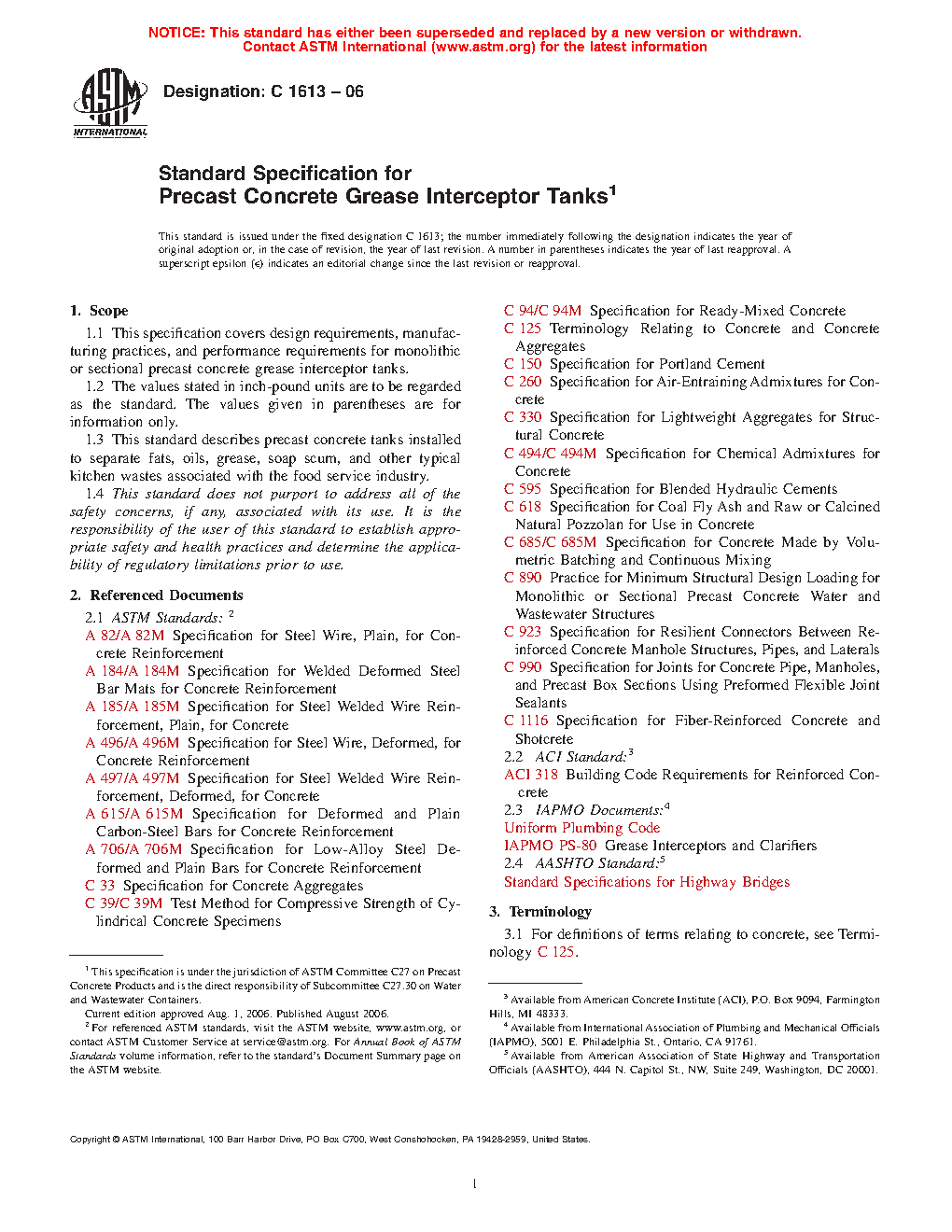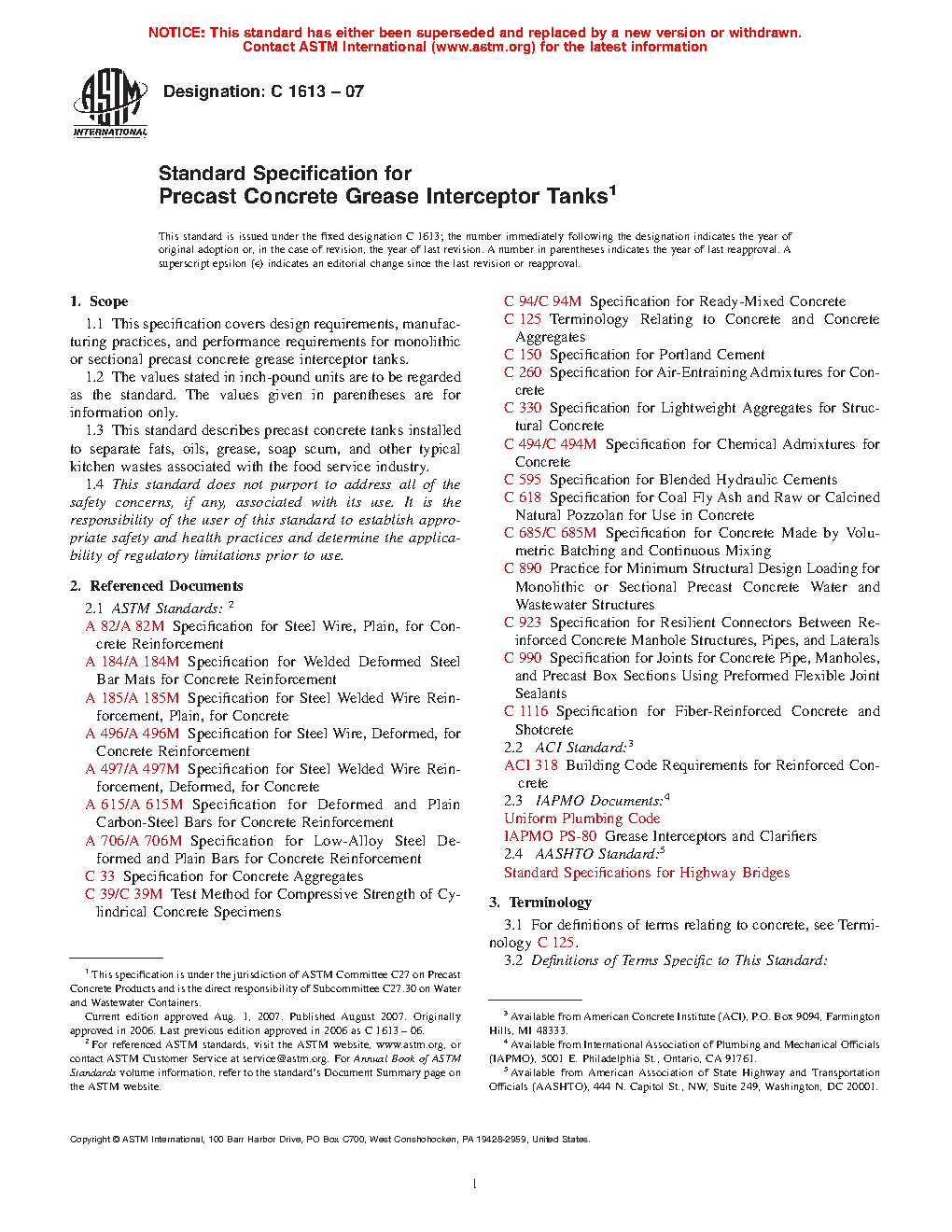 This specification covers design requirements, manufacturing practices, and performance requirements for monolithic or sectional precast concrete grease interceptor tanks. This standard describes precast concrete tanks installed to separate fats, oils, grease, soap scum, and other typical kitchen wastes associated with the food service industry. The different materials and manufacturing practices of precast concrete grease interceptor tanks are presented in details. Structural design of grease interceptor tanks shall be by calculation or by performance. The different structural design requirement of grease interceptor tanks includes; concrete strength, reinforcing steel placement, and openings. The different physical design requirements of grease interceptor tanks includes; capacity, shape, compartments, inlet and outlet pipes, baffles and outlet devices, and top slab openings. Testing for watertightness shall be performed using either vacuum testing or hydrostatic testing.