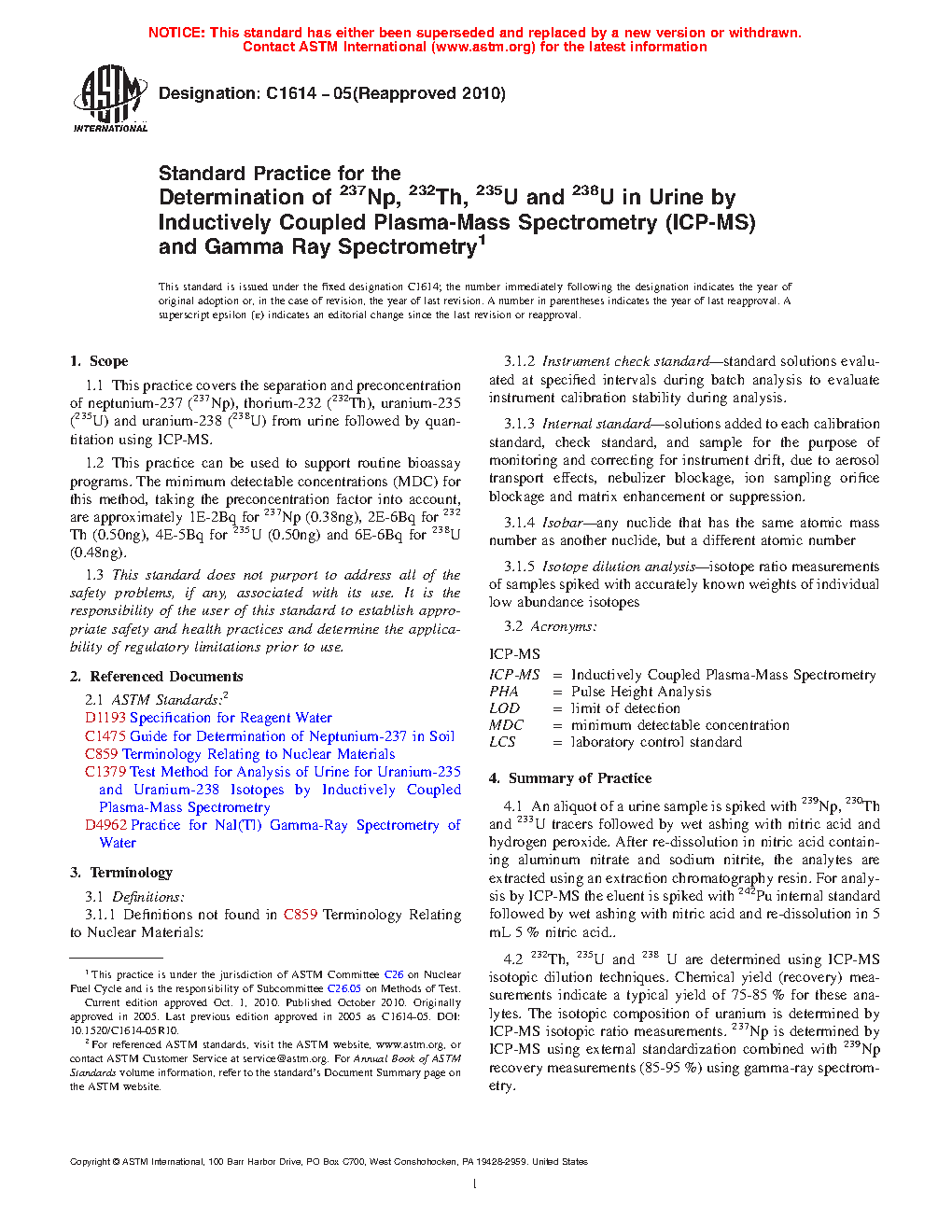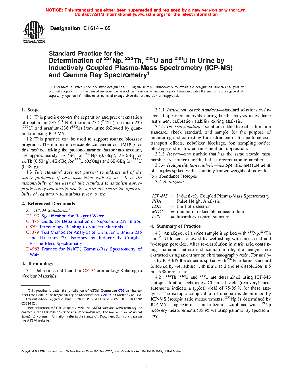 1.1 This practice covers the separation and preconcentration of neptunium-237 (237Np), thorium-232 (232Th), uranium-235 (235U) and uranium-238 (238U) from urine followed by quantitation using ICP-MS.