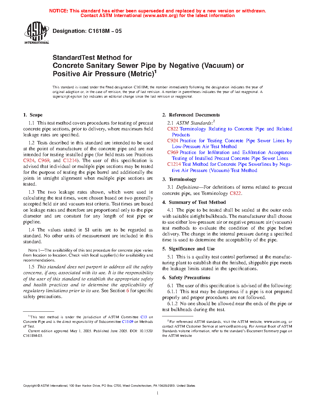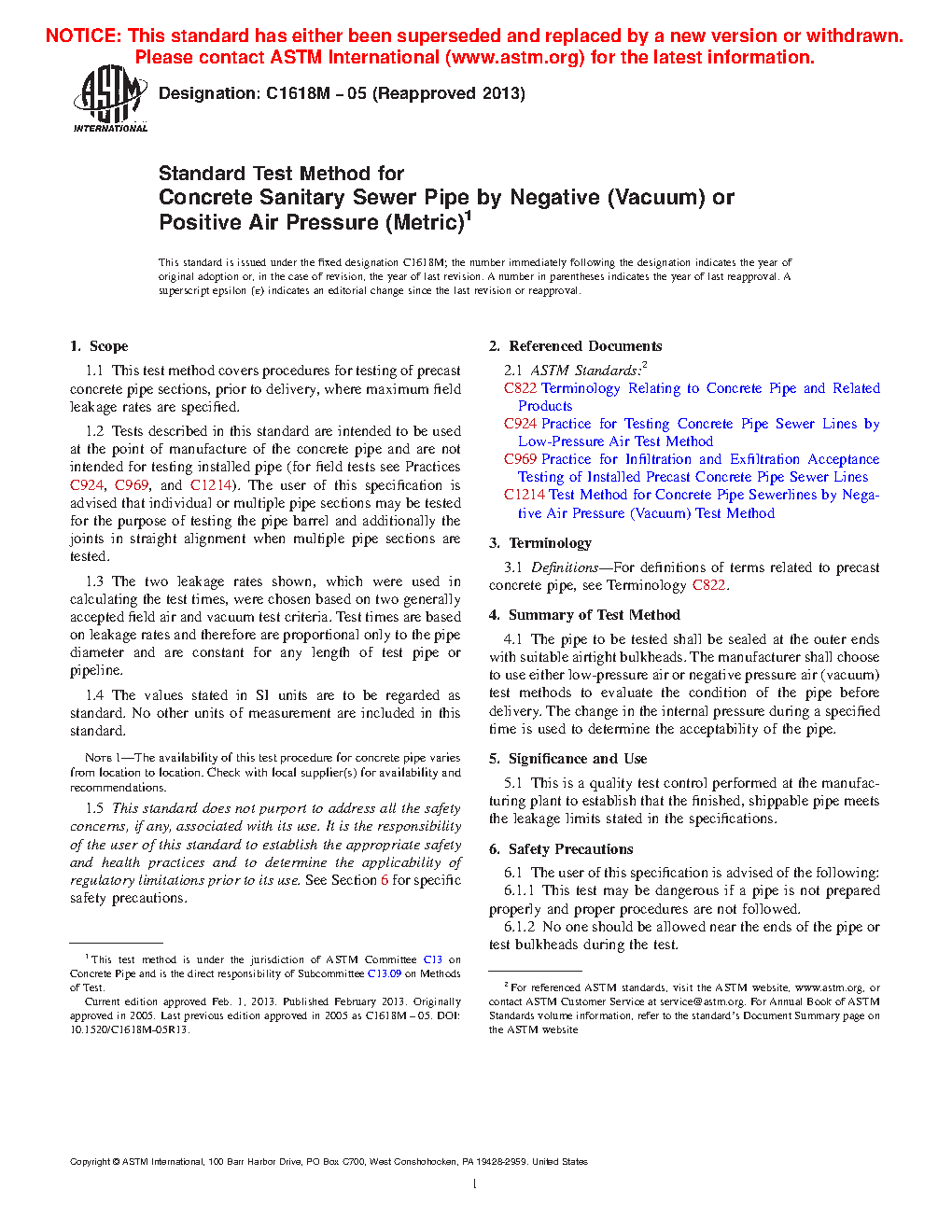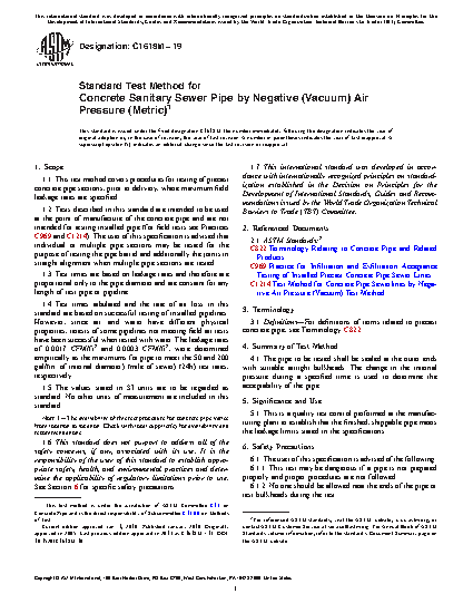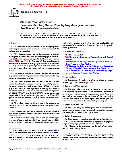 1.1 This test method covers procedures for testing of precast concrete pipe sections, prior to delivery, where maximum field leakage rates are specified.