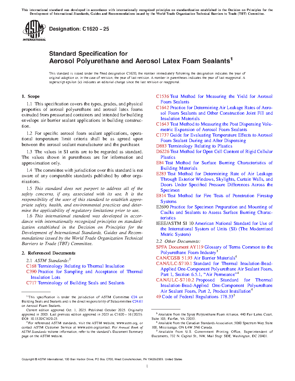 1.1 This specification covers the types, grades, and physical properties of aerosol polyurethane and aerosol latex foams extruded from pressurized containers and intended for building envelope air barrier sealant applications in building construction.