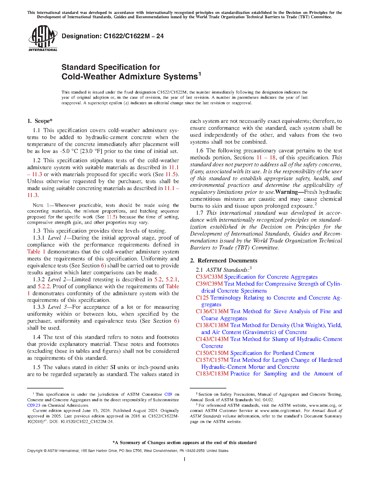 1.1 This specification covers cold-weather admixture systems to be added to hydraulic-cement concrete when the temperature of the concrete immediately after placement will be as low as 23.0 F [-5.0 C].