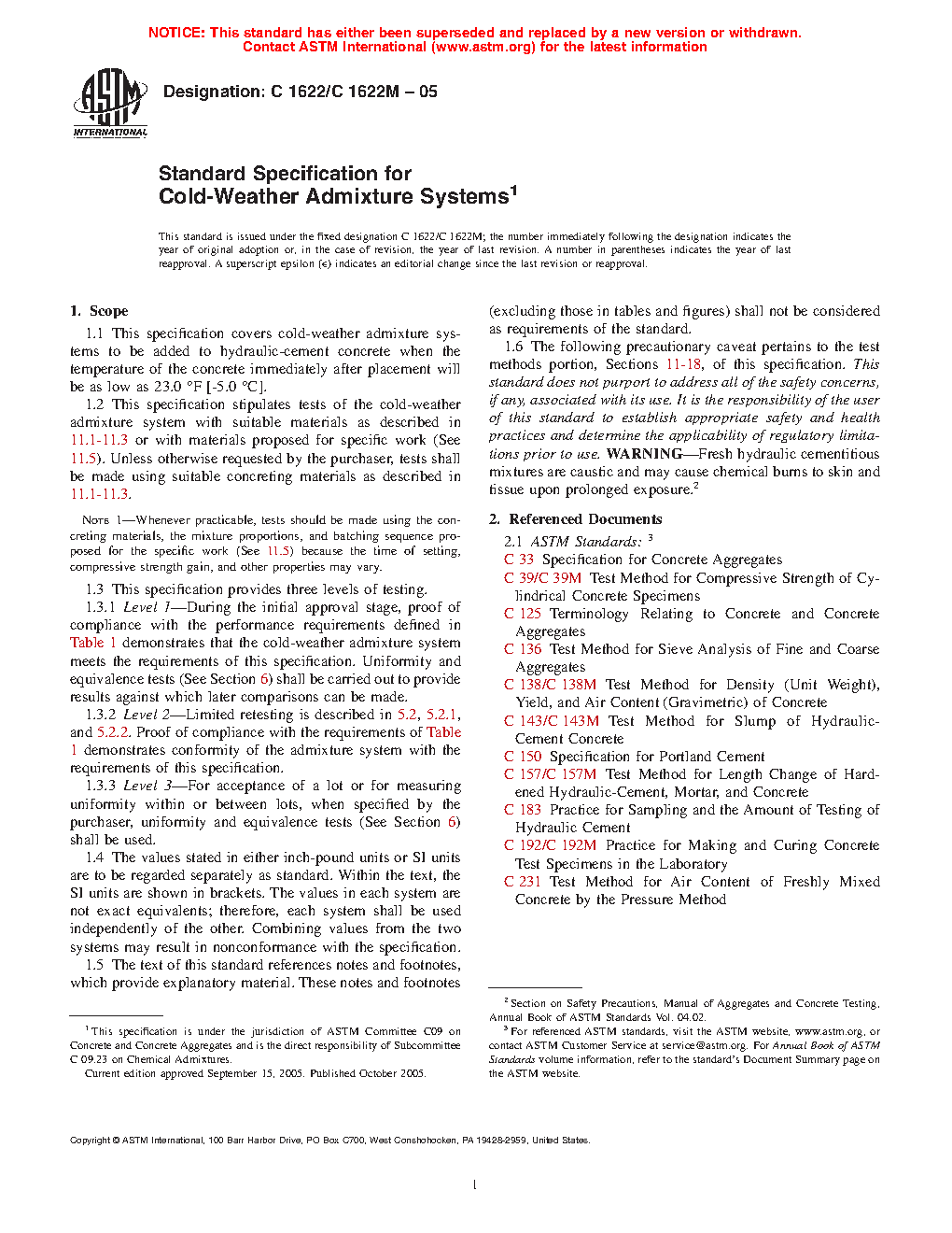 1.1 This specification covers cold-weather admixture systems to be added to hydraulic-cement concrete when the temperature of the concrete immediately after placement will be as low as -5.0 °C [23.0 °F] prior to the time of initial set.