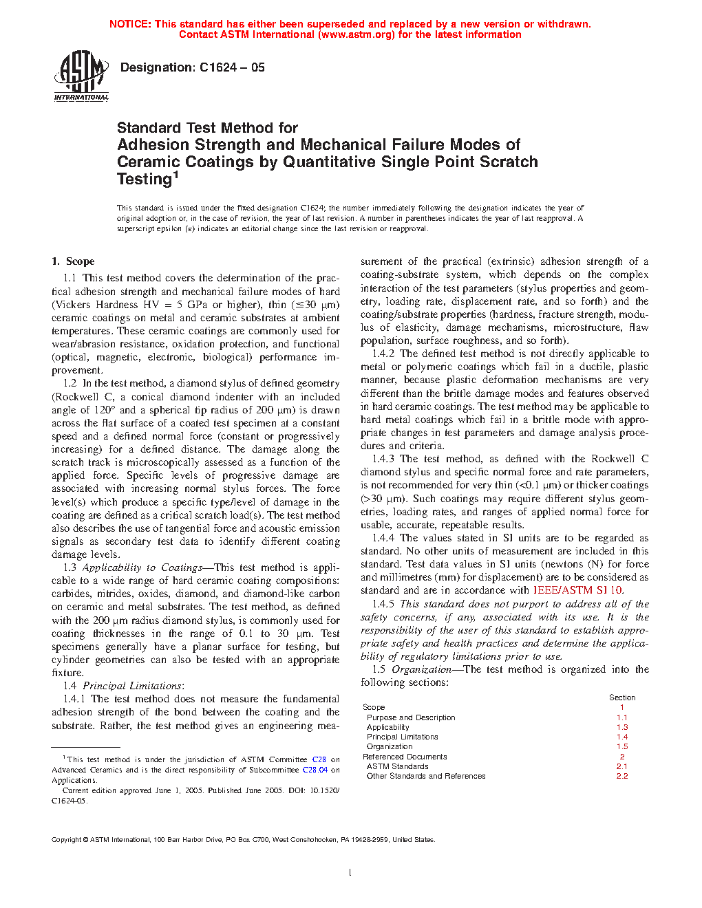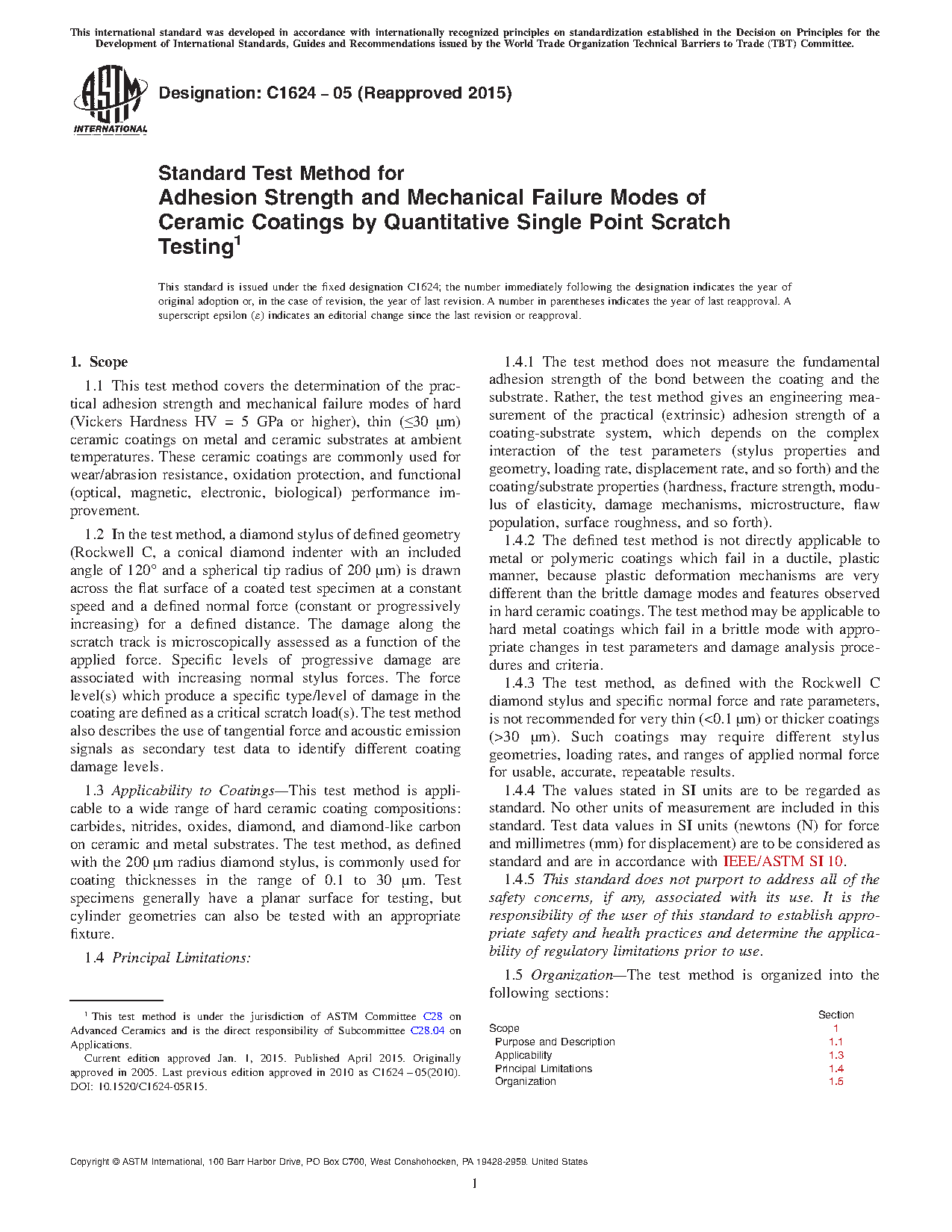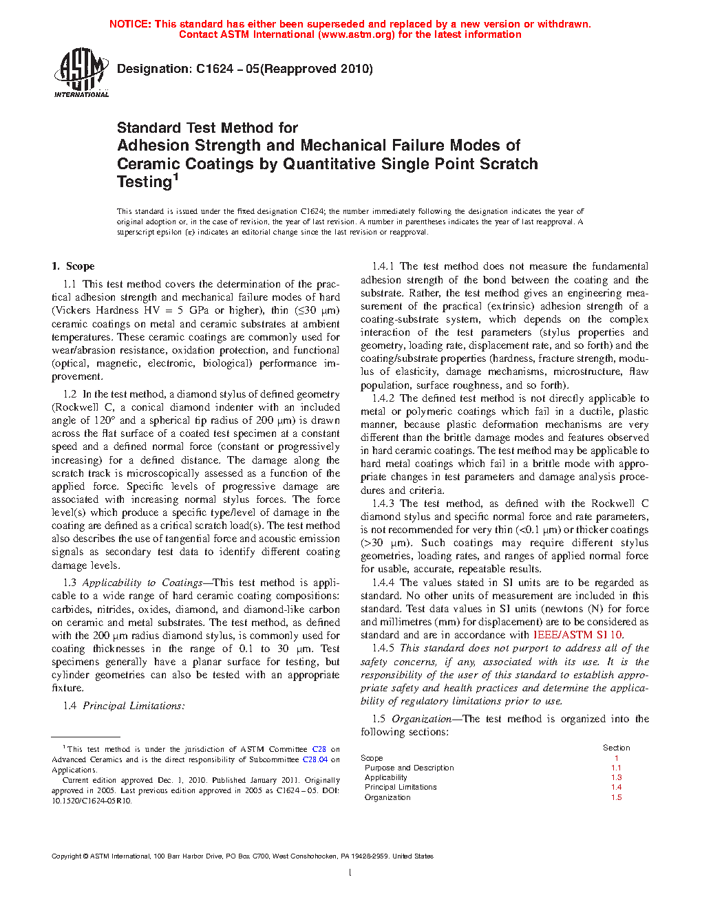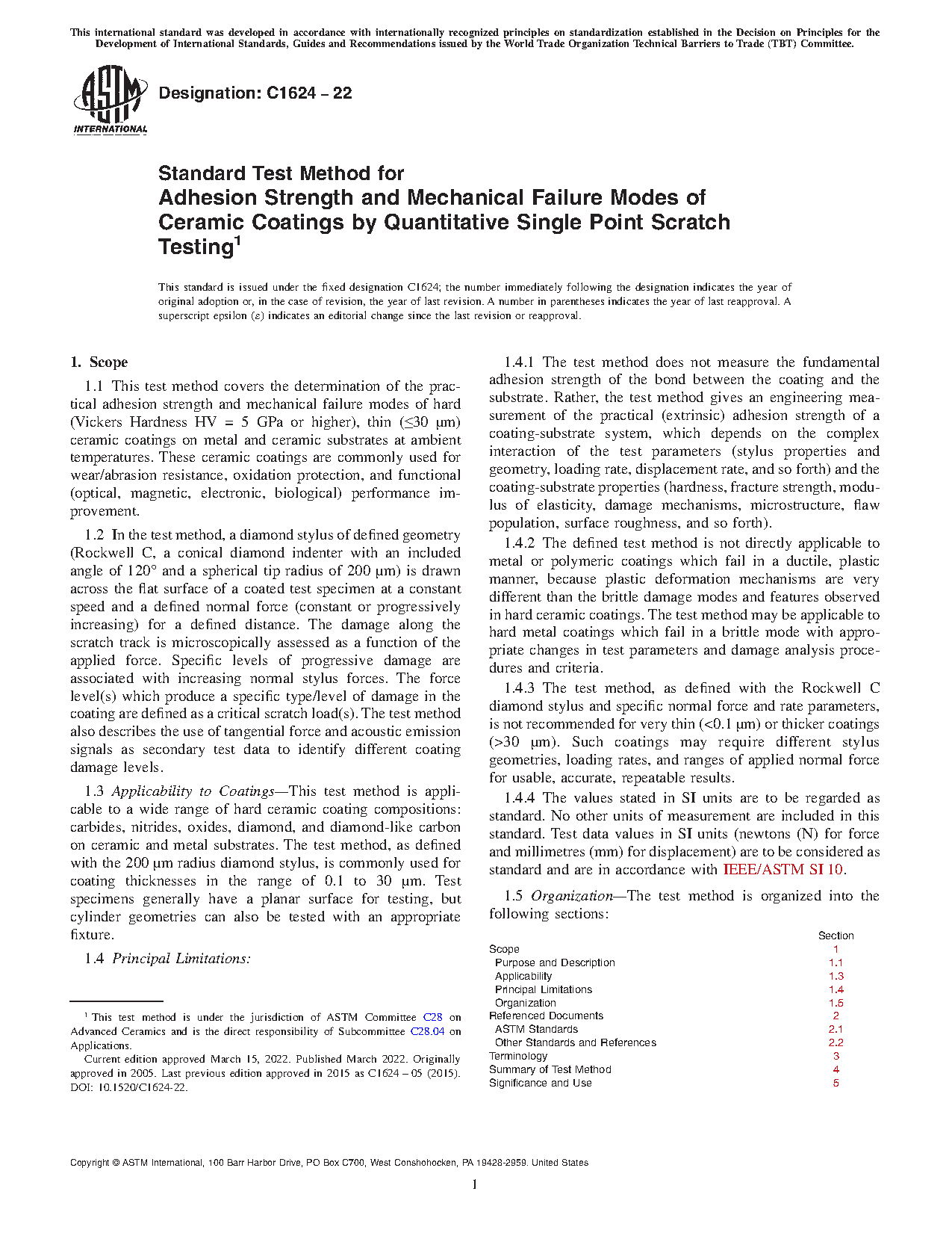 1.1 This test method covers the determination of the practical adhesion strength and mechanical failure modes of hard (Vickers Hardness HV = 5 GPa or higher), thin (≤30 μm) ceramic coatings on metal and ceramic substrates at ambient temperatures. These ceramic coatings are commonly used for wear/abrasion resistance, oxidation protection, and functional (optical, magnetic, electronic, biological) performance improvement.
