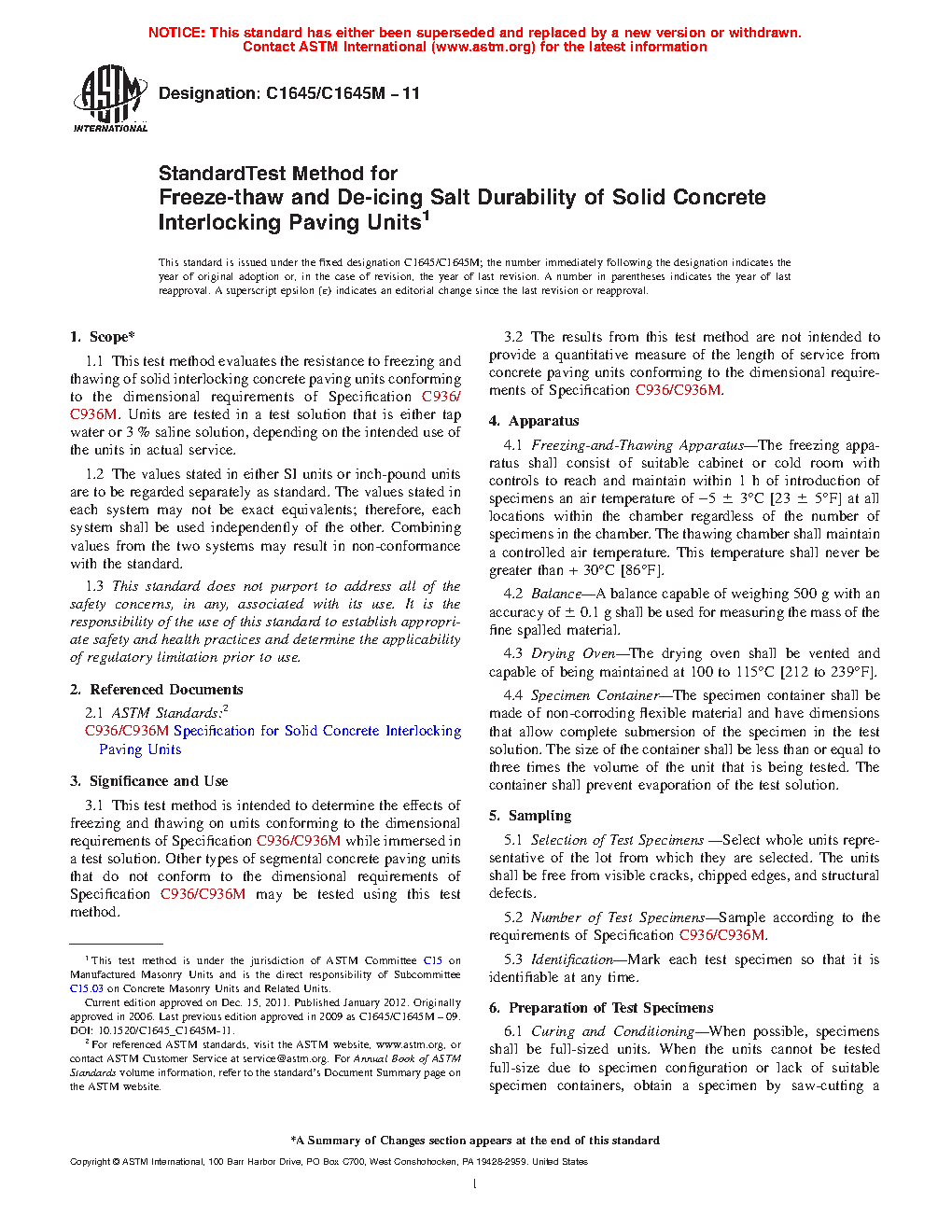 3.1 This test method is intended to determine the effects of freezing and thawing on units conforming to the dimensional requirements of Specification C936/C936M while immersed in a test solution. Other types of segmental concrete paving units that do not conform to the dimensional requirements of Specification C936/C936M may be tested using this test method.