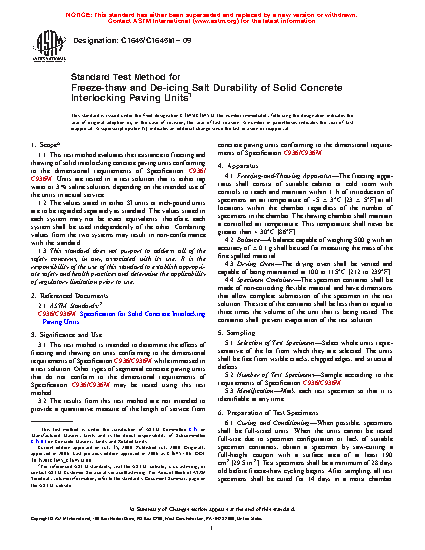 1.1 This test method evaluates the resistance to freezing and thawing of solid interlocking concrete paving units conforming to the dimensional requirements of Specification C936/C936M. Units are tested in a test solution that is either tap water or 3 % saline solution, depending on the intended use of the units in actual service.