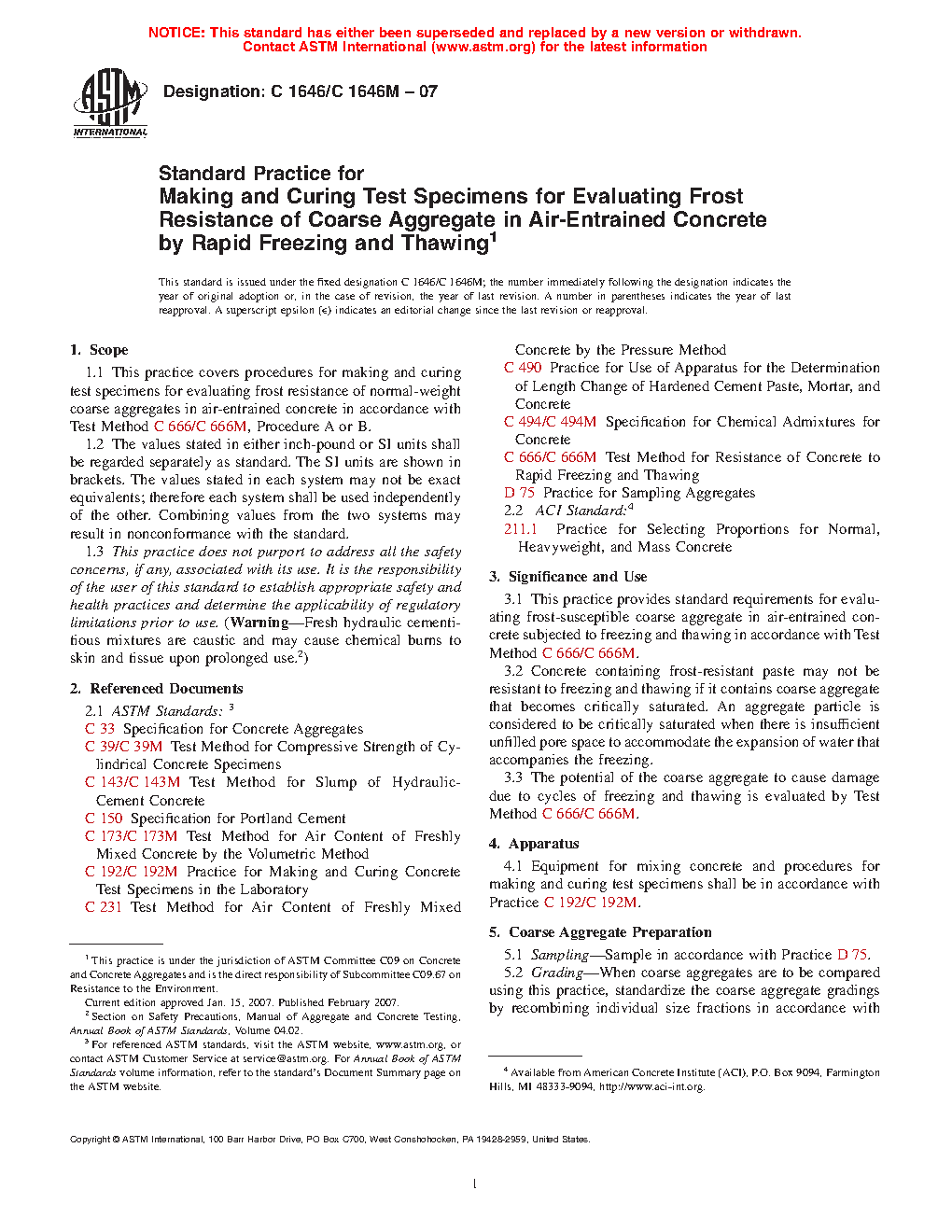 This practice provides standard requirements for evaluating frost-susceptible coarse aggregate in air-entrained concrete subjected to freezing and thawing in accordance with Test Method C 666/C 666M