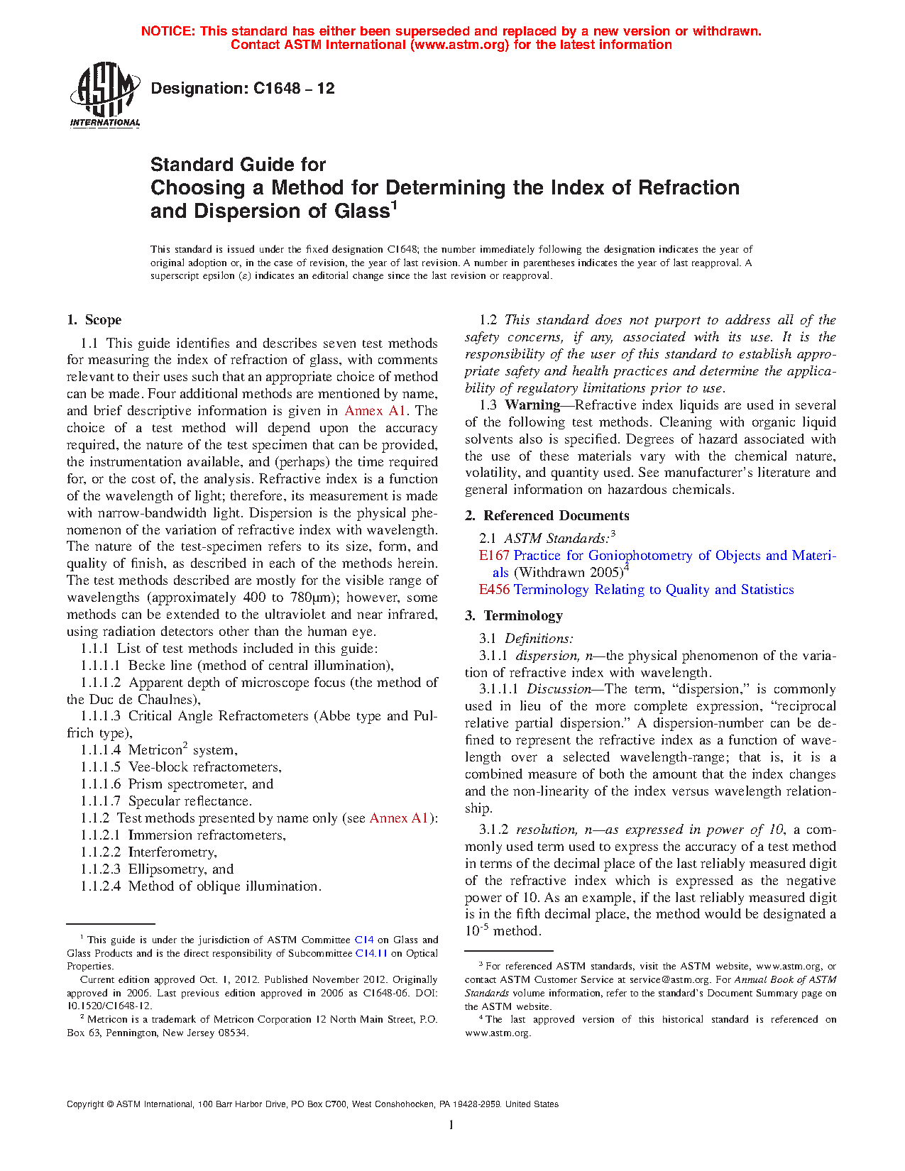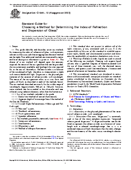 1.1 This guide identifies and describes seven test methods for measuring the index of refraction of glass, with comments relevant to their uses such that an appropriate choice of method can be made. Four additional methods are mentioned by name, and brief descriptive information is given in Annex A1. The choice of a test method will depend upon the accuracy required, the nature of the test specimen that can be provided, the instrumentation available, and (perhaps) the time required for, or the cost of, the analysis. Refractive index is a function of the wavelength of light; therefore, its measurement is made with narrow-bandwidth light. Dispersion is the physical phenomenon of the variation of refractive index with wavelength. The nature of the test-specimen refers to its size, form, and quality of finish, as described in each of the methods herein. The test methods described are mostly for the visible range of wavelengths (approximately 400 to 780m); however, some methods can be extended to the ultraviolet and near infrared, using radiation detectors other than the human eye.