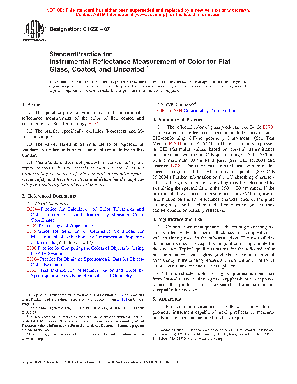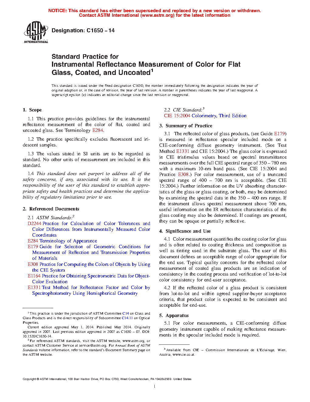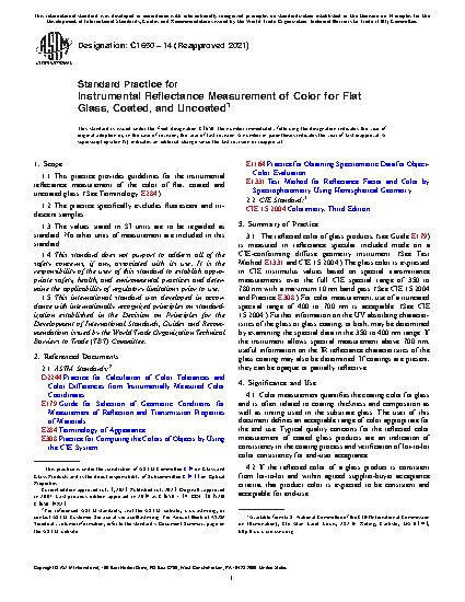 1.1 This practice provides guidelines for the instrumental reflectance measurement of the color of flat, coated and uncoated glass. (See Terminology E284.)
